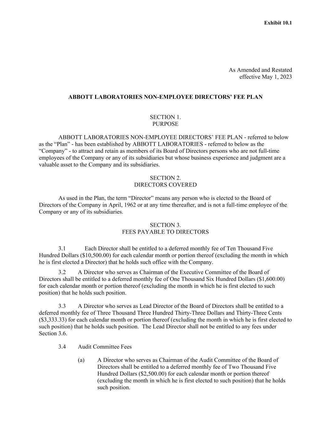 Exhibit 10.1 As Amended and Restated effective May 1, 2023 ABBOTT LABORATORIES NON-EMPLOYEE DIRECTORS’ FEE PLAN SECTION 1. PURPOSE ABBOTT LABORATORIES NON-EMPLOYEE DIRECTORS’ FEE PLAN - referred to below as the “Plan” - has been established by ABBOTT LABORATORIES - referred to below as the “Company” - to attract and retain as members of its Board of Directors persons who are not full-time employees of the Company or any of its subsidiaries but whose business experience and judgment are a valuable asset to the Company and its subsidiaries. SECTION 2. DIRECTORS COVERED As used in the Plan, the term “Director” means any person who is elected to the Board of Directors of the Company in April, 1962 or at any time thereafter, and is not a full-time employee of the Company or any of its subsidiaries. SECTION 3. FEES PAYABLE TO DIRECTORS 3.1 Each Director shall be entitled to a deferred monthly fee of Ten Thousand Five Hundred Dollars ($10,500.00) for each calendar month or portion thereof (excluding the month in which he is first elected a Director) that he holds such office with the Company. 3.2 A Director who serves as Chairman of the Executive Committee of the Board of Directors shall be entitled to a deferred monthly fee of One Thousand Six Hundred Dollars ($1,600.00) for each calendar month or portion thereof (excluding the month in which he is first elected to such position) that he holds such position. 3.3 A Director who serves as Lead Director of the Board of Directors shall be entitled to a deferred monthly fee of Three Thousand Three Hundred Thirty-Three Dollars and Thirty-Three Cents ($3,333.33) for each calendar month or portion thereof (excluding the month in which he is first elected to such position) that he holds such position. The Lead Director shall not be entitled to any fees under Section 3.6. 3.4 Audit Committee Fees (a) A Director who serves as Chairman of the Audit Committee of the Board of Directors shall be entitled to a deferred monthly fee of Two Thousand Five Hundred Dollars ($2,500.00) for each calendar month or portion thereof (excluding the month in which he is first elected to such position) that he holds such position.
