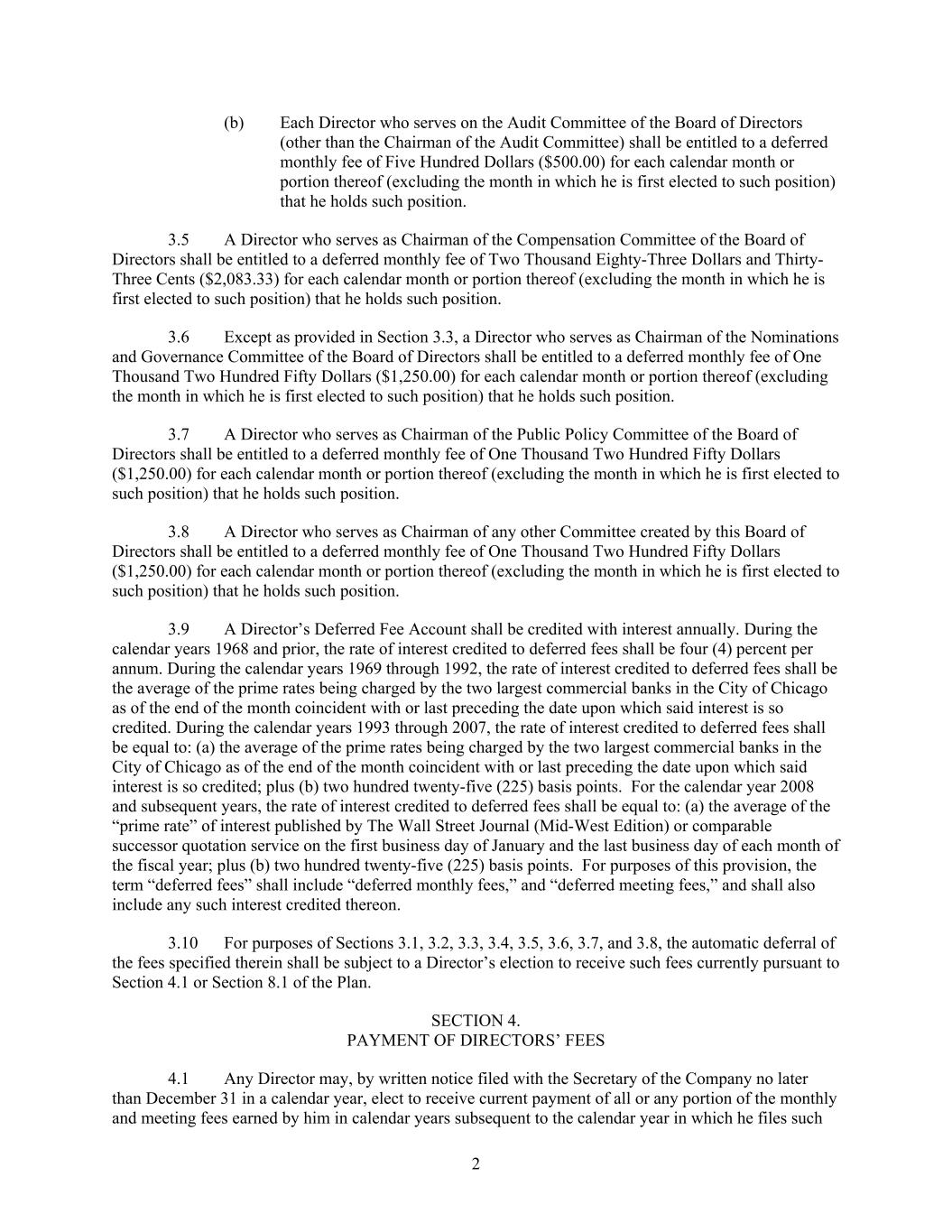 2 (b) Each Director who serves on the Audit Committee of the Board of Directors (other than the Chairman of the Audit Committee) shall be entitled to a deferred monthly fee of Five Hundred Dollars ($500.00) for each calendar month or portion thereof (excluding the month in which he is first elected to such position) that he holds such position. 3.5 A Director who serves as Chairman of the Compensation Committee of the Board of Directors shall be entitled to a deferred monthly fee of Two Thousand Eighty-Three Dollars and Thirty- Three Cents ($2,083.33) for each calendar month or portion thereof (excluding the month in which he is first elected to such position) that he holds such position. 3.6 Except as provided in Section 3.3, a Director who serves as Chairman of the Nominations and Governance Committee of the Board of Directors shall be entitled to a deferred monthly fee of One Thousand Two Hundred Fifty Dollars ($1,250.00) for each calendar month or portion thereof (excluding the month in which he is first elected to such position) that he holds such position. 3.7 A Director who serves as Chairman of the Public Policy Committee of the Board of Directors shall be entitled to a deferred monthly fee of One Thousand Two Hundred Fifty Dollars ($1,250.00) for each calendar month or portion thereof (excluding the month in which he is first elected to such position) that he holds such position. 3.8 A Director who serves as Chairman of any other Committee created by this Board of Directors shall be entitled to a deferred monthly fee of One Thousand Two Hundred Fifty Dollars ($1,250.00) for each calendar month or portion thereof (excluding the month in which he is first elected to such position) that he holds such position. 3.9 A Director’s Deferred Fee Account shall be credited with interest annually. During the calendar years 1968 and prior, the rate of interest credited to deferred fees shall be four (4) percent per annum. During the calendar years 1969 through 1992, the rate of interest credited to deferred fees shall be the average of the prime rates being charged by the two largest commercial banks in the City of Chicago as of the end of the month coincident with or last preceding the date upon which said interest is so credited. During the calendar years 1993 through 2007, the rate of interest credited to deferred fees shall be equal to: (a) the average of the prime rates being charged by the two largest commercial banks in the City of Chicago as of the end of the month coincident with or last preceding the date upon which said interest is so credited; plus (b) two hundred twenty-five (225) basis points. For the calendar year 2008 and subsequent years, the rate of interest credited to deferred fees shall be equal to: (a) the average of the “prime rate” of interest published by The Wall Street Journal (Mid-West Edition) or comparable successor quotation service on the first business day of January and the last business day of each month of the fiscal year; plus (b) two hundred twenty-five (225) basis points. For purposes of this provision, the term “deferred fees” shall include “deferred monthly fees,” and “deferred meeting fees,” and shall also include any such interest credited thereon. 3.10 For purposes of Sections 3.1, 3.2, 3.3, 3.4, 3.5, 3.6, 3.7, and 3.8, the automatic deferral of the fees specified therein shall be subject to a Director’s election to receive such fees currently pursuant to Section 4.1 or Section 8.1 of the Plan. SECTION 4. PAYMENT OF DIRECTORS’ FEES 4.1 Any Director may, by written notice filed with the Secretary of the Company no later than December 31 in a calendar year, elect to receive current payment of all or any portion of the monthly and meeting fees earned by him in calendar years subsequent to the calendar year in which he files such