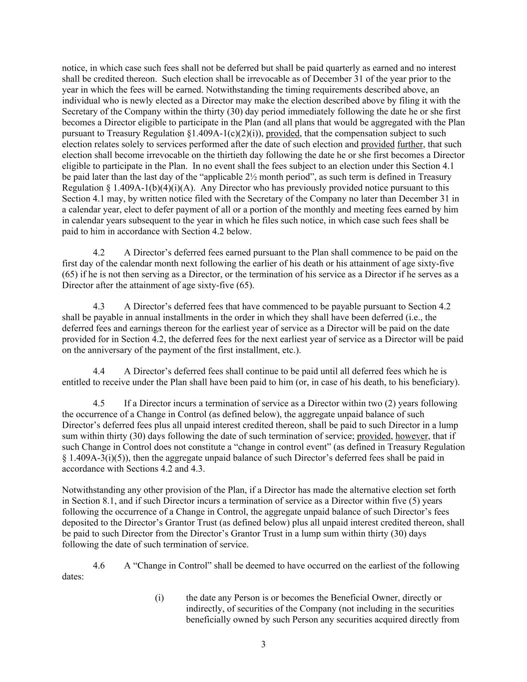 3 notice, in which case such fees shall not be deferred but shall be paid quarterly as earned and no interest shall be credited thereon. Such election shall be irrevocable as of December 31 of the year prior to the year in which the fees will be earned. Notwithstanding the timing requirements described above, an individual who is newly elected as a Director may make the election described above by filing it with the Secretary of the Company within the thirty (30) day period immediately following the date he or she first becomes a Director eligible to participate in the Plan (and all plans that would be aggregated with the Plan pursuant to Treasury Regulation §1.409A-1(c)(2)(i)), provided, that the compensation subject to such election relates solely to services performed after the date of such election and provided further, that such election shall become irrevocable on the thirtieth day following the date he or she first becomes a Director eligible to participate in the Plan. In no event shall the fees subject to an election under this Section 4.1 be paid later than the last day of the “applicable 2½ month period”, as such term is defined in Treasury Regulation § 1.409A-1(b)(4)(i)(A). Any Director who has previously provided notice pursuant to this Section 4.1 may, by written notice filed with the Secretary of the Company no later than December 31 in a calendar year, elect to defer payment of all or a portion of the monthly and meeting fees earned by him in calendar years subsequent to the year in which he files such notice, in which case such fees shall be paid to him in accordance with Section 4.2 below. 4.2 A Director’s deferred fees earned pursuant to the Plan shall commence to be paid on the first day of the calendar month next following the earlier of his death or his attainment of age sixty-five (65) if he is not then serving as a Director, or the termination of his service as a Director if he serves as a Director after the attainment of age sixty-five (65). 4.3 A Director’s deferred fees that have commenced to be payable pursuant to Section 4.2 shall be payable in annual installments in the order in which they shall have been deferred (i.e., the deferred fees and earnings thereon for the earliest year of service as a Director will be paid on the date provided for in Section 4.2, the deferred fees for the next earliest year of service as a Director will be paid on the anniversary of the payment of the first installment, etc.). 4.4 A Director’s deferred fees shall continue to be paid until all deferred fees which he is entitled to receive under the Plan shall have been paid to him (or, in case of his death, to his beneficiary). 4.5 If a Director incurs a termination of service as a Director within two (2) years following the occurrence of a Change in Control (as defined below), the aggregate unpaid balance of such Director’s deferred fees plus all unpaid interest credited thereon, shall be paid to such Director in a lump sum within thirty (30) days following the date of such termination of service; provided, however, that if such Change in Control does not constitute a “change in control event” (as defined in Treasury Regulation § 1.409A-3(i)(5)), then the aggregate unpaid balance of such Director’s deferred fees shall be paid in accordance with Sections 4.2 and 4.3. Notwithstanding any other provision of the Plan, if a Director has made the alternative election set forth in Section 8.1, and if such Director incurs a termination of service as a Director within five (5) years following the occurrence of a Change in Control, the aggregate unpaid balance of such Director’s fees deposited to the Director’s Grantor Trust (as defined below) plus all unpaid interest credited thereon, shall be paid to such Director from the Director’s Grantor Trust in a lump sum within thirty (30) days following the date of such termination of service. 4.6 A “Change in Control” shall be deemed to have occurred on the earliest of the following dates: (i) the date any Person is or becomes the Beneficial Owner, directly or indirectly, of securities of the Company (not including in the securities beneficially owned by such Person any securities acquired directly from
