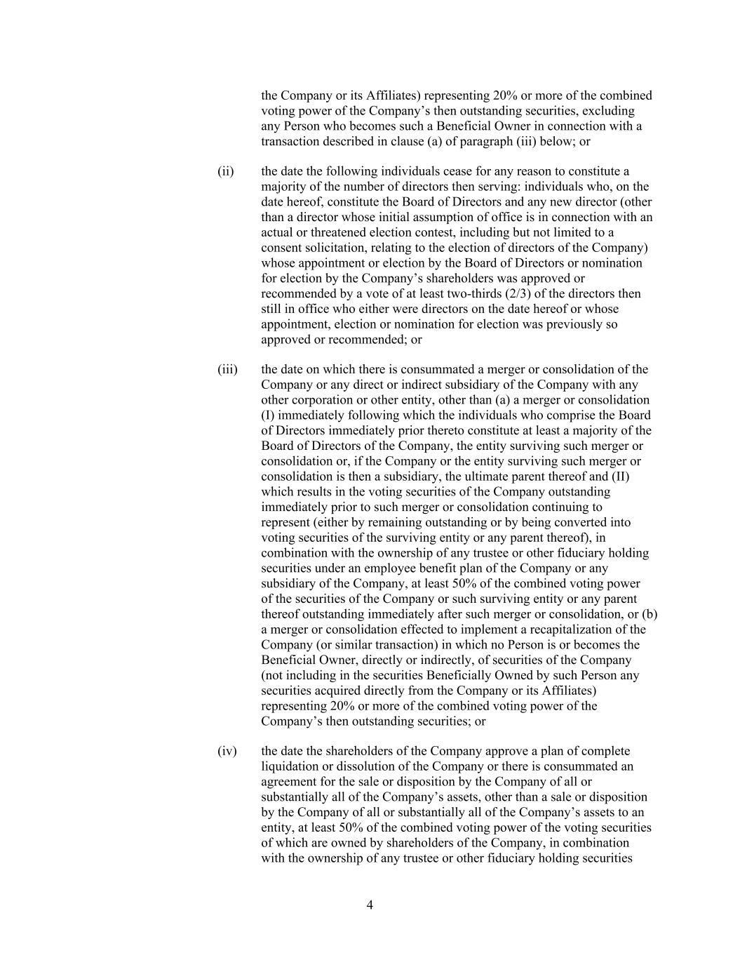 4 the Company or its Affiliates) representing 20% or more of the combined voting power of the Company’s then outstanding securities, excluding any Person who becomes such a Beneficial Owner in connection with a transaction described in clause (a) of paragraph (iii) below; or (ii) the date the following individuals cease for any reason to constitute a majority of the number of directors then serving: individuals who, on the date hereof, constitute the Board of Directors and any new director (other than a director whose initial assumption of office is in connection with an actual or threatened election contest, including but not limited to a consent solicitation, relating to the election of directors of the Company) whose appointment or election by the Board of Directors or nomination for election by the Company’s shareholders was approved or recommended by a vote of at least two-thirds (2/3) of the directors then still in office who either were directors on the date hereof or whose appointment, election or nomination for election was previously so approved or recommended; or (iii) the date on which there is consummated a merger or consolidation of the Company or any direct or indirect subsidiary of the Company with any other corporation or other entity, other than (a) a merger or consolidation (I) immediately following which the individuals who comprise the Board of Directors immediately prior thereto constitute at least a majority of the Board of Directors of the Company, the entity surviving such merger or consolidation or, if the Company or the entity surviving such merger or consolidation is then a subsidiary, the ultimate parent thereof and (II) which results in the voting securities of the Company outstanding immediately prior to such merger or consolidation continuing to represent (either by remaining outstanding or by being converted into voting securities of the surviving entity or any parent thereof), in combination with the ownership of any trustee or other fiduciary holding securities under an employee benefit plan of the Company or any subsidiary of the Company, at least 50% of the combined voting power of the securities of the Company or such surviving entity or any parent thereof outstanding immediately after such merger or consolidation, or (b) a merger or consolidation effected to implement a recapitalization of the Company (or similar transaction) in which no Person is or becomes the Beneficial Owner, directly or indirectly, of securities of the Company (not including in the securities Beneficially Owned by such Person any securities acquired directly from the Company or its Affiliates) representing 20% or more of the combined voting power of the Company’s then outstanding securities; or (iv) the date the shareholders of the Company approve a plan of complete liquidation or dissolution of the Company or there is consummated an agreement for the sale or disposition by the Company of all or substantially all of the Company’s assets, other than a sale or disposition by the Company of all or substantially all of the Company’s assets to an entity, at least 50% of the combined voting power of the voting securities of which are owned by shareholders of the Company, in combination with the ownership of any trustee or other fiduciary holding securities