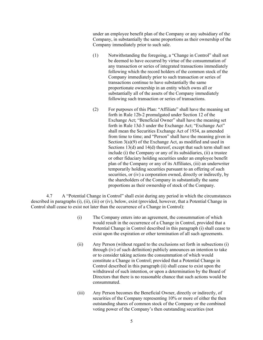 5 under an employee benefit plan of the Company or any subsidiary of the Company, in substantially the same proportions as their ownership of the Company immediately prior to such sale. (1) Notwithstanding the foregoing, a “Change in Control” shall not be deemed to have occurred by virtue of the consummation of any transaction or series of integrated transactions immediately following which the record holders of the common stock of the Company immediately prior to such transaction or series of transactions continue to have substantially the same proportionate ownership in an entity which owns all or substantially all of the assets of the Company immediately following such transaction or series of transactions. (2) For purposes of this Plan: “Affiliate” shall have the meaning set forth in Rule 12b-2 promulgated under Section 12 of the Exchange Act; “Beneficial Owner” shall have the meaning set forth in Rule 13d-3 under the Exchange Act; “Exchange Act” shall mean the Securities Exchange Act of 1934, as amended from time to time; and “Person” shall have the meaning given in Section 3(a)(9) of the Exchange Act, as modified and used in Sections 13(d) and 14(d) thereof, except that such term shall not include (i) the Company or any of its subsidiaries, (ii) a trustee or other fiduciary holding securities under an employee benefit plan of the Company or any of its Affiliates, (iii) an underwriter temporarily holding securities pursuant to an offering of such securities, or (iv) a corporation owned, directly or indirectly, by the shareholders of the Company in substantially the same proportions as their ownership of stock of the Company. 4.7 A “Potential Change in Control” shall exist during any period in which the circumstances described in paragraphs (i), (ii), (iii) or (iv), below, exist (provided, however, that a Potential Change in Control shall cease to exist not later than the occurrence of a Change in Control): (i) The Company enters into an agreement, the consummation of which would result in the occurrence of a Change in Control, provided that a Potential Change in Control described in this paragraph (i) shall cease to exist upon the expiration or other termination of all such agreements. (ii) Any Person (without regard to the exclusions set forth in subsections (i) through (iv) of such definition) publicly announces an intention to take or to consider taking actions the consummation of which would constitute a Change in Control; provided that a Potential Change in Control described in this paragraph (ii) shall cease to exist upon the withdrawal of such intention, or upon a determination by the Board of Directors that there is no reasonable chance that such actions would be consummated. (iii) Any Person becomes the Beneficial Owner, directly or indirectly, of securities of the Company representing 10% or more of either the then outstanding shares of common stock of the Company or the combined voting power of the Company’s then outstanding securities (not