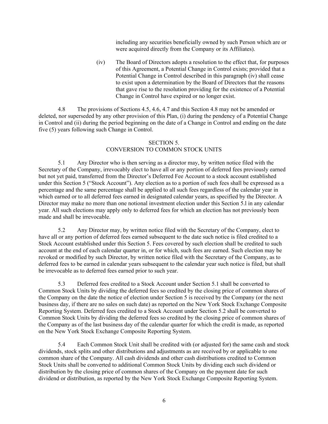 6 including any securities beneficially owned by such Person which are or were acquired directly from the Company or its Affiliates). (iv) The Board of Directors adopts a resolution to the effect that, for purposes of this Agreement, a Potential Change in Control exists; provided that a Potential Change in Control described in this paragraph (iv) shall cease to exist upon a determination by the Board of Directors that the reasons that gave rise to the resolution providing for the existence of a Potential Change in Control have expired or no longer exist. 4.8 The provisions of Sections 4.5, 4.6, 4.7 and this Section 4.8 may not be amended or deleted, nor superseded by any other provision of this Plan, (i) during the pendency of a Potential Change in Control and (ii) during the period beginning on the date of a Change in Control and ending on the date five (5) years following such Change in Control. SECTION 5. CONVERSION TO COMMON STOCK UNITS 5.1 Any Director who is then serving as a director may, by written notice filed with the Secretary of the Company, irrevocably elect to have all or any portion of deferred fees previously earned but not yet paid, transferred from the Director’s Deferred Fee Account to a stock account established under this Section 5 (“Stock Account”). Any election as to a portion of such fees shall be expressed as a percentage and the same percentage shall be applied to all such fees regardless of the calendar year in which earned or to all deferred fees earned in designated calendar years, as specified by the Director. A Director may make no more than one notional investment election under this Section 5.l in any calendar year. All such elections may apply only to deferred fees for which an election has not previously been made and shall be irrevocable. 5.2 Any Director may, by written notice filed with the Secretary of the Company, elect to have all or any portion of deferred fees earned subsequent to the date such notice is filed credited to a Stock Account established under this Section 5. Fees covered by such election shall be credited to such account at the end of each calendar quarter in, or for which, such fees are earned. Such election may be revoked or modified by such Director, by written notice filed with the Secretary of the Company, as to deferred fees to be earned in calendar years subsequent to the calendar year such notice is filed, but shall be irrevocable as to deferred fees earned prior to such year. 5.3 Deferred fees credited to a Stock Account under Section 5.1 shall be converted to Common Stock Units by dividing the deferred fees so credited by the closing price of common shares of the Company on the date the notice of election under Section 5 is received by the Company (or the next business day, if there are no sales on such date) as reported on the New York Stock Exchange Composite Reporting System. Deferred fees credited to a Stock Account under Section 5.2 shall be converted to Common Stock Units by dividing the deferred fees so credited by the closing price of common shares of the Company as of the last business day of the calendar quarter for which the credit is made, as reported on the New York Stock Exchange Composite Reporting System. 5.4 Each Common Stock Unit shall be credited with (or adjusted for) the same cash and stock dividends, stock splits and other distributions and adjustments as are received by or applicable to one common share of the Company. All cash dividends and other cash distributions credited to Common Stock Units shall be converted to additional Common Stock Units by dividing each such dividend or distribution by the closing price of common shares of the Company on the payment date for such dividend or distribution, as reported by the New York Stock Exchange Composite Reporting System.
