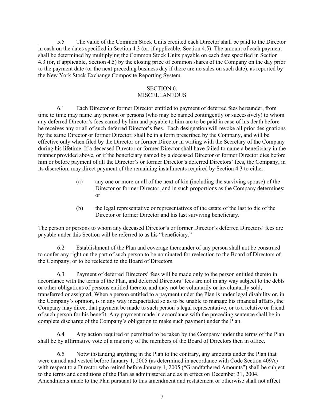7 5.5 The value of the Common Stock Units credited each Director shall be paid to the Director in cash on the dates specified in Section 4.3 (or, if applicable, Section 4.5). The amount of each payment shall be determined by multiplying the Common Stock Units payable on each date specified in Section 4.3 (or, if applicable, Section 4.5) by the closing price of common shares of the Company on the day prior to the payment date (or the next preceding business day if there are no sales on such date), as reported by the New York Stock Exchange Composite Reporting System. SECTION 6. MISCELLANEOUS 6.1 Each Director or former Director entitled to payment of deferred fees hereunder, from time to time may name any person or persons (who may be named contingently or successively) to whom any deferred Director’s fees earned by him and payable to him are to be paid in case of his death before he receives any or all of such deferred Director’s fees. Each designation will revoke all prior designations by the same Director or former Director, shall be in a form prescribed by the Company, and will be effective only when filed by the Director or former Director in writing with the Secretary of the Company during his lifetime. If a deceased Director or former Director shall have failed to name a beneficiary in the manner provided above, or if the beneficiary named by a deceased Director or former Director dies before him or before payment of all the Director’s or former Director’s deferred Directors’ fees, the Company, in its discretion, may direct payment of the remaining installments required by Section 4.3 to either: (a) any one or more or all of the next of kin (including the surviving spouse) of the Director or former Director, and in such proportions as the Company determines; or (b) the legal representative or representatives of the estate of the last to die of the Director or former Director and his last surviving beneficiary. The person or persons to whom any deceased Director’s or former Director’s deferred Directors’ fees are payable under this Section will be referred to as his “beneficiary.” 6.2 Establishment of the Plan and coverage thereunder of any person shall not be construed to confer any right on the part of such person to be nominated for reelection to the Board of Directors of the Company, or to be reelected to the Board of Directors. 6.3 Payment of deferred Directors’ fees will be made only to the person entitled thereto in accordance with the terms of the Plan, and deferred Directors’ fees are not in any way subject to the debts or other obligations of persons entitled thereto, and may not be voluntarily or involuntarily sold, transferred or assigned. When a person entitled to a payment under the Plan is under legal disability or, in the Company’s opinion, is in any way incapacitated so as to be unable to manage his financial affairs, the Company may direct that payment be made to such person’s legal representative, or to a relative or friend of such person for his benefit. Any payment made in accordance with the preceding sentence shall be in complete discharge of the Company’s obligation to make such payment under the Plan. 6.4 Any action required or permitted to be taken by the Company under the terms of the Plan shall be by affirmative vote of a majority of the members of the Board of Directors then in office. 6.5 Notwithstanding anything in the Plan to the contrary, any amounts under the Plan that were earned and vested before January 1, 2005 (as determined in accordance with Code Section 409A) with respect to a Director who retired before January 1, 2005 (“Grandfathered Amounts”) shall be subject to the terms and conditions of the Plan as administered and as in effect on December 31, 2004. Amendments made to the Plan pursuant to this amendment and restatement or otherwise shall not affect