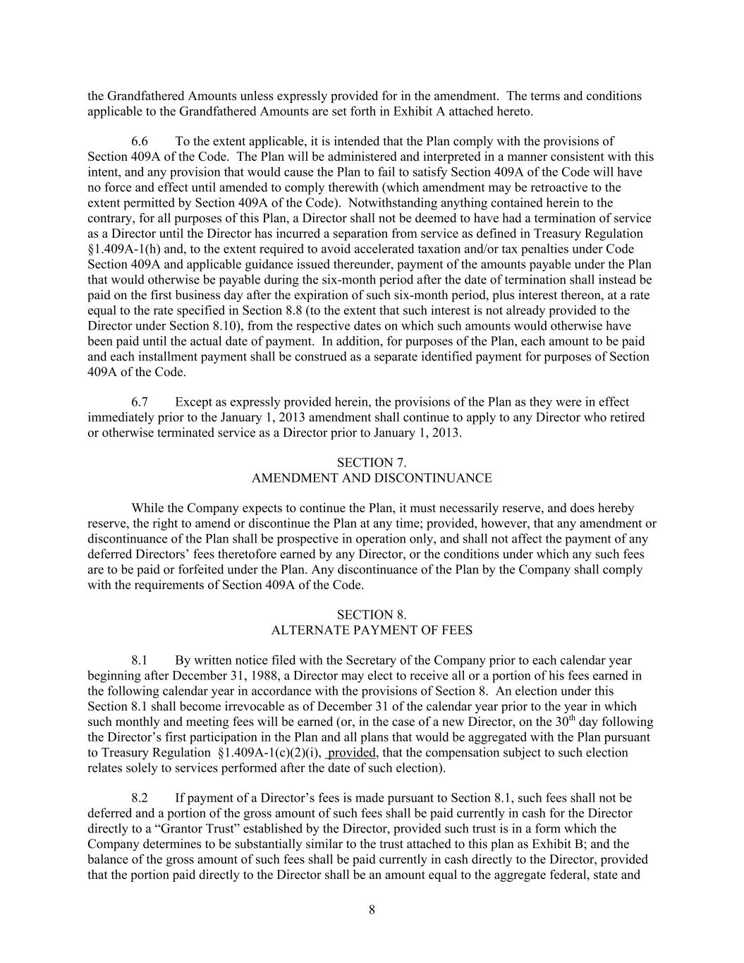 8 the Grandfathered Amounts unless expressly provided for in the amendment. The terms and conditions applicable to the Grandfathered Amounts are set forth in Exhibit A attached hereto. 6.6 To the extent applicable, it is intended that the Plan comply with the provisions of Section 409A of the Code. The Plan will be administered and interpreted in a manner consistent with this intent, and any provision that would cause the Plan to fail to satisfy Section 409A of the Code will have no force and effect until amended to comply therewith (which amendment may be retroactive to the extent permitted by Section 409A of the Code). Notwithstanding anything contained herein to the contrary, for all purposes of this Plan, a Director shall not be deemed to have had a termination of service as a Director until the Director has incurred a separation from service as defined in Treasury Regulation §1.409A-1(h) and, to the extent required to avoid accelerated taxation and/or tax penalties under Code Section 409A and applicable guidance issued thereunder, payment of the amounts payable under the Plan that would otherwise be payable during the six-month period after the date of termination shall instead be paid on the first business day after the expiration of such six-month period, plus interest thereon, at a rate equal to the rate specified in Section 8.8 (to the extent that such interest is not already provided to the Director under Section 8.10), from the respective dates on which such amounts would otherwise have been paid until the actual date of payment. In addition, for purposes of the Plan, each amount to be paid and each installment payment shall be construed as a separate identified payment for purposes of Section 409A of the Code. 6.7 Except as expressly provided herein, the provisions of the Plan as they were in effect immediately prior to the January 1, 2013 amendment shall continue to apply to any Director who retired or otherwise terminated service as a Director prior to January 1, 2013. SECTION 7. AMENDMENT AND DISCONTINUANCE While the Company expects to continue the Plan, it must necessarily reserve, and does hereby reserve, the right to amend or discontinue the Plan at any time; provided, however, that any amendment or discontinuance of the Plan shall be prospective in operation only, and shall not affect the payment of any deferred Directors’ fees theretofore earned by any Director, or the conditions under which any such fees are to be paid or forfeited under the Plan. Any discontinuance of the Plan by the Company shall comply with the requirements of Section 409A of the Code. SECTION 8. ALTERNATE PAYMENT OF FEES 8.1 By written notice filed with the Secretary of the Company prior to each calendar year beginning after December 31, 1988, a Director may elect to receive all or a portion of his fees earned in the following calendar year in accordance with the provisions of Section 8. An election under this Section 8.1 shall become irrevocable as of December 31 of the calendar year prior to the year in which such monthly and meeting fees will be earned (or, in the case of a new Director, on the 30th day following the Director’s first participation in the Plan and all plans that would be aggregated with the Plan pursuant to Treasury Regulation §1.409A-1(c)(2)(i), provided, that the compensation subject to such election relates solely to services performed after the date of such election). 8.2 If payment of a Director’s fees is made pursuant to Section 8.1, such fees shall not be deferred and a portion of the gross amount of such fees shall be paid currently in cash for the Director directly to a “Grantor Trust” established by the Director, provided such trust is in a form which the Company determines to be substantially similar to the trust attached to this plan as Exhibit B; and the balance of the gross amount of such fees shall be paid currently in cash directly to the Director, provided that the portion paid directly to the Director shall be an amount equal to the aggregate federal, state and