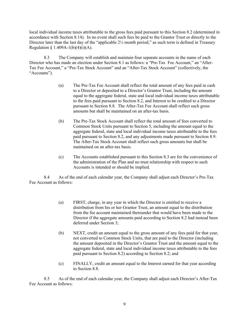 9 local individual income taxes attributable to the gross fees paid pursuant to this Section 8.2 (determined in accordance with Section 8.14). In no event shall such fees be paid to the Grantor Trust or directly to the Director later than the last day of the “applicable 2½ month period,” as such term is defined in Treasury Regulation § 1.409A-1(b)(4)(i)(A). 8.3 The Company will establish and maintain four separate accounts in the name of each Director who has made an election under Section 8.1 as follows: a “Pre-Tax Fee Account,” an “After- Tax Fee Account,” a “Pre-Tax Stock Account” and an “After-Tax Stock Account” (collectively, the “Accounts”). (a) The Pre-Tax Fee Account shall reflect the total amount of any fees paid in cash to a Director or deposited to a Director’s Grantor Trust, including the amount equal to the aggregate federal, state and local individual income taxes attributable to the fees paid pursuant to Section 8.2, and Interest to be credited to a Director pursuant to Section 8.8. The After-Tax Fee Account shall reflect such gross amounts but shall be maintained on an after-tax basis. (b) The Pre-Tax Stock Account shall reflect the total amount of fees converted to Common Stock Units pursuant to Section 5, including the amount equal to the aggregate federal, state and local individual income taxes attributable to the fees paid pursuant to Section 8.2, and any adjustments made pursuant to Section 8.9. The After-Tax Stock Account shall reflect such gross amounts but shall be maintained on an after-tax basis. (c) The Accounts established pursuant to this Section 8.3 are for the convenience of the administration of the Plan and no trust relationship with respect to such Accounts is intended or should be implied. 8.4 As of the end of each calendar year, the Company shall adjust each Director’s Pre-Tax Fee Account as follows: (a) FIRST, charge, in any year in which the Director is entitled to receive a distribution from his or her Grantor Trust, an amount equal to the distribution from the fee account maintained thereunder that would have been made to the Director if the aggregate amounts paid according to Section 8.2 had instead been deferred under Section 3; (b) NEXT, credit an amount equal to the gross amount of any fees paid for that year, not converted to Common Stock Units, that are paid to the Director (including the amount deposited in the Director’s Grantor Trust and the amount equal to the aggregate federal, state and local individual income taxes attributable to the fees paid pursuant to Section 8.2) according to Section 8.2; and (c) FINALLY, credit an amount equal to the Interest earned for that year according to Section 8.8. 8.5 As of the end of each calendar year, the Company shall adjust each Director’s After-Tax Fee Account as follows: