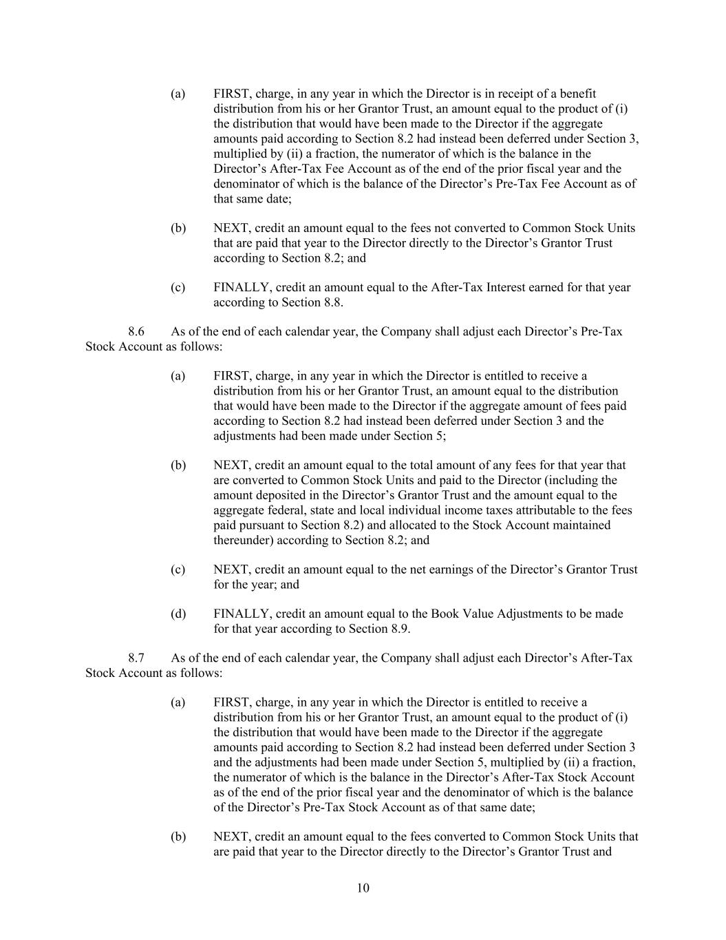 10 (a) FIRST, charge, in any year in which the Director is in receipt of a benefit distribution from his or her Grantor Trust, an amount equal to the product of (i) the distribution that would have been made to the Director if the aggregate amounts paid according to Section 8.2 had instead been deferred under Section 3, multiplied by (ii) a fraction, the numerator of which is the balance in the Director’s After-Tax Fee Account as of the end of the prior fiscal year and the denominator of which is the balance of the Director’s Pre-Tax Fee Account as of that same date; (b) NEXT, credit an amount equal to the fees not converted to Common Stock Units that are paid that year to the Director directly to the Director’s Grantor Trust according to Section 8.2; and (c) FINALLY, credit an amount equal to the After-Tax Interest earned for that year according to Section 8.8. 8.6 As of the end of each calendar year, the Company shall adjust each Director’s Pre-Tax Stock Account as follows: (a) FIRST, charge, in any year in which the Director is entitled to receive a distribution from his or her Grantor Trust, an amount equal to the distribution that would have been made to the Director if the aggregate amount of fees paid according to Section 8.2 had instead been deferred under Section 3 and the adjustments had been made under Section 5; (b) NEXT, credit an amount equal to the total amount of any fees for that year that are converted to Common Stock Units and paid to the Director (including the amount deposited in the Director’s Grantor Trust and the amount equal to the aggregate federal, state and local individual income taxes attributable to the fees paid pursuant to Section 8.2) and allocated to the Stock Account maintained thereunder) according to Section 8.2; and (c) NEXT, credit an amount equal to the net earnings of the Director’s Grantor Trust for the year; and (d) FINALLY, credit an amount equal to the Book Value Adjustments to be made for that year according to Section 8.9. 8.7 As of the end of each calendar year, the Company shall adjust each Director’s After-Tax Stock Account as follows: (a) FIRST, charge, in any year in which the Director is entitled to receive a distribution from his or her Grantor Trust, an amount equal to the product of (i) the distribution that would have been made to the Director if the aggregate amounts paid according to Section 8.2 had instead been deferred under Section 3 and the adjustments had been made under Section 5, multiplied by (ii) a fraction, the numerator of which is the balance in the Director’s After-Tax Stock Account as of the end of the prior fiscal year and the denominator of which is the balance of the Director’s Pre-Tax Stock Account as of that same date; (b) NEXT, credit an amount equal to the fees converted to Common Stock Units that are paid that year to the Director directly to the Director’s Grantor Trust and