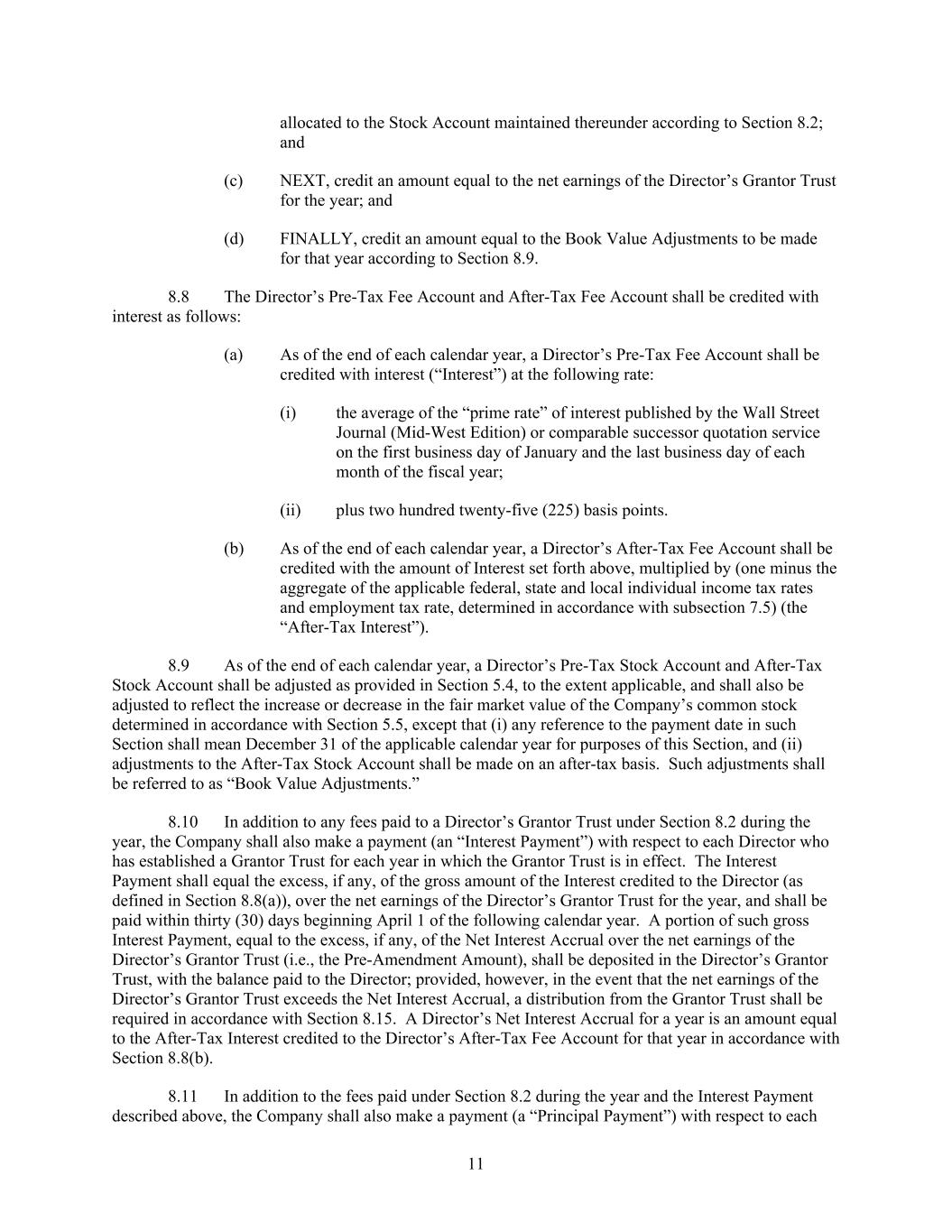 11 allocated to the Stock Account maintained thereunder according to Section 8.2; and (c) NEXT, credit an amount equal to the net earnings of the Director’s Grantor Trust for the year; and (d) FINALLY, credit an amount equal to the Book Value Adjustments to be made for that year according to Section 8.9. 8.8 The Director’s Pre-Tax Fee Account and After-Tax Fee Account shall be credited with interest as follows: (a) As of the end of each calendar year, a Director’s Pre-Tax Fee Account shall be credited with interest (“Interest”) at the following rate: (i) the average of the “prime rate” of interest published by the Wall Street Journal (Mid-West Edition) or comparable successor quotation service on the first business day of January and the last business day of each month of the fiscal year; (ii) plus two hundred twenty-five (225) basis points. (b) As of the end of each calendar year, a Director’s After-Tax Fee Account shall be credited with the amount of Interest set forth above, multiplied by (one minus the aggregate of the applicable federal, state and local individual income tax rates and employment tax rate, determined in accordance with subsection 7.5) (the “After-Tax Interest”). 8.9 As of the end of each calendar year, a Director’s Pre-Tax Stock Account and After-Tax Stock Account shall be adjusted as provided in Section 5.4, to the extent applicable, and shall also be adjusted to reflect the increase or decrease in the fair market value of the Company’s common stock determined in accordance with Section 5.5, except that (i) any reference to the payment date in such Section shall mean December 31 of the applicable calendar year for purposes of this Section, and (ii) adjustments to the After-Tax Stock Account shall be made on an after-tax basis. Such adjustments shall be referred to as “Book Value Adjustments.” 8.10 In addition to any fees paid to a Director’s Grantor Trust under Section 8.2 during the year, the Company shall also make a payment (an “Interest Payment”) with respect to each Director who has established a Grantor Trust for each year in which the Grantor Trust is in effect. The Interest Payment shall equal the excess, if any, of the gross amount of the Interest credited to the Director (as defined in Section 8.8(a)), over the net earnings of the Director’s Grantor Trust for the year, and shall be paid within thirty (30) days beginning April 1 of the following calendar year. A portion of such gross Interest Payment, equal to the excess, if any, of the Net Interest Accrual over the net earnings of the Director’s Grantor Trust (i.e., the Pre-Amendment Amount), shall be deposited in the Director’s Grantor Trust, with the balance paid to the Director; provided, however, in the event that the net earnings of the Director’s Grantor Trust exceeds the Net Interest Accrual, a distribution from the Grantor Trust shall be required in accordance with Section 8.15. A Director’s Net Interest Accrual for a year is an amount equal to the After-Tax Interest credited to the Director’s After-Tax Fee Account for that year in accordance with Section 8.8(b). 8.11 In addition to the fees paid under Section 8.2 during the year and the Interest Payment described above, the Company shall also make a payment (a “Principal Payment”) with respect to each