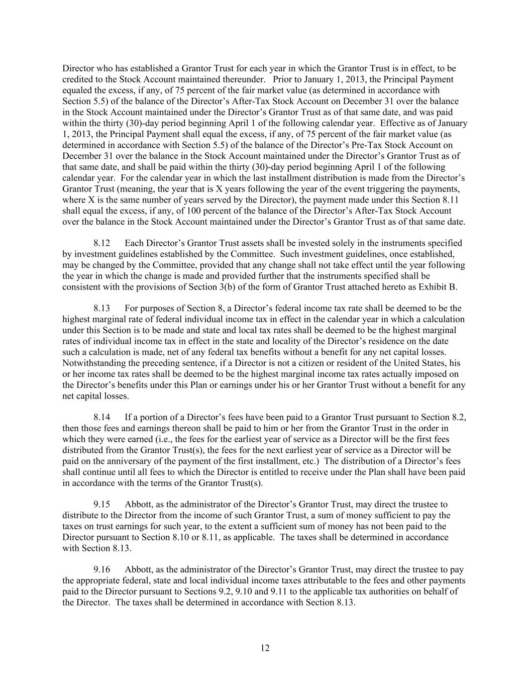 12 Director who has established a Grantor Trust for each year in which the Grantor Trust is in effect, to be credited to the Stock Account maintained thereunder. Prior to January 1, 2013, the Principal Payment equaled the excess, if any, of 75 percent of the fair market value (as determined in accordance with Section 5.5) of the balance of the Director’s After-Tax Stock Account on December 31 over the balance in the Stock Account maintained under the Director’s Grantor Trust as of that same date, and was paid within the thirty (30)-day period beginning April 1 of the following calendar year. Effective as of January 1, 2013, the Principal Payment shall equal the excess, if any, of 75 percent of the fair market value (as determined in accordance with Section 5.5) of the balance of the Director’s Pre-Tax Stock Account on December 31 over the balance in the Stock Account maintained under the Director’s Grantor Trust as of that same date, and shall be paid within the thirty (30)-day period beginning April 1 of the following calendar year. For the calendar year in which the last installment distribution is made from the Director’s Grantor Trust (meaning, the year that is X years following the year of the event triggering the payments, where X is the same number of years served by the Director), the payment made under this Section 8.11 shall equal the excess, if any, of 100 percent of the balance of the Director’s After-Tax Stock Account over the balance in the Stock Account maintained under the Director’s Grantor Trust as of that same date. 8.12 Each Director’s Grantor Trust assets shall be invested solely in the instruments specified by investment guidelines established by the Committee. Such investment guidelines, once established, may be changed by the Committee, provided that any change shall not take effect until the year following the year in which the change is made and provided further that the instruments specified shall be consistent with the provisions of Section 3(b) of the form of Grantor Trust attached hereto as Exhibit B. 8.13 For purposes of Section 8, a Director’s federal income tax rate shall be deemed to be the highest marginal rate of federal individual income tax in effect in the calendar year in which a calculation under this Section is to be made and state and local tax rates shall be deemed to be the highest marginal rates of individual income tax in effect in the state and locality of the Director’s residence on the date such a calculation is made, net of any federal tax benefits without a benefit for any net capital losses. Notwithstanding the preceding sentence, if a Director is not a citizen or resident of the United States, his or her income tax rates shall be deemed to be the highest marginal income tax rates actually imposed on the Director’s benefits under this Plan or earnings under his or her Grantor Trust without a benefit for any net capital losses. 8.14 If a portion of a Director’s fees have been paid to a Grantor Trust pursuant to Section 8.2, then those fees and earnings thereon shall be paid to him or her from the Grantor Trust in the order in which they were earned (i.e., the fees for the earliest year of service as a Director will be the first fees distributed from the Grantor Trust(s), the fees for the next earliest year of service as a Director will be paid on the anniversary of the payment of the first installment, etc.) The distribution of a Director’s fees shall continue until all fees to which the Director is entitled to receive under the Plan shall have been paid in accordance with the terms of the Grantor Trust(s). 9.15 Abbott, as the administrator of the Director’s Grantor Trust, may direct the trustee to distribute to the Director from the income of such Grantor Trust, a sum of money sufficient to pay the taxes on trust earnings for such year, to the extent a sufficient sum of money has not been paid to the Director pursuant to Section 8.10 or 8.11, as applicable. The taxes shall be determined in accordance with Section 8.13. 9.16 Abbott, as the administrator of the Director’s Grantor Trust, may direct the trustee to pay the appropriate federal, state and local individual income taxes attributable to the fees and other payments paid to the Director pursuant to Sections 9.2, 9.10 and 9.11 to the applicable tax authorities on behalf of the Director. The taxes shall be determined in accordance with Section 8.13.