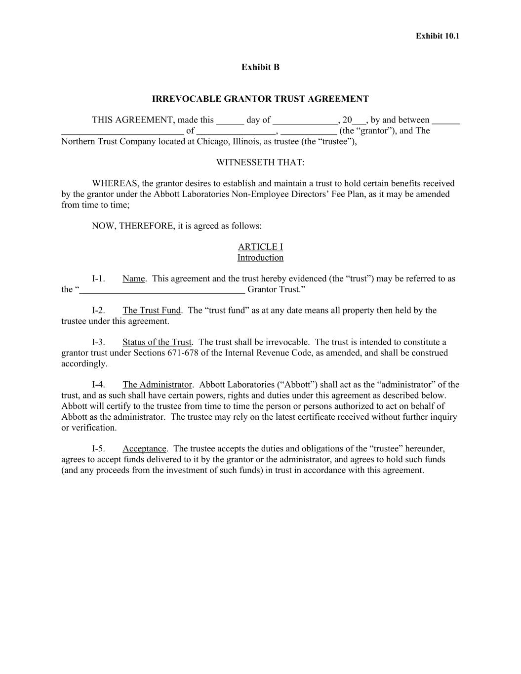 Exhibit 10.1 Exhibit B IRREVOCABLE GRANTOR TRUST AGREEMENT THIS AGREEMENT, made this ______ day of ______________, 20___, by and between of , (the “grantor”), and The Northern Trust Company located at Chicago, Illinois, as trustee (the “trustee”), WITNESSETH THAT: WHEREAS, the grantor desires to establish and maintain a trust to hold certain benefits received by the grantor under the Abbott Laboratories Non-Employee Directors’ Fee Plan, as it may be amended from time to time; NOW, THEREFORE, it is agreed as follows: ARTICLE I Introduction I-1. Name. This agreement and the trust hereby evidenced (the “trust”) may be referred to as the “ Grantor Trust.” I-2. The Trust Fund. The “trust fund” as at any date means all property then held by the trustee under this agreement. I-3. Status of the Trust. The trust shall be irrevocable. The trust is intended to constitute a grantor trust under Sections 671-678 of the Internal Revenue Code, as amended, and shall be construed accordingly. I-4. The Administrator. Abbott Laboratories (“Abbott”) shall act as the “administrator” of the trust, and as such shall have certain powers, rights and duties under this agreement as described below. Abbott will certify to the trustee from time to time the person or persons authorized to act on behalf of Abbott as the administrator. The trustee may rely on the latest certificate received without further inquiry or verification. I-5. Acceptance. The trustee accepts the duties and obligations of the “trustee” hereunder, agrees to accept funds delivered to it by the grantor or the administrator, and agrees to hold such funds (and any proceeds from the investment of such funds) in trust in accordance with this agreement.