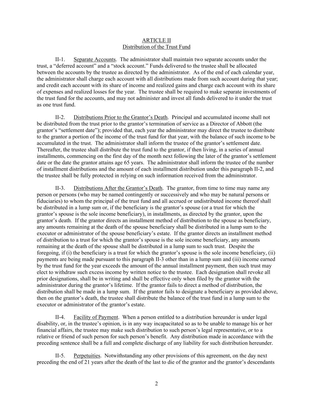 2 ARTICLE II Distribution of the Trust Fund II-1. Separate Accounts. The administrator shall maintain two separate accounts under the trust, a “deferred account” and a “stock account.” Funds delivered to the trustee shall be allocated between the accounts by the trustee as directed by the administrator. As of the end of each calendar year, the administrator shall charge each account with all distributions made from such account during that year; and credit each account with its share of income and realized gains and charge each account with its share of expenses and realized losses for the year. The trustee shall be required to make separate investments of the trust fund for the accounts, and may not administer and invest all funds delivered to it under the trust as one trust fund. II-2. Distributions Prior to the Grantor’s Death. Principal and accumulated income shall not be distributed from the trust prior to the grantor’s termination of service as a Director of Abbott (the grantor’s “settlement date”); provided that, each year the administrator may direct the trustee to distribute to the grantor a portion of the income of the trust fund for that year, with the balance of such income to be accumulated in the trust. The administrator shall inform the trustee of the grantor’s settlement date. Thereafter, the trustee shall distribute the trust fund to the grantor, if then living, in a series of annual installments, commencing on the first day of the month next following the later of the grantor’s settlement date or the date the grantor attains age 65 years. The administrator shall inform the trustee of the number of installment distributions and the amount of each installment distribution under this paragraph II-2, and the trustee shall be fully protected in relying on such information received from the administrator. II-3. Distributions After the Grantor’s Death. The grantor, from time to time may name any person or persons (who may be named contingently or successively and who may be natural persons or fiduciaries) to whom the principal of the trust fund and all accrued or undistributed income thereof shall be distributed in a lump sum or, if the beneficiary is the grantor’s spouse (or a trust for which the grantor’s spouse is the sole income beneficiary), in installments, as directed by the grantor, upon the grantor’s death. If the grantor directs an installment method of distribution to the spouse as beneficiary, any amounts remaining at the death of the spouse beneficiary shall be distributed in a lump sum to the executor or administrator of the spouse beneficiary’s estate. If the grantor directs an installment method of distribution to a trust for which the grantor’s spouse is the sole income beneficiary, any amounts remaining at the death of the spouse shall be distributed in a lump sum to such trust. Despite the foregoing, if (i) the beneficiary is a trust for which the grantor’s spouse is the sole income beneficiary, (ii) payments are being made pursuant to this paragraph II-3 other than in a lump sum and (iii) income earned by the trust fund for the year exceeds the amount of the annual installment payment, then such trust may elect to withdraw such excess income by written notice to the trustee. Each designation shall revoke all prior designations, shall be in writing and shall be effective only when filed by the grantor with the administrator during the grantor’s lifetime. If the grantor fails to direct a method of distribution, the distribution shall be made in a lump sum. If the grantor fails to designate a beneficiary as provided above, then on the grantor’s death, the trustee shall distribute the balance of the trust fund in a lump sum to the executor or administrator of the grantor’s estate. II-4. Facility of Payment. When a person entitled to a distribution hereunder is under legal disability, or, in the trustee’s opinion, is in any way incapacitated so as to be unable to manage his or her financial affairs, the trustee may make such distribution to such person’s legal representative, or to a relative or friend of such person for such person’s benefit. Any distribution made in accordance with the preceding sentence shall be a full and complete discharge of any liability for such distribution hereunder. II-5. Perpetuities. Notwithstanding any other provisions of this agreement, on the day next preceding the end of 21 years after the death of the last to die of the grantor and the grantor’s descendants