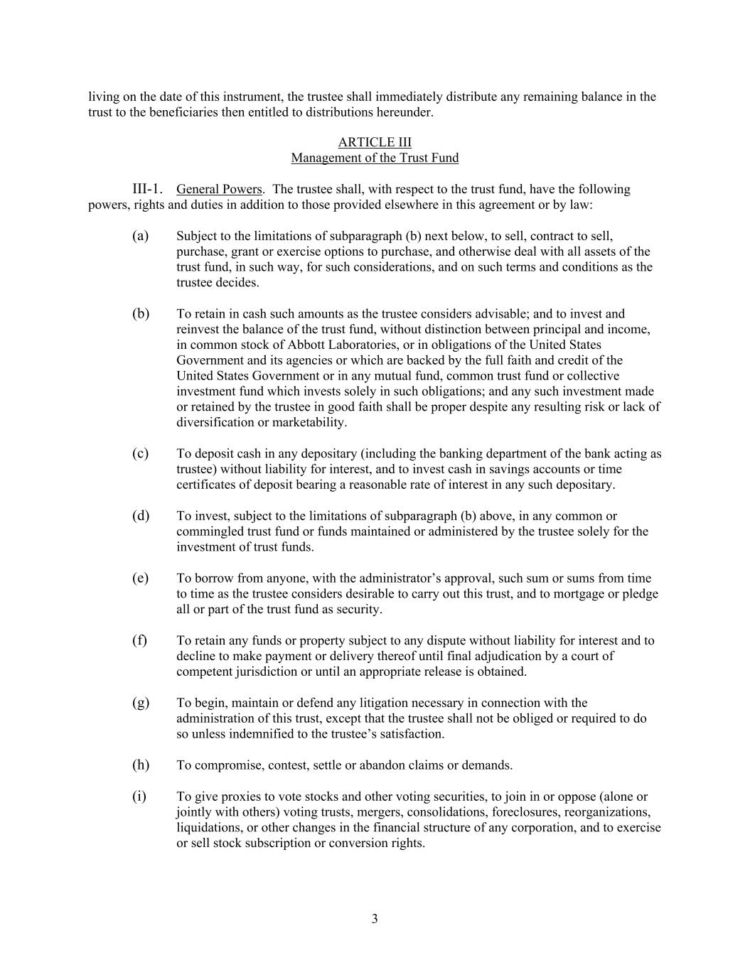 3 living on the date of this instrument, the trustee shall immediately distribute any remaining balance in the trust to the beneficiaries then entitled to distributions hereunder. ARTICLE III Management of the Trust Fund III-1. General Powers. The trustee shall, with respect to the trust fund, have the following powers, rights and duties in addition to those provided elsewhere in this agreement or by law: (a) Subject to the limitations of subparagraph (b) next below, to sell, contract to sell, purchase, grant or exercise options to purchase, and otherwise deal with all assets of the trust fund, in such way, for such considerations, and on such terms and conditions as the trustee decides. (b) To retain in cash such amounts as the trustee considers advisable; and to invest and reinvest the balance of the trust fund, without distinction between principal and income, in common stock of Abbott Laboratories, or in obligations of the United States Government and its agencies or which are backed by the full faith and credit of the United States Government or in any mutual fund, common trust fund or collective investment fund which invests solely in such obligations; and any such investment made or retained by the trustee in good faith shall be proper despite any resulting risk or lack of diversification or marketability. (c) To deposit cash in any depositary (including the banking department of the bank acting as trustee) without liability for interest, and to invest cash in savings accounts or time certificates of deposit bearing a reasonable rate of interest in any such depositary. (d) To invest, subject to the limitations of subparagraph (b) above, in any common or commingled trust fund or funds maintained or administered by the trustee solely for the investment of trust funds. (e) To borrow from anyone, with the administrator’s approval, such sum or sums from time to time as the trustee considers desirable to carry out this trust, and to mortgage or pledge all or part of the trust fund as security. (f) To retain any funds or property subject to any dispute without liability for interest and to decline to make payment or delivery thereof until final adjudication by a court of competent jurisdiction or until an appropriate release is obtained. (g) To begin, maintain or defend any litigation necessary in connection with the administration of this trust, except that the trustee shall not be obliged or required to do so unless indemnified to the trustee’s satisfaction. (h) To compromise, contest, settle or abandon claims or demands. (i) To give proxies to vote stocks and other voting securities, to join in or oppose (alone or jointly with others) voting trusts, mergers, consolidations, foreclosures, reorganizations, liquidations, or other changes in the financial structure of any corporation, and to exercise or sell stock subscription or conversion rights.