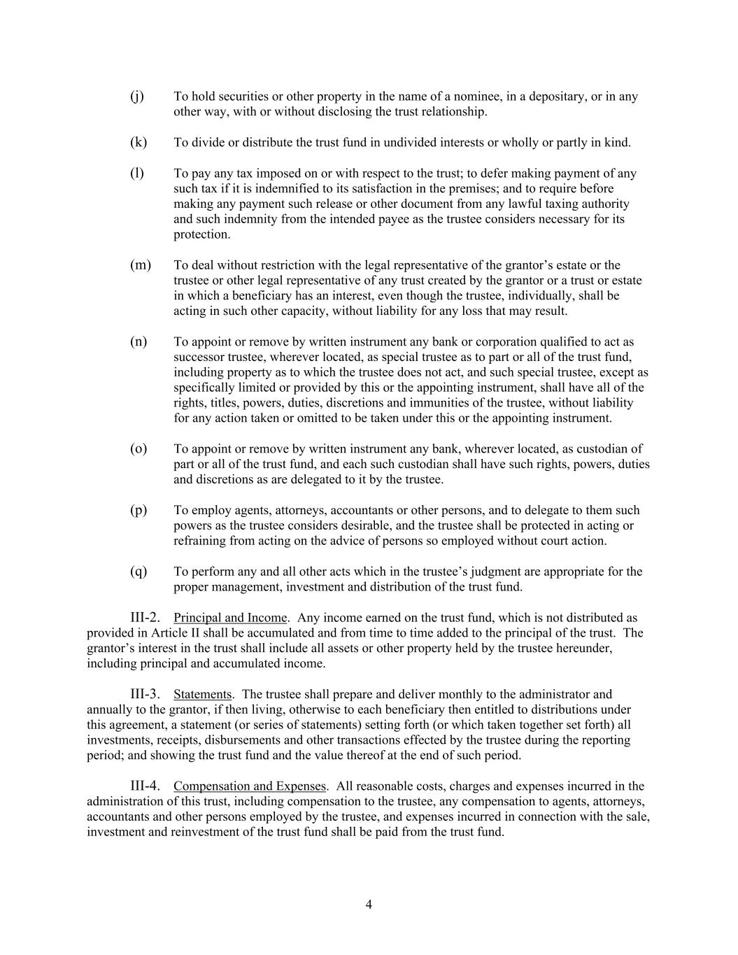 4 (j) To hold securities or other property in the name of a nominee, in a depositary, or in any other way, with or without disclosing the trust relationship. (k) To divide or distribute the trust fund in undivided interests or wholly or partly in kind. (l) To pay any tax imposed on or with respect to the trust; to defer making payment of any such tax if it is indemnified to its satisfaction in the premises; and to require before making any payment such release or other document from any lawful taxing authority and such indemnity from the intended payee as the trustee considers necessary for its protection. (m) To deal without restriction with the legal representative of the grantor’s estate or the trustee or other legal representative of any trust created by the grantor or a trust or estate in which a beneficiary has an interest, even though the trustee, individually, shall be acting in such other capacity, without liability for any loss that may result. (n) To appoint or remove by written instrument any bank or corporation qualified to act as successor trustee, wherever located, as special trustee as to part or all of the trust fund, including property as to which the trustee does not act, and such special trustee, except as specifically limited or provided by this or the appointing instrument, shall have all of the rights, titles, powers, duties, discretions and immunities of the trustee, without liability for any action taken or omitted to be taken under this or the appointing instrument. (o) To appoint or remove by written instrument any bank, wherever located, as custodian of part or all of the trust fund, and each such custodian shall have such rights, powers, duties and discretions as are delegated to it by the trustee. (p) To employ agents, attorneys, accountants or other persons, and to delegate to them such powers as the trustee considers desirable, and the trustee shall be protected in acting or refraining from acting on the advice of persons so employed without court action. (q) To perform any and all other acts which in the trustee’s judgment are appropriate for the proper management, investment and distribution of the trust fund. III-2. Principal and Income. Any income earned on the trust fund, which is not distributed as provided in Article II shall be accumulated and from time to time added to the principal of the trust. The grantor’s interest in the trust shall include all assets or other property held by the trustee hereunder, including principal and accumulated income. III-3. Statements. The trustee shall prepare and deliver monthly to the administrator and annually to the grantor, if then living, otherwise to each beneficiary then entitled to distributions under this agreement, a statement (or series of statements) setting forth (or which taken together set forth) all investments, receipts, disbursements and other transactions effected by the trustee during the reporting period; and showing the trust fund and the value thereof at the end of such period. III-4. Compensation and Expenses. All reasonable costs, charges and expenses incurred in the administration of this trust, including compensation to the trustee, any compensation to agents, attorneys, accountants and other persons employed by the trustee, and expenses incurred in connection with the sale, investment and reinvestment of the trust fund shall be paid from the trust fund.