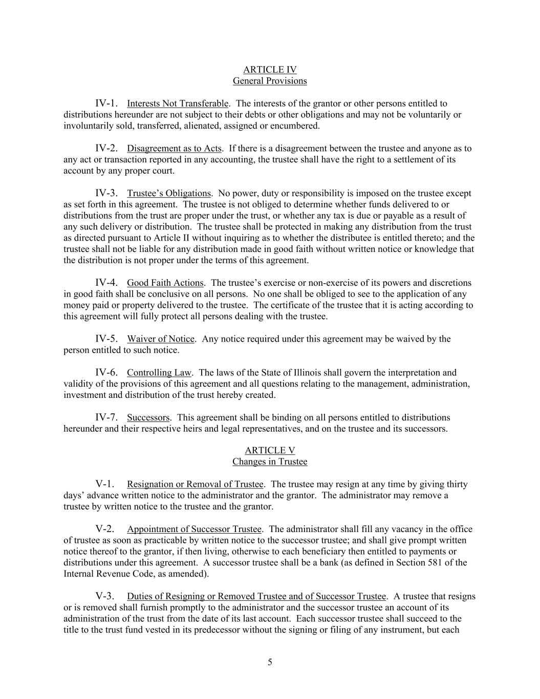 5 ARTICLE IV General Provisions IV-1. Interests Not Transferable. The interests of the grantor or other persons entitled to distributions hereunder are not subject to their debts or other obligations and may not be voluntarily or involuntarily sold, transferred, alienated, assigned or encumbered. IV-2. Disagreement as to Acts. If there is a disagreement between the trustee and anyone as to any act or transaction reported in any accounting, the trustee shall have the right to a settlement of its account by any proper court. IV-3. Trustee’s Obligations. No power, duty or responsibility is imposed on the trustee except as set forth in this agreement. The trustee is not obliged to determine whether funds delivered to or distributions from the trust are proper under the trust, or whether any tax is due or payable as a result of any such delivery or distribution. The trustee shall be protected in making any distribution from the trust as directed pursuant to Article II without inquiring as to whether the distributee is entitled thereto; and the trustee shall not be liable for any distribution made in good faith without written notice or knowledge that the distribution is not proper under the terms of this agreement. IV-4. Good Faith Actions. The trustee’s exercise or non-exercise of its powers and discretions in good faith shall be conclusive on all persons. No one shall be obliged to see to the application of any money paid or property delivered to the trustee. The certificate of the trustee that it is acting according to this agreement will fully protect all persons dealing with the trustee. IV-5. Waiver of Notice. Any notice required under this agreement may be waived by the person entitled to such notice. IV-6. Controlling Law. The laws of the State of Illinois shall govern the interpretation and validity of the provisions of this agreement and all questions relating to the management, administration, investment and distribution of the trust hereby created. IV-7. Successors. This agreement shall be binding on all persons entitled to distributions hereunder and their respective heirs and legal representatives, and on the trustee and its successors. ARTICLE V Changes in Trustee V-1. Resignation or Removal of Trustee. The trustee may resign at any time by giving thirty days’ advance written notice to the administrator and the grantor. The administrator may remove a trustee by written notice to the trustee and the grantor. V-2. Appointment of Successor Trustee. The administrator shall fill any vacancy in the office of trustee as soon as practicable by written notice to the successor trustee; and shall give prompt written notice thereof to the grantor, if then living, otherwise to each beneficiary then entitled to payments or distributions under this agreement. A successor trustee shall be a bank (as defined in Section 581 of the Internal Revenue Code, as amended). V-3. Duties of Resigning or Removed Trustee and of Successor Trustee. A trustee that resigns or is removed shall furnish promptly to the administrator and the successor trustee an account of its administration of the trust from the date of its last account. Each successor trustee shall succeed to the title to the trust fund vested in its predecessor without the signing or filing of any instrument, but each