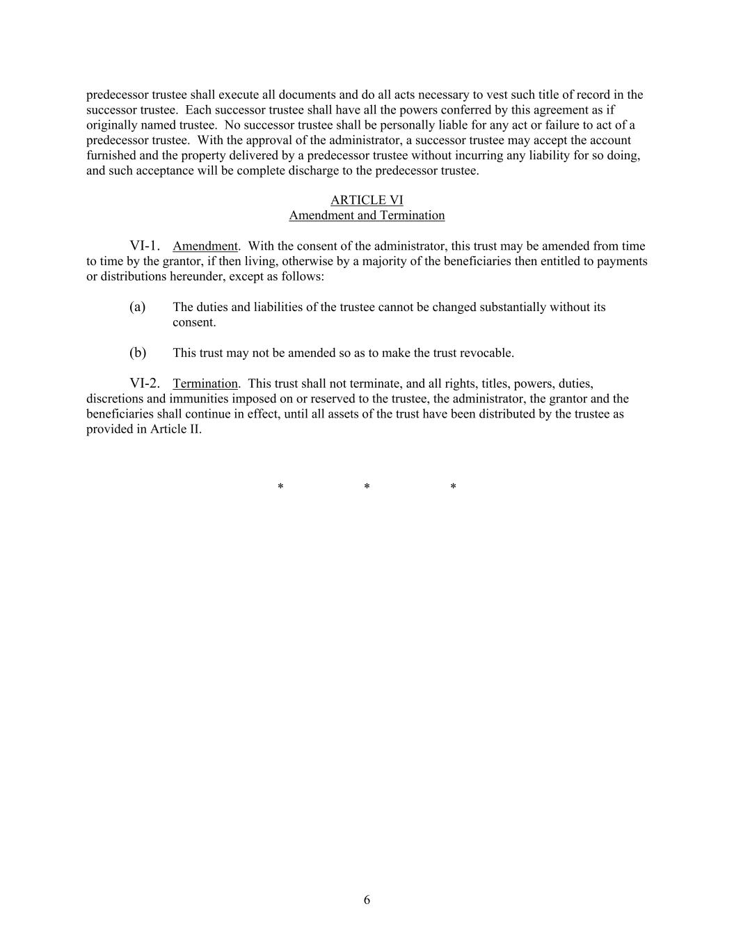 6 predecessor trustee shall execute all documents and do all acts necessary to vest such title of record in the successor trustee. Each successor trustee shall have all the powers conferred by this agreement as if originally named trustee. No successor trustee shall be personally liable for any act or failure to act of a predecessor trustee. With the approval of the administrator, a successor trustee may accept the account furnished and the property delivered by a predecessor trustee without incurring any liability for so doing, and such acceptance will be complete discharge to the predecessor trustee. ARTICLE VI Amendment and Termination VI-1. Amendment. With the consent of the administrator, this trust may be amended from time to time by the grantor, if then living, otherwise by a majority of the beneficiaries then entitled to payments or distributions hereunder, except as follows: (a) The duties and liabilities of the trustee cannot be changed substantially without its consent. (b) This trust may not be amended so as to make the trust revocable. VI-2. Termination. This trust shall not terminate, and all rights, titles, powers, duties, discretions and immunities imposed on or reserved to the trustee, the administrator, the grantor and the beneficiaries shall continue in effect, until all assets of the trust have been distributed by the trustee as provided in Article II. * * *