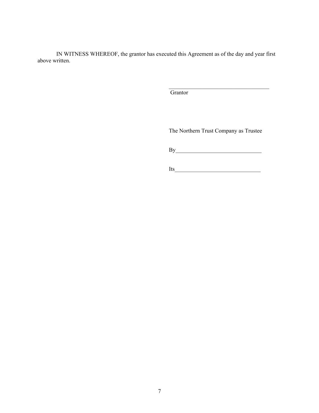 7 IN WITNESS WHEREOF, the grantor has executed this Agreement as of the day and year first above written. ___________________________________ Grantor The Northern Trust Company as Trustee By______________________________ Its______________________________