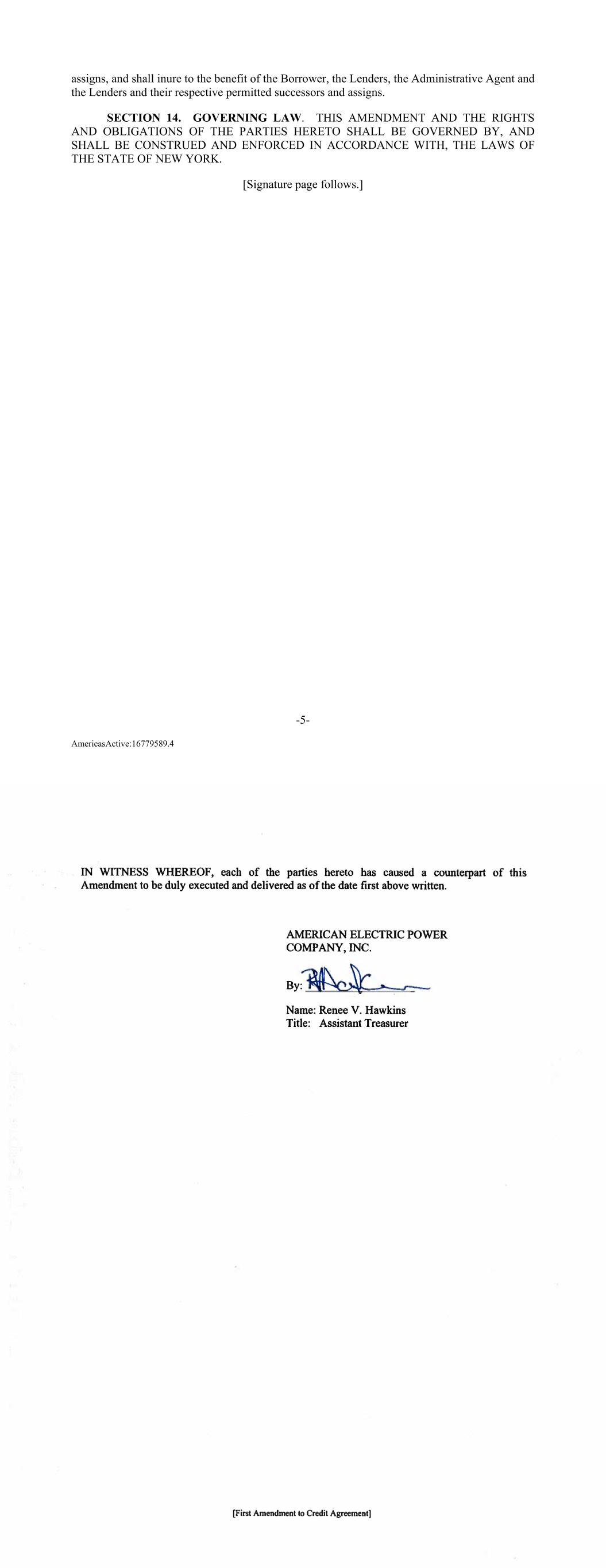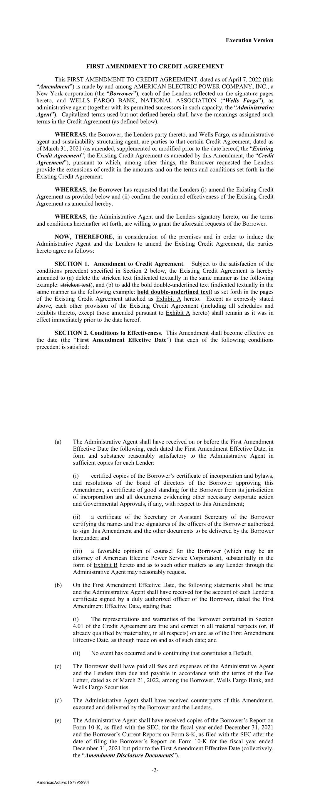 Execution Version FIRST AMENDMENT TO CREDIT AGREEMENT This FIRST AMENDMENT TO CREDIT AGREEMENT, dated as of April 7, 2022 (this “Amendment”) is made by and among AMERICAN ELECTRIC POWER COMPANY, INC., a New York corporation (the “Borrower”), each of the Lenders reflected on the signature pages hereto, and WELLS FARGO BANK, NATIONAL ASSOCIATION (“Wells Fargo”), as administrative agent (together with its permitted successors in such capacity, the “Administrative Agent”). Capitalized terms used but not defined herein shall have the meanings assigned such terms in the Credit Agreement (as defined below). WHEREAS, the Borrower, the Lenders party thereto, and Wells Fargo, as administrative agent and sustainability structuring agent, are parties to that certain Credit Agreement, dated as of March 31, 2021 (as amended, supplemented or modified prior to the date hereof, the “Existing Credit Agreement”; the Existing Credit Agreement as amended by this Amendment, the “Credit Agreement”), pursuant to which, among other things, the Borrower requested the Lenders provide the extensions of credit in the amounts and on the terms and conditions set forth in the Existing Credit Agreement. WHEREAS, the Borrower has requested that the Lenders (i) amend the Existing Credit Agreement as provided below and (ii) confirm the continued effectiveness of the Existing Credit Agreement as amended hereby. WHEREAS, the Administrative Agent and the Lenders signatory hereto, on the terms and conditions hereinafter set forth, are willing to grant the aforesaid requests of the Borrower. NOW, THEREFORE, in consideration of the premises and in order to induce the Administrative Agent and the Lenders to amend the Existing Credit Agreement, the parties hereto agree as follows: SECTION 1. Amendment to Credit Agreement. Subject to the satisfaction of the conditions precedent specified in Section 2 below, the Existing Credit Agreement is hereby amended to (a) delete the stricken text (indicated textually in the same manner as the following example: stricken text), and (b) to add the bold double-underlined text (indicated textually in the same manner as the following example: bold double-underlined text) as set forth in the pages of the Existing Credit Agreement attached as Exhibit A hereto. Except as expressly stated above, each other provision of the Existing Credit Agreement (including all schedules and exhibits thereto, except those amended pursuant to Exhibit A hereto) shall remain as it was in effect immediately prior to the date hereof. SECTION 2. Conditions to Effectiveness. This Amendment shall become effective on the date (the “First Amendment Effective Date”) that each of the following conditions precedent is satisfied: -2- AmericasActive:16779589.4 (a) The Administrative Agent shall have received on or before the First Amendment Effective Date the following, each dated the First Amendment Effective Date, in form and substance reasonably satisfactory to the Administrative Agent in sufficient copies for each Lender: (i) certified copies of the Borrower’s certificate of incorporation and bylaws, and resolutions of the board of directors of the Borrower approving this Amendment, a certificate of good standing for the Borrower from its jurisdiction of incorporation and all documents evidencing other necessary corporate action and Governmental Approvals, if any, with respect to this Amendment; (ii) a certificate of the Secretary or Assistant Secretary of the Borrower certifying the names and true signatures of the officers of the Borrower authorized to sign this Amendment and the other documents to be delivered by the Borrower hereunder; and (iii) a favorable opinion of counsel for the Borrower (which may be an attorney of American Electric Power Service Corporation), substantially in the form of Exhibit B hereto and as to such other matters as any Lender through the Administrative Agent may reasonably request. (b) On the First Amendment Effective Date, the following statements shall be true and the Administrative Agent shall have received for the account of each Lender a certificate signed by a duly authorized officer of the Borrower, dated the First Amendment Effective Date, stating that: (i) The representations and warranties of the Borrower contained in Section 4.01 of the Credit Agreement are true and correct in all material respects (or, if already qualified by materiality, in all respects) on and as of the First Amendment Effective Date, as though made on and as of such date; and (ii) No event has occurred and is continuing that constitutes a Default. (c) The Borrower shall have paid all fees and expenses of the Administrative Agent and the Lenders then due and payable in accordance with the terms of the Fee Letter, dated as of March 21, 2022, among the Borrower, Wells Fargo Bank, and Wells Fargo Securities. (d) The Administrative Agent shall have received counterparts of this Amendment, executed and delivered by the Borrower and the Lenders. (e) The Administrative Agent shall have received copies of the Borrower’s Report on Form 10-K, as filed with the SEC, for the fiscal year ended December 31, 2021 and the Borrower’s Current Reports on Form 8-K, as filed with the SEC after the date of filing the Borrower’s Report on Form 10-K for the fiscal year ended December 31, 2021 but prior to the First Amendment Effective Date (collectively, the “Amendment Disclosure Documents”).