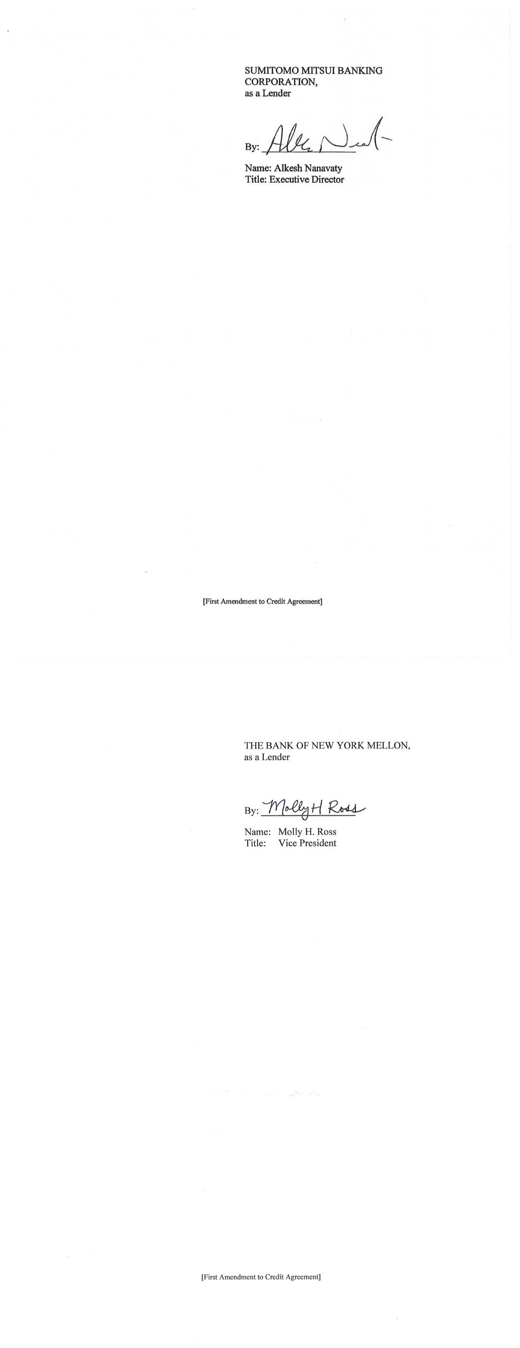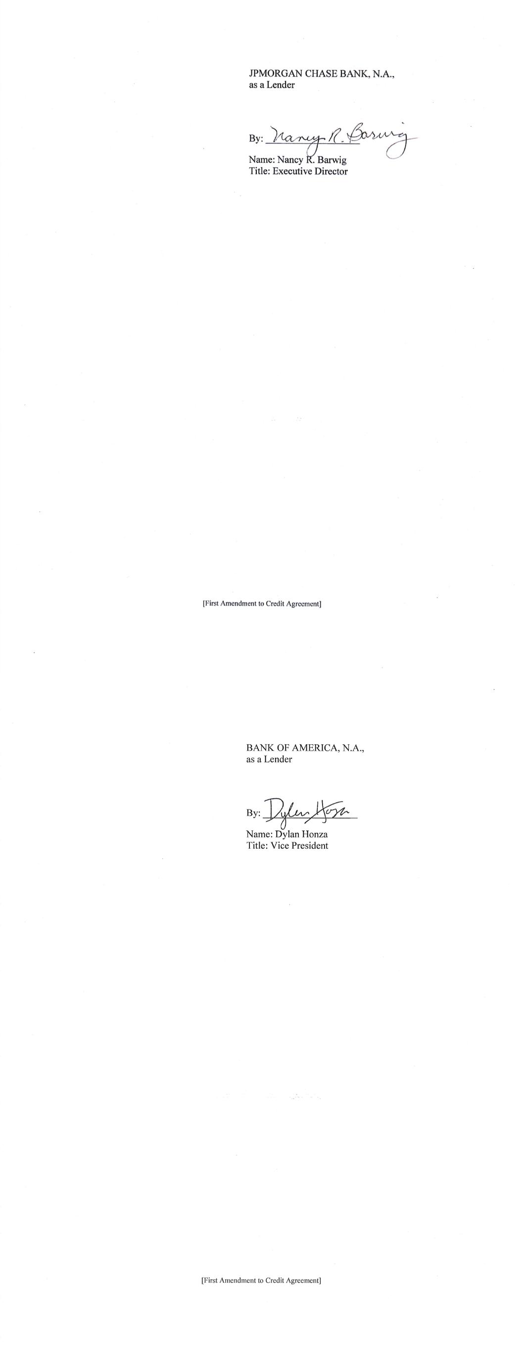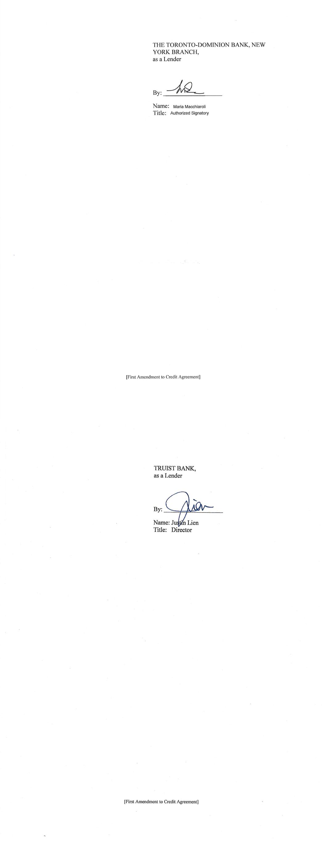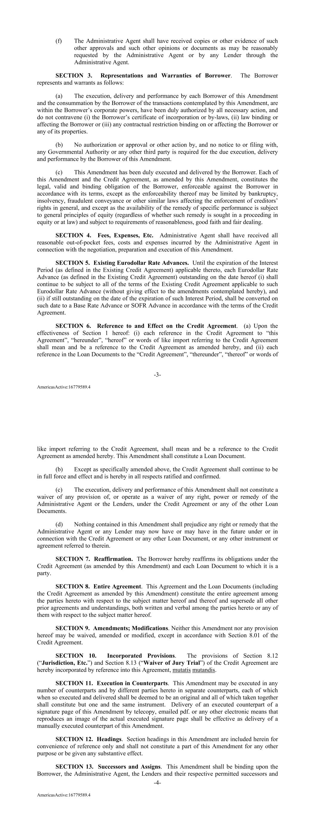 -3- AmericasActive:16779589.4 (f) The Administrative Agent shall have received copies or other evidence of such other approvals and such other opinions or documents as may be reasonably requested by the Administrative Agent or by any Lender through the Administrative Agent. SECTION 3. Representations and Warranties of Borrower. The Borrower represents and warrants as follows: (a) The execution, delivery and performance by each Borrower of this Amendment and the consummation by the Borrower of the transactions contemplated by this Amendment, are within the Borrower’s corporate powers, have been duly authorized by all necessary action, and do not contravene (i) the Borrower’s certificate of incorporation or by-laws, (ii) law binding or affecting the Borrower or (iii) any contractual restriction binding on or affecting the Borrower or any of its properties. (b) No authorization or approval or other action by, and no notice to or filing with, any Governmental Authority or any other third party is required for the due execution, delivery and performance by the Borrower of this Amendment. (c) This Amendment has been duly executed and delivered by the Borrower. Each of this Amendment and the Credit Agreement, as amended by this Amendment, constitutes the legal, valid and binding obligation of the Borrower, enforceable against the Borrower in accordance with its terms, except as the enforceability thereof may be limited by bankruptcy, insolvency, fraudulent conveyance or other similar laws affecting the enforcement of creditors’ rights in general, and except as the availability of the remedy of specific performance is subject to general principles of equity (regardless of whether such remedy is sought in a proceeding in equity or at law) and subject to requirements of reasonableness, good faith and fair dealing. SECTION 4. Fees, Expenses, Etc. Administrative Agent shall have received all reasonable out-of-pocket fees, costs and expenses incurred by the Administrative Agent in connection with the negotiation, preparation and execution of this Amendment. SECTION 5. Existing Eurodollar Rate Advances. Until the expiration of the Interest Period (as defined in the Existing Credit Agreement) applicable thereto, each Eurodollar Rate Advance (as defined in the Existing Credit Agreement) outstanding on the date hereof (i) shall continue to be subject to all of the terms of the Existing Credit Agreement applicable to such Eurodollar Rate Advance (without giving effect to the amendments contemplated hereby), and (ii) if still outstanding on the date of the expiration of such Interest Period, shall be converted on such date to a Base Rate Advance or SOFR Advance in accordance with the terms of the Credit Agreement. SECTION 6. Reference to and Effect on the Credit Agreement. (a) Upon the effectiveness of Section 1 hereof: (i) each reference in the Credit Agreement to “this Agreement”, “hereunder”, “hereof” or words of like import referring to the Credit Agreement shall mean and be a reference to the Credit Agreement as amended hereby, and (ii) each reference in the Loan Documents to the “Credit Agreement”, “thereunder”, “thereof” or words of -4- AmericasActive:16779589.4 like import referring to the Credit Agreement, shall mean and be a reference to the Credit Agreement as amended hereby. This Amendment shall constitute a Loan Document. (b) Except as specifically amended above, the Credit Agreement shall continue to be in full force and effect and is hereby in all respects ratified and confirmed. (c) The execution, delivery and performance of this Amendment shall not constitute a waiver of any provision of, or operate as a waiver of any right, power or remedy of the Administrative Agent or the Lenders, under the Credit Agreement or any of the other Loan Documents. (d) Nothing contained in this Amendment shall prejudice any right or remedy that the Administrative Agent or any Lender may now have or may have in the future under or in connection with the Credit Agreement or any other Loan Document, or any other instrument or agreement referred to therein. SECTION 7. Reaffirmation. The Borrower hereby reaffirms its obligations under the Credit Agreement (as amended by this Amendment) and each Loan Document to which it is a party. SECTION 8. Entire Agreement. This Agreement and the Loan Documents (including the Credit Agreement as amended by this Amendment) constitute the entire agreement among the parties hereto with respect to the subject matter hereof and thereof and supersede all other prior agreements and understandings, both written and verbal among the parties hereto or any of them with respect to the subject matter hereof. SECTION 9. Amendments; Modifications. Neither this Amendment nor any provision hereof may be waived, amended or modified, except in accordance with Section 8.01 of the Credit Agreement. SECTION 10. Incorporated Provisions. The provisions of Section 8.12 (“Jurisdiction, Etc.”) and Section 8.13 (“Waiver of Jury Trial”) of the Credit Agreement are hereby incorporated by reference into this Agreement, mutatis mutandis. SECTION 11. Execution in Counterparts. This Amendment may be executed in any number of counterparts and by different parties hereto in separate counterparts, each of which when so executed and delivered shall be deemed to be an original and all of which taken together shall constitute but one and the same instrument. Delivery of an executed counterpart of a signature page of this Amendment by telecopy, emailed pdf. or any other electronic means that reproduces an image of the actual executed signature page shall be effective as delivery of a manually executed counterpart of this Amendment. SECTION 12. Headings. Section headings in this Amendment are included herein for convenience of reference only and shall not constitute a part of this Amendment for any other purpose or be given any substantive effect. SECTION 13. Successors and Assigns