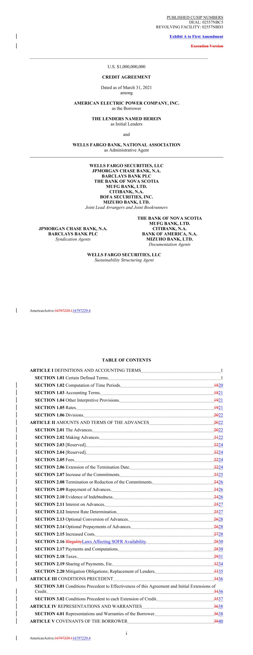 PUBLISHED CUSIP NUMBERS DEAL: 02557NBC5 REVOLVING FACILITY: 02557NBD3 Exhibit A to First Amendment Execution Version AmericasActive:16797229.116797229.4 JPMORGAN CHASE BANK, N.A. BARCLAYS BANK PLC Syndication Agents THE BANK OF NOVA SCOTIA MUFG BANK, LTD. CITIBANK, N.A. BANK OF AMERICA, N.A. MIZUHO BANK, LTD. Documentation Agents WELLS FARGO SECURITIES, LLC Sustainability Structuring Agent ______________________________________________________________________________ U.S. $1,000,000,000 CREDIT AGREEMENT Dated as of March 31, 2021 among AMERICAN ELECTRIC POWER COMPANY, INC. as the Borrower THE LENDERS NAMED HEREIN as Initial Lenders and WELLS FARGO BANK, NATIONAL ASSOCIATION as Administrative Agent WELLS FARGO SECURITIES, LLC JPMORGAN CHASE BANK, N.A. BARCLAYS BANK PLC THE BANK OF NOVA SCOTIA MUFG BANK, LTD. CITIBANK, N.A. BOFA SECURITIES, INC. MIZUHO BANK, LTD. Joint Lead Arrangers and Joint Bookrunners TABLE OF CONTENTS ARTICLE I DEFINITIONS AND ACCOUNTING TERMS 1 SECTION 1.01 Certain Defined Terms. 1 SECTION 1.02 Computation of Time Periods. 1820 SECTION 1.03 Accounting Terms. 1821 SECTION 1.04 Other Interpretive Provisions. 1921 SECTION 1.05 Rates. 1921 SECTION 1.06 Divisions. 2022 ARTICLE II AMOUNTS AND TERMS OF THE ADVANCES 2022 SECTION 2.01 The Advances. 2022 SECTION 2.02 Making Advances. 2122 SECTION 2.03 [Reserved]. 2224 SECTION 2.04 [Reserved]. 2224 SECTION 2.05 Fees. 2224 SECTION 2.06 Extension of the Termination Date. 2224 SECTION 2.07 Increase of the Commitments. 2325 SECTION 2.08 Termination or Reduction of the Commitments. 2426 SECTION 2.09 Repayment of Advances. 2426 SECTION 2.10 Evidence of Indebtedness. 2426 SECTION 2.11 Interest on Advances. 2527 SECTION 2.12 Interest Rate Determination. 2527 SECTION 2.13 Optional Conversion of Advances. 2628 SECTION 2.14 Optional Prepayments of Advances. 2628 SECTION 2.15 Increased Costs. 2728 SECTION 2.16 IllegalityLaws Affecting SOFR Availability. 2830 SECTION 2.17 Payments and Computations. 2830 SECTION 2.18 Taxes. 2931 SECTION 2.19 Sharing of Payments, Etc. 3234 SECTION 2.20 Mitigation Obligations; Replacement of Lenders. 3335 ARTICLE III CONDITIONS PRECEDENT 3436 SECTION 3.01 Conditions Precedent to Effectiveness of this Agreement and Initial Extensions of Credit. 3436 SECTION 3.02 Conditions Precedent to each Extension of Credit. 3537 ARTICLE IV REPRESENTATIONS AND WARRANTIES 3638 SECTION 4.01 Representations and Warranties of the Borrower. 3638 ARTICLE V COVENANTS OF THE BORROWER 3840 i AmericasActive:16797229.116797229.4
