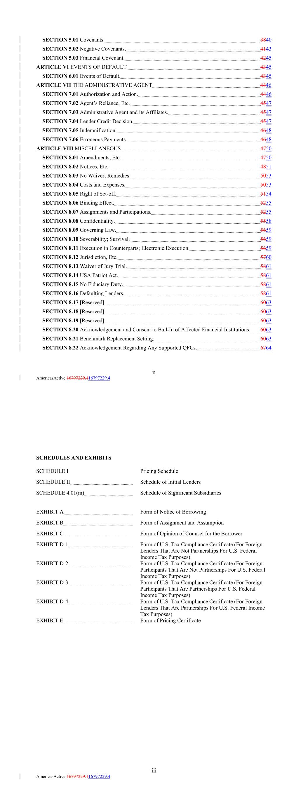 SECTION 5.01 Covenants. 3840 SECTION 5.02 Negative Covenants. 4143 SECTION 5.03 Financial Covenant. 4245 ARTICLE VI EVENTS OF DEFAULT 4345 SECTION 6.01 Events of Default. 4345 ARTICLE VII THE ADMINISTRATIVE AGENT 4446 SECTION 7.01 Authorization and Action. 4446 SECTION 7.02 Agent’s Reliance, Etc. 4547 SECTION 7.03 Administrative Agent and its Affiliates. 4547 SECTION 7.04 Lender Credit Decision. 4547 SECTION 7.05 Indemnification. 4648 SECTION 7.06 Erroneous Payments. 4648 ARTICLE VIII MISCELLANEOUS 4750 SECTION 8.01 Amendments, Etc. 4750 SECTION 8.02 Notices, Etc. 4851 SECTION 8.03 No Waiver; Remedies. 5053 SECTION 8.04 Costs and Expenses. 5053 SECTION 8.05 Right of Set-off. 5154 SECTION 8.06 Binding Effect. 5255 SECTION 8.07 Assignments and Participations. 5255 SECTION 8.08 Confidentiality. 5558 SECTION 8.09 Governing Law. 5659 SECTION 8.10 Severability; Survival. 5659 SECTION 8.11 Execution in Counterparts; Electronic Execution. 5659 SECTION 8.12 Jurisdiction, Etc. 5760 SECTION 8.13 Waiver of Jury Trial. 5861 SECTION 8.14 USA Patriot Act. 5861 SECTION 8.15 No Fiduciary Duty. 5861 SECTION 8.16 Defaulting Lenders. 5861 SECTION 8.17 [Reserved]. 6063 SECTION 8.18 [Reserved]. 6063 SECTION 8.19 [Reserved]. 6063 SECTION 8.20 Acknowledgement and Consent to Bail-In of Affected Financial Institutions. 6063 SECTION 8.21 Benchmark Replacement Setting. 6063 SECTION 8.22 Acknowledgement Regarding Any Supported QFCs. 6764 ii AmericasActive:16797229.116797229.4 iii AmericasActive:16797229.116797229.4 EXHIBIT C Form of Opinion of Counsel for the Borrower SCHEDULE 4.01(m) Pricing Schedule EXHIBIT D-1 Schedule of Significant Subsidiaries Form of U.S. Tax Compliance Certificate (For Foreign Lenders That Are Not Partnerships For U.S. Federal Income Tax Purposes) SCHEDULES AND EXHIBITS EXHIBIT D-2 Form of U.S. Tax Compliance Certificate (For Foreign Participants That Are Not Partnerships For U.S. Federal Income Tax Purposes) EXHIBIT A EXHIBIT D-3 Form of Notice of Borrowing Form of U.S. Tax Compliance Certificate (For Foreign Participants That Are Partnerships For U.S. Federal Income Tax Purposes) SCHEDULE II EXHIBIT D-4 Form of U.S. Tax Compliance Certificate (For Foreign Lenders That Are Partnerships For U.S. Federal Income Tax Purposes) EXHIBIT B Schedule of Initial Lenders EXHIBIT E Form of Assignment and Assumption Form of Pricing Certificate SCHEDULE I