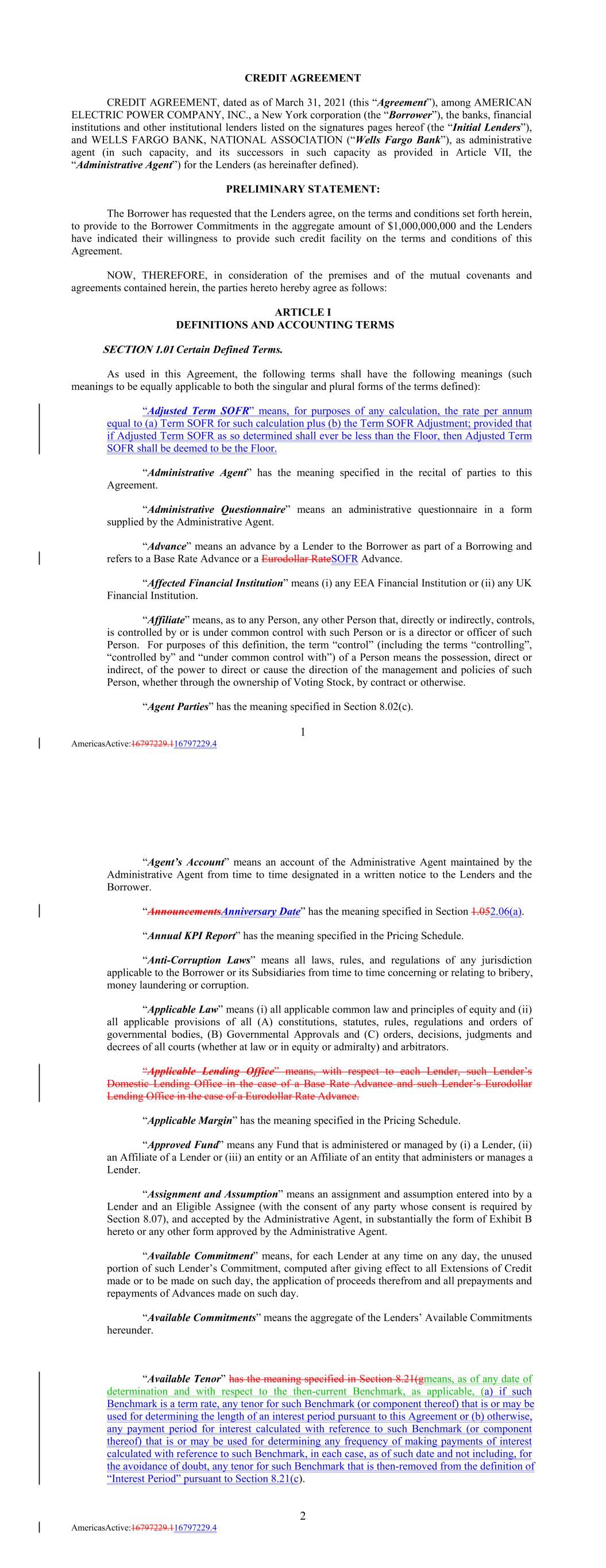 CREDIT AGREEMENT CREDIT AGREEMENT, dated as of March 31, 2021 (this “Agreement”), among AMERICAN ELECTRIC POWER COMPANY, INC., a New York corporation (the “Borrower”), the banks, financial institutions and other institutional lenders listed on the signatures pages hereof (the “Initial Lenders”), and WELLS FARGO BANK, NATIONAL ASSOCIATION (“Wells Fargo Bank”), as administrative agent (in such capacity, and its successors in such capacity as provided in Article VII, the “Administrative Agent”) for the Lenders (as hereinafter defined). PRELIMINARY STATEMENT: The Borrower has requested that the Lenders agree, on the terms and conditions set forth herein, to provide to the Borrower Commitments in the aggregate amount of $1,000,000,000 and the Lenders have indicated their willingness to provide such credit facility on the terms and conditions of this Agreement. NOW, THEREFORE, in consideration of the premises and of the mutual covenants and agreements contained herein, the parties hereto hereby agree as follows: ARTICLE I DEFINITIONS AND ACCOUNTING TERMS SECTION 1.01 Certain Defined Terms. As used in this Agreement, the following terms shall have the following meanings (such meanings to be equally applicable to both the singular and plural forms of the terms defined): “Adjusted Term SOFR” means, for purposes of any calculation, the rate per annum equal to (a) Term SOFR for such calculation plus (b) the Term SOFR Adjustment; provided that if Adjusted Term SOFR as so determined shall ever be less than the Floor, then Adjusted Term SOFR shall be deemed to be the Floor. “Administrative Agent” has the meaning specified in the recital of parties to this Agreement. “Administrative Questionnaire” means an administrative questionnaire in a form supplied by the Administrative Agent. “Advance” means an advance by a Lender to the Borrower as part of a Borrowing and refers to a Base Rate Advance or a Eurodollar RateSOFR Advance. “Affected Financial Institution” means (i) any EEA Financial Institution or (ii) any UK Financial Institution. “Affiliate” means, as to any Person, any other Person that, directly or indirectly, controls, is controlled by or is under common control with such Person or is a director or officer of such Person. For purposes of this definition, the term “control” (including the terms “controlling”, “controlled by” and “under common control with”) of a Person means the possession, direct or indirect, of the power to direct or cause the direction of the management and policies of such Person, whether through the ownership of Voting Stock, by contract or otherwise. “Agent Parties” has the meaning specified in Section 8.02(c). 1 AmericasActive:16797229.116797229.4 “Agent’s Account” means an account of the Administrative Agent maintained by the Administrative Agent from time to time designated in a written notice to the Lenders and the Borrower. “AnnouncementsAnniversary Date” has the meaning specified in Section 1.052.06(a). “Annual KPI Report” has the meaning specified in the Pricing Schedule. “Anti-Corruption Laws” means all laws, rules, and regulations of any jurisdiction applicable to the Borrower or its Subsidiaries from time to time concerning or relating to bribery, money laundering or corruption. “Applicable Law” means (i) all applicable common law and principles of equity and (ii) all applicable provisions of all (A) constitutions, statutes, rules, regulations and orders of governmental bodies, (B) Governmental Approvals and (C) orders, decisions, judgments and decrees of all courts (whether at law or in equity or admiralty) and arbitrators. “Applicable Lending Office” means, with respect to each Lender, such Lender’s Domestic Lending Office in the case of a Base Rate Advance and such Lender’s Eurodollar Lending Office in the case of a Eurodollar Rate Advance. “Applicable Margin” has the meaning specified in the Pricing Schedule. “Approved Fund” means any Fund that is administered or managed by (i) a Lender, (ii) an Affiliate of a Lender or (iii) an entity or an Affiliate of an entity that administers or manages a Lender. “Assignment and Assumption” means an assignment and assumption entered into by a Lender and an Eligible Assignee (with the consent of any party whose consent is required by Section 8.07), and accepted by the Administrative Agent, in substantially the form of Exhibit B hereto or any other form approved by the Administrative Agent. “Available Commitment” means, for each Lender at any time on any day, the unused portion of such Lender’s Commitment, computed after giving effect to all Extensions of Credit made or to be made on such day, the application of proceeds therefrom and all prepayments and repayments of Advances made on such day. “Available Commitments” means the aggregate of the Lenders’ Available Commitments hereunder. “Available Tenor” has the meaning specified in Section 8.21(gmeans, as of any date of determination and with respect to the then-current Benchmark, as applicable, (a) if such Benchmark is a term rate, any tenor for such Benchmark (or component thereof) that is or may be used for determining the length of an interest period pursuant to this Agreement or (b) otherwise, any payment period for interest calculated with reference to such Benchmark (or component thereof) that is or may be used for determining any frequency of making payments of interest calculated with reference to such Benchmark, in each case, as of such date and not including, for the avoidance of doubt, any tenor for such Benchmark that is then-removed from the definition of “Interest Period” pursuant to Section 8.21(c). 2 AmericasActive:16797229.116797229.4