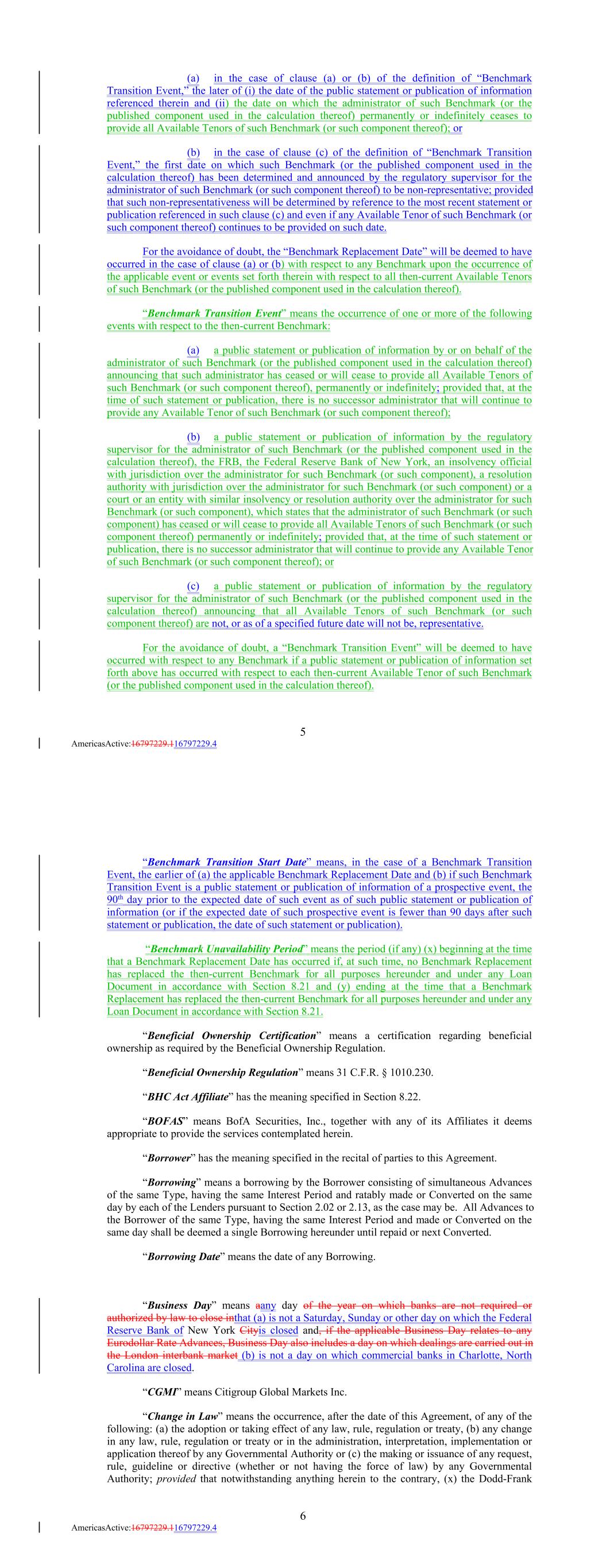 (a) in the case of clause (a) or (b) of the definition of “Benchmark Transition Event,” the later of (i) the date of the public statement or publication of information referenced therein and (ii) the date on which the administrator of such Benchmark (or the published component used in the calculation thereof) permanently or indefinitely ceases to provide all Available Tenors of such Benchmark (or such component thereof); or (b) in the case of clause (c) of the definition of “Benchmark Transition Event,” the first date on which such Benchmark (or the published component used in the calculation thereof) has been determined and announced by the regulatory supervisor for the administrator of such Benchmark (or such component thereof) to be non-representative; provided that such non-representativeness will be determined by reference to the most recent statement or publication referenced in such clause (c) and even if any Available Tenor of such Benchmark (or such component thereof) continues to be provided on such date. For the avoidance of doubt, the “Benchmark Replacement Date” will be deemed to have occurred in the case of clause (a) or (b) with respect to any Benchmark upon the occurrence of the applicable event or events set forth therein with respect to all then-current Available Tenors of such Benchmark (or the published component used in the calculation thereof). “Benchmark Transition Event” means the occurrence of one or more of the following events with respect to the then-current Benchmark: (a) a public statement or publication of information by or on behalf of the administrator of such Benchmark (or the published component used in the calculation thereof) announcing that such administrator has ceased or will cease to provide all Available Tenors of such Benchmark (or such component thereof), permanently or indefinitely; provided that, at the time of such statement or publication, there is no successor administrator that will continue to provide any Available Tenor of such Benchmark (or such component thereof); (b) a public statement or publication of information by the regulatory supervisor for the administrator of such Benchmark (or the published component used in the calculation thereof), the FRB, the Federal Reserve Bank of New York, an insolvency official with jurisdiction over the administrator for such Benchmark (or such component), a resolution authority with jurisdiction over the administrator for such Benchmark (or such component) or a court or an entity with similar insolvency or resolution authority over the administrator for such Benchmark (or such component), which states that the administrator of such Benchmark (or such component) has ceased or will cease to provide all Available Tenors of such Benchmark (or such component thereof) permanently or indefinitely; provided that, at the time of such statement or publication, there is no successor administrator that will continue to provide any Available Tenor of such Benchmark (or such component thereof); or (c) a public statement or publication of information by the regulatory supervisor for the administrator of such Benchmark (or the published component used in the calculation thereof) announcing that all Available Tenors of such Benchmark (or such component thereof) are not, or as of a specified future date will not be, representative. For the avoidance of doubt, a “Benchmark Transition Event” will be deemed to have occurred with respect to any Benchmark if a public statement or publication of information set forth above has occurred with respect to each then-current Available Tenor of such Benchmark (or the published component used in the calculation thereof). 5 AmericasActive:16797229.116797229.4 “Benchmark Transition Start Date” means, in the case of a Benchmark Transition Event, the earlier of (a) the applicable Benchmark Replacement Date and (b) if such Benchmark Transition Event is a public statement or publication of information of a prospective event, the 90th day prior to the expected date of such event as of such public statement or publication of information (or if the expected date of such prospective event is fewer than 90 days after such statement or publication, the date of such statement or publication). “Benchmark Unavailability Period” means the period (if any) (x) beginning at the time that a Benchmark Replacement Date has occurred if, at such time, no Benchmark Replacement has replaced the then-current Benchmark for all purposes hereunder and under any Loan Document in accordance with Section 8.21 and (y) ending at the time that a Benchmark Replacement has replaced the then-current Benchmark for all purposes hereunder and under any Loan Document in accordance with Section 8.21. “Beneficial Ownership Certification” means a certification regarding beneficial ownership as required by the Beneficial Ownership Regulation. “Beneficial Ownership Regulation” means 31 C.F.R. § 1010.230. “BHC Act Affiliate” has the meaning specified in Section 8.22. “BOFAS” means BofA Securities, Inc., together with any of its Affiliates it deems appropriate to provide the services contemplated herein. “Borrower” has the meaning specified in the recital of parties to this Agreement. “Borrowing” means a borrowing by the Borrower consisting of simultaneous Advances of the same Type, having the same Interest Period and ratably made or Converted on the same day by each of the Lenders pursuant to Section 2.02 or 2.13, as the case may be. All Advances to the Borrower of the same Type, having the same Interest Period and made or Converted on the same day shall be deemed a single Borrowing hereunder until repaid or next Converted. “Borrowing Date” means the date of any Borrowing. “Business Day” means aany day of the year on which banks are not required or authorized by law to close inthat (a) is not a Saturday, Sunday or other day on which the Federal Reserve Bank of New Yo