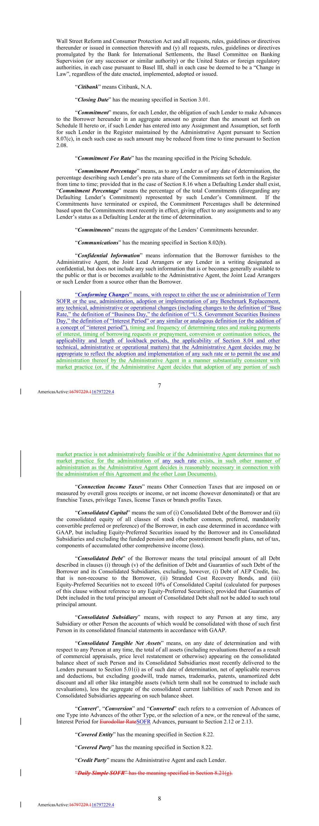 Wall Street Reform and Consumer Protection Act and all requests, rules, guidelines or directives thereunder or issued in connection therewith and (y) all requests, rules, guidelines or directives promulgated by the Bank for International Settlements, the Basel Committee on Banking Supervision (or any successor or similar authority) or the United States or foreign regulatory authorities, in each case pursuant to Basel III, shall in each case be deemed to be a “Change in Law”, regardless of the date enacted, implemented, adopted or issued. “Citibank” means Citibank, N.A. “Closing Date” has the meaning specified in Section 3.01. “Commitment” means, for each Lender, the obligation of such Lender to make Advances to the Borrower hereunder in an aggregate amount no greater than the amount set forth on Schedule II hereto or, if such Lender has entered into any Assignment and Assumption, set forth for such Lender in the Register maintained by the Administrative Agent pursuant to Section 8.07(c), in each such case as such amount may be reduced from time to time pursuant to Section 2.08. “Commitment Fee Rate” has the meaning specified in the Pricing Schedule. “Commitment Percentage” means, as to any Lender as of any date of determination, the percentage describing such Lender’s pro rata share of the Commitments set forth in the Register from time to time; provided that in the case of Section 8.16 when a Defaulting Lender shall exist, “Commitment Percentage” means the percentage of the total Commitments (disregarding any Defaulting Lender’s Commitment) represented by such Lender’s Commitment. If the Commitments have terminated or expired, the Commitment Percentages shall be determined based upon the Commitments most recently in effect, giving effect to any assignments and to any Lender’s status as a Defaulting Lender at the time of determination. “Commitments” means the aggregate of the Lenders’ Commitments hereunder. “Communications” has the meaning specified in Section 8.02(b). “Confidential Information” means information that the Borrower furnishes to the Administrative Agent, the Joint Lead Arrangers or any Lender in a writing designated as confidential, but does not include any such information that is or becomes generally available to the public or that is or becomes available to the Administrative Agent, the Joint Lead Arrangers or such Lender from a source other than the Borrower. “Conforming Changes” means, with respect to either the use or administration of Term SOFR or the use, administration, adoption or implementation of any Benchmark Replacement, any technical, administrative or operational changes (including changes to the definition of “Base Rate,” the definition of “Business Day,” the definition of “U.S. Government Securities Business Day,” the definition of “Interest Period” or any similar or analogous definition (or the addition of a concept of “interest period”), timing and frequency of determining rates and making payments of interest, timing of borrowing requests or prepayment, conversion or continuation notices, the applicability and length of lookback periods, the applicability of Section 8.04 and other technical, administrative or operational matters) that the Administrative Agent decides may be appropriate to reflect the adoption and implementation of any such rate or to permit the use and administration thereof by the Administrative Agent in a manner substantially consistent with market practice (or, if the Administrative Agent decides that adoption of any portion of such 7 AmericasActive:16797229.116797229.4 market practice is not administratively feasible or if the Administrative Agent determines that no market practice for the administration of any such rate exists, in such other manner of administration as the Administrative Agent decides is reasonably necessary in connection with the administration of this Agreement and the other Loan Documents). “Connection Income Taxes” means Other Connection Taxes that are imposed on or measured by overall gross receipts or income, or net income (however denominated) or that are franchise Taxes, privilege Taxes, license Taxes or branch profits Taxes. “Consolidated Capital” means the sum of (i) Consolidated Debt of the Borrower and (ii) the consolidated equity of all classes of stock (whether common, preferred, mandatorily convertible preferred or preference) of the Borrower, in each case determined in accordance with GAAP, but including Equity-Preferred Securities issued by the Borrower and its Consolidated Subsidiaries and excluding the funded pension and other postretirement benefit plans, net of tax, components of accumulated other comprehensive income (loss). “Consolidated Debt” of the Borrower means the total principal amount of all Debt described in clauses (i) through (v) of the definition of Debt and Guaranties of such Debt of the Borrower and its Consolidated Subsidiaries, excluding, however, (i) Debt of AEP Credit, Inc. that is non-recourse to the Borrower, (ii) Stranded Cost Recovery Bonds, and (iii) Equity-Preferred Securities not to exceed 10% of Consolidated Capital (calculated for purposes of this clause without reference to any Equity-Preferred Securities); provided that Guaranties of Debt included in the total principal amount of Consolidated Debt shall not be added to such total principal amount. “Consolidated Subsidiary” means, with respect to any Person at any time, any Subsidiary or other Person the accounts of which would be consolidated with those of such first Person in its consolidated financial statements in accordance with GAAP. “Consolidated Tangible Net Assets” means, on any date of determination and with respect to any Person at any time, the total of all assets (including revaluations thereof as a result of commercial appraisals, price level restatement or otherwise) appearing on the consolidated balance she