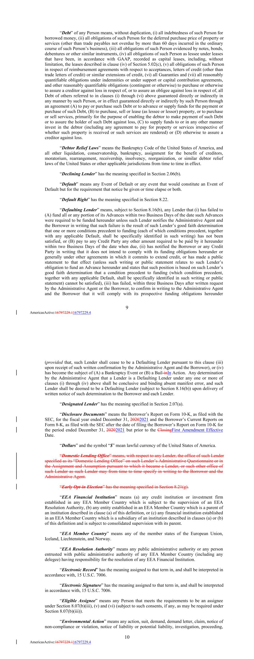 “Debt” of any Person means, without duplication, (i) all indebtedness of such Person for borrowed money, (ii) all obligations of such Person for the deferred purchase price of property or services (other than trade payables not overdue by more than 60 days incurred in the ordinary course of such Person’s business), (iii) all obligations of such Person evidenced by notes, bonds, debentures or other similar instruments, (iv) all obligations of such Person as lessee under leases that have been, in accordance with GAAP, recorded as capital leases, including, without limitation, the leases described in clause (iv) of Section 5.02(c), (v) all obligations of such Person in respect of reimbursement agreements with respect to acceptances, letters of credit (other than trade letters of credit) or similar extensions of credit, (vi) all Guaranties and (vii) all reasonably quantifiable obligations under indemnities or under support or capital contribution agreements, and other reasonably quantifiable obligations (contingent or otherwise) to purchase or otherwise to assure a creditor against loss in respect of, or to assure an obligee against loss in respect of, all Debt of others referred to in clauses (i) through (vi) above guaranteed directly or indirectly in any manner by such Person, or in effect guaranteed directly or indirectly by such Person through an agreement (A) to pay or purchase such Debt or to advance or supply funds for the payment or purchase of such Debt, (B) to purchase, sell or lease (as lessee or lessor) property, or to purchase or sell services, primarily for the purpose of enabling the debtor to make payment of such Debt or to assure the holder of such Debt against loss, (C) to supply funds to or in any other manner invest in the debtor (including any agreement to pay for property or services irrespective of whether such property is received or such services are rendered) or (D) otherwise to assure a creditor against loss. “Debtor Relief Laws” means the Bankruptcy Code of the United States of America, and all other liquidation, conservatorship, bankruptcy, assignment for the benefit of creditors, moratorium, rearrangement, receivership, insolvency, reorganization, or similar debtor relief laws of the United States or other applicable jurisdictions from time to time in effect. “Declining Lender” has the meaning specified in Section 2.06(b). “Default” means any Event of Default or any event that would constitute an Event of Default but for the requirement that notice be given or time elapse or both. “Default Right” has the meaning specified in Section 8.22. “Defaulting Lender” means, subject to Section 8.16(b), any Lender that (i) has failed to (A) fund all or any portion of its Advances within two Business Days of the date such Advances were required to be funded hereunder unless such Lender notifies the Administrative Agent and the Borrower in writing that such failure is the result of such Lender’s good faith determination that one or more conditions precedent to funding (each of which conditions precedent, together with any applicable Default, shall be specifically identified in such writing) has not been satisfied, or (B) pay to any Credit Party any other amount required to be paid by it hereunder within two Business Days of the date when due, (ii) has notified the Borrower or any Credit Party in writing that it does not intend to comply with its funding obligations hereunder or generally under other agreements in which it commits to extend credit, or has made a public statement to that effect (unless such writing or public statement relates to such Lender’s obligation to fund an Advance hereunder and states that such position is based on such Lender’s good faith determination that a condition precedent to funding (which condition precedent, together with any applicable Default, shall be specifically identified in such writing or public statement) cannot be satisfied), (iii) has failed, within three Business Days after written request by the Administrative Agent or the Borrower, to confirm in writing to the Administrative Agent and the Borrower that it will comply with its prospective funding obligations hereunder 9 AmericasActive:16797229.116797229.4 (provided that, such Lender shall cease to be a Defaulting Lender pursuant to this clause (iii) upon receipt of such written confirmation by the Administrative Agent and the Borrower), or (iv) has become the subject of (A) a Bankruptcy Event or (B) a Bail-inIn Action. Any determination by the Administrative Agent that a Lender is a Defaulting Lender under any one or more of clauses (i) through (iv) above shall be conclusive and binding absent manifest error, and such Lender shall be deemed to be a Defaulting Lender (subject to Section 8.16(b)) upon delivery of written notice of such determination to the Borrower and each Lender. “Designated Lender” has the meaning specified in Section 2.07(a). “Disclosure Documents” means the Borrower’s Report on Form 10-K, as filed with the SEC, for the fiscal year ended December 31, 20202021 and the Borrower’s Current Reports on Form 8-K, as filed with the SEC after the date of filing the Borrower’s Report on Form 10-K for the period ended December 31, 20202021 but prior to the ClosingFirst Amendment Effective Date. “Dollars” and the symbol “$” mean lawful currency of the United States of America. “Domestic Lending Office” means, with respect to any Lender, the office of such Lender specified as its “Domestic Lending Office” on such Lender’s Administrative Questionnaire or in the Assignment and Assumption pursuant to which it became a Lender, or such other office of such Lender as such Lender may from time to time specify in writing to the Borrower and the Administrative Agent. “Early Opt-in Election” has the meaning specified in Section 8.21(g). “EEA Financial Institution” means (a) any credit institution or investment fi