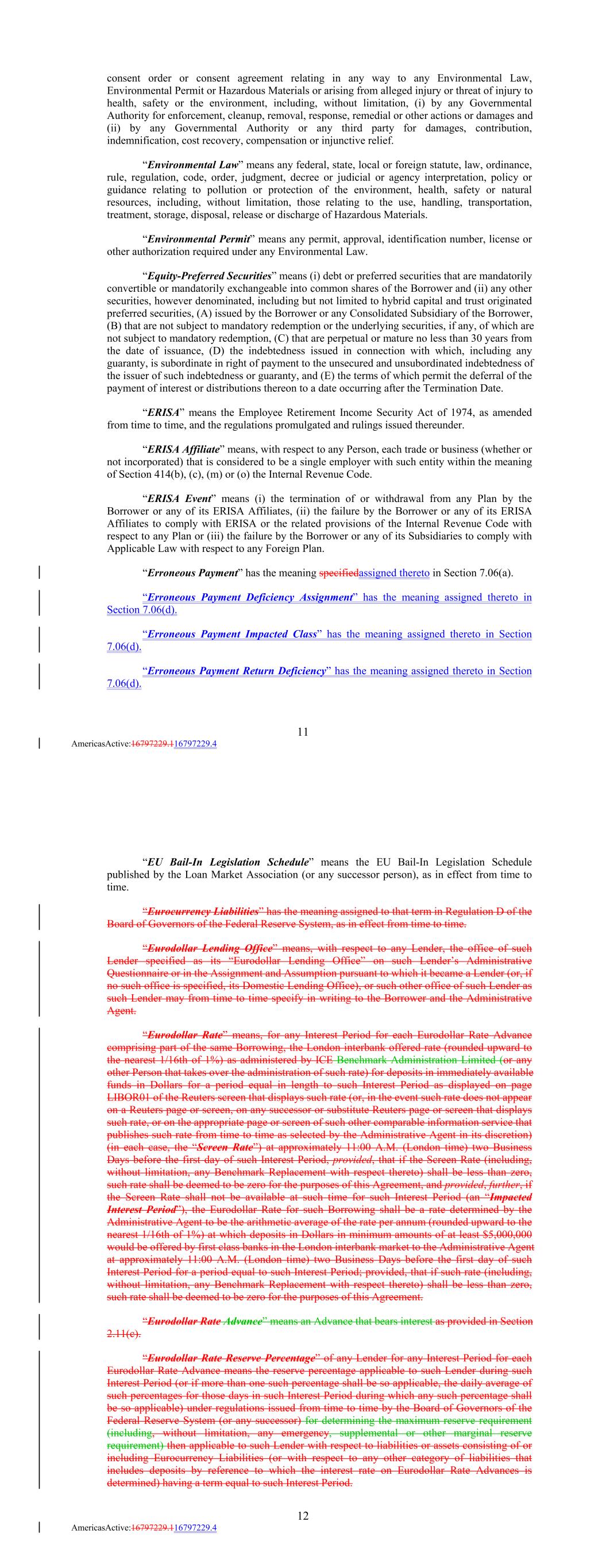 consent order or consent agreement relating in any way to any Environmental Law, Environmental Permit or Hazardous Materials or arising from alleged injury or threat of injury to health, safety or the environment, including, without limitation, (i) by any Governmental Authority for enforcement, cleanup, removal, response, remedial or other actions or damages and (ii) by any Governmental Authority or any third party for damages, contribution, indemnification, cost recovery, compensation or injunctive relief. “Environmental Law” means any federal, state, local or foreign statute, law, ordinance, rule, regulation, code, order, judgment, decree or judicial or agency interpretation, policy or guidance relating to pollution or protection of the environment, health, safety or natural resources, including, without limitation, those relating to the use, handling, transportation, treatment, storage, disposal, release or discharge of Hazardous Materials. “Environmental Permit” means any permit, approval, identification number, license or other authorization required under any Environmental Law. “Equity-Preferred Securities” means (i) debt or preferred securities that are mandatorily convertible or mandatorily exchangeable into common shares of the Borrower and (ii) any other securities, however denominated, including but not limited to hybrid capital and trust originated preferred securities, (A) issued by the Borrower or any Consolidated Subsidiary of the Borrower, (B) that are not subject to mandatory redemption or the underlying securities, if any, of which are not subject to mandatory redemption, (C) that are perpetual or mature no less than 30 years from the date of issuance, (D) the indebtedness issued in connection with which, including any guaranty, is subordinate in right of payment to the unsecured and unsubordinated indebtedness of the issuer of such indebtedness or guaranty, and (E) the terms of which permit the deferral of the payment of interest or distributions thereon to a date occurring after the Termination Date. “ERISA” means the Employee Retirement Income Security Act of 1974, as amended from time to time, and the regulations promulgated and rulings issued thereunder. “ERISA Affiliate” means, with respect to any Person, each trade or business (whether or not incorporated) that is considered to be a single employer with such entity within the meaning of Section 414(b), (c), (m) or (o) the Internal Revenue Code. “ERISA Event” means (i) the termination of or withdrawal from any Plan by the Borrower or any of its ERISA Affiliates, (ii) the failure by the Borrower or any of its ERISA Affiliates to comply with ERISA or the related provisions of the Internal Revenue Code with respect to any Plan or (iii) the failure by the Borrower or any of its Subsidiaries to comply with Applicable Law with respect to any Foreign Plan. “Erroneous Payment” has the meaning specifiedassigned thereto in Section 7.06(a). “Erroneous Payment Deficiency Assignment” has the meaning assigned thereto in Section 7.06(d). “Erroneous Payment Impacted Class” has the meaning assigned thereto in Section 7.06(d). “Erroneous Payment Return Deficiency” has the meaning assigned thereto in Section 7.06(d). 11 AmericasActive:16797229.116797229.4 “EU Bail-In Legislation Schedule” means the EU Bail-In Legislation Schedule published by the Loan Market Association (or any successor person), as in effect from time to time. “Eurocurrency Liabilities” has the meaning assigned to that term in Regulation D of the Board of Governors of the Federal Reserve System, as in effect from time to time. “Eurodollar Lending Office” means, with respect to any Lender, the office of such Lender specified as its “Eurodollar Lending Office” on such Lender’s Administrative Questionnaire or in the Assignment and Assumption pursuant to which it became a Lender (or, if no such office is specified, its Domestic Lending Office), or such other office of such Lender as such Lender may from time to time specify in writing to the Borrower and the Administrative Agent. “Eurodollar Rate” means, for any Interest Period for each Eurodollar Rate Advance comprising part of the same Borrowing, the London interbank offered rate (rounded upward to the nearest 1/16th of 1%) as administered by ICE Benchmark Administration Limited (or any other Person that takes over the administration of such rate) for deposits in immediately available funds in Dollars for a period equal in length to such Interest Period as displayed on page LIBOR01 of the Reuters screen that displays such rate (or, in the event such rate does not appear on a Reuters page or screen, on any successor or substitute Reuters page or screen that displays such rate, or on the appropriate page or screen of such other comparable information service that publishes such rate from time to time as selected by the Administrative Agent in its discretion) (in each case, the “Screen Rate”) at approximately 11:00 A.M. (London time) two Business Days before the first day of such Interest Period, provided, that if the Screen Rate (including, without limitation, any Benchmark Replacement with respect thereto) shall be less than zero, such rate shall be deemed to be zero for the purposes of this Agreement, and provided, further, if the Screen Rate shall not be available at such time for such Interest Period (an “Impacted Interest Period”), the Eurodollar Rate for such Borrowing shall be a rate determined by the Administrative Agent to be the arithmetic average of the rate per annum (rounded upward to the nearest 1/16th of 1%) at which deposits in Dollars in minimum amounts of at least $5,000,000 would be offered by first class banks in the London interbank market to the Administrative Agent at approximately 11:00 A.M. (London time) two Business Days before the first day of such Interest Period for a period equal to such Interest Period; provided, that i