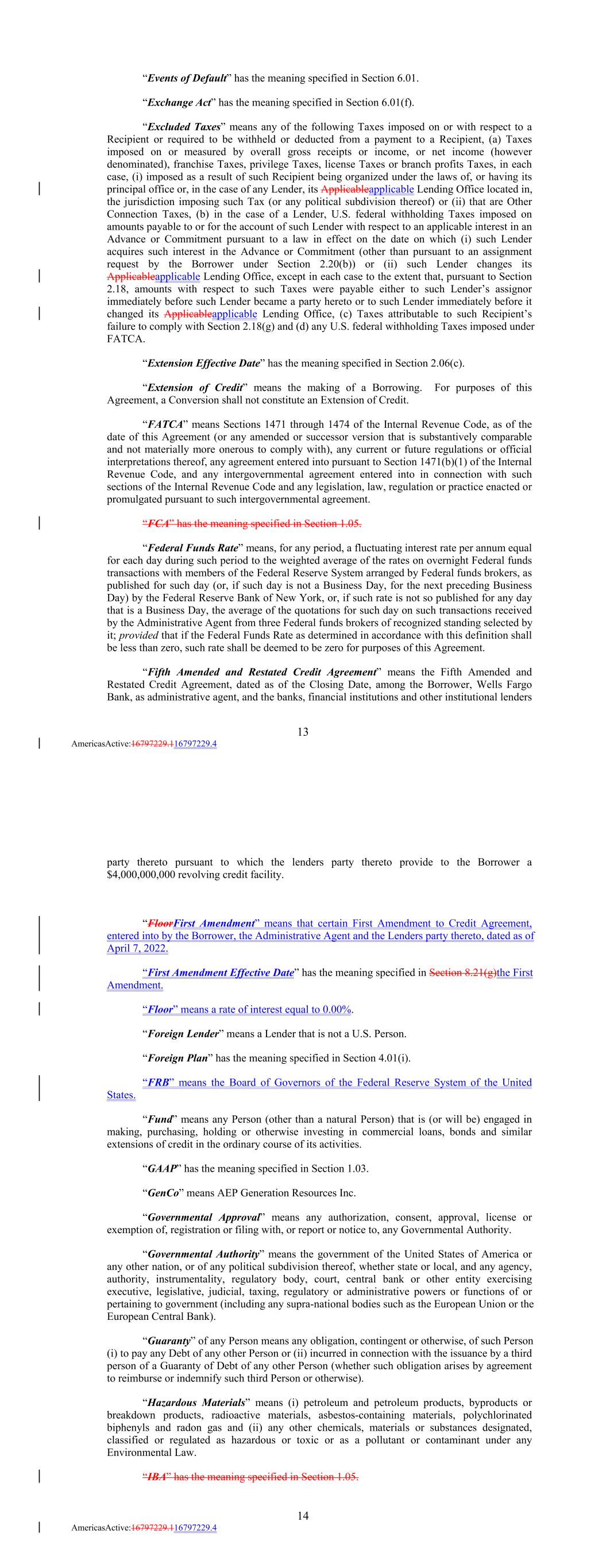 “Events of Default” has the meaning specified in Section 6.01. “Exchange Act” has the meaning specified in Section 6.01(f). “Excluded Taxes” means any of the following Taxes imposed on or with respect to a Recipient or required to be withheld or deducted from a payment to a Recipient, (a) Taxes imposed on or measured by overall gross receipts or income, or net income (however denominated), franchise Taxes, privilege Taxes, license Taxes or branch profits Taxes, in each case, (i) imposed as a result of such Recipient being organized under the laws of, or having its principal office or, in the case of any Lender, its Applicableapplicable Lending Office located in, the jurisdiction imposing such Tax (or any political subdivision thereof) or (ii) that are Other Connection Taxes, (b) in the case of a Lender, U.S. federal withholding Taxes imposed on amounts payable to or for the account of such Lender with respect to an applicable interest in an Advance or Commitment pursuant to a law in effect on the date on which (i) such Lender acquires such interest in the Advance or Commitment (other than pursuant to an assignment request by the Borrower under Section 2.20(b)) or (ii) such Lender changes its Applicableapplicable Lending Office, except in each case to the extent that, pursuant to Section 2.18, amounts with respect to such Taxes were payable either to such Lender’s assignor immediately before such Lender became a party hereto or to such Lender immediately before it changed its Applicableapplicable Lending Office, (c) Taxes attributable to such Recipient’s failure to comply with Section 2.18(g) and (d) any U.S. federal withholding Taxes imposed under FATCA. “Extension Effective Date” has the meaning specified in Section 2.06(c). “Extension of Credit” means the making of a Borrowing. For purposes of this Agreement, a Conversion shall not constitute an Extension of Credit. “FATCA” means Sections 1471 through 1474 of the Internal Revenue Code, as of the date of this Agreement (or any amended or successor version that is substantively comparable and not materially more onerous to comply with), any current or future regulations or official interpretations thereof, any agreement entered into pursuant to Section 1471(b)(1) of the Internal Revenue Code, and any intergovernmental agreement entered into in connection with such sections of the Internal Revenue Code and any legislation, law, regulation or practice enacted or promulgated pursuant to such intergovernmental agreement. “FCA” has the meaning specified in Section 1.05. “Federal Funds Rate” means, for any period, a fluctuating interest rate per annum equal for each day during such period to the weighted average of the rates on overnight Federal funds transactions with members of the Federal Reserve System arranged by Federal funds brokers, as published for such day (or, if such day is not a Business Day, for the next preceding Business Day) by the Federal Reserve Bank of New York, or, if such rate is not so published for any day that is a Business Day, the average of the quotations for such day on such transactions received by the Administrative Agent from three Federal funds brokers of recognized standing selected by it; provided that if the Federal Funds Rate as determined in accordance with this definition shall be less than zero, such rate shall be deemed to be zero for purposes of this Agreement. “Fifth Amended and Restated Credit Agreement” means the Fifth Amended and Restated Credit Agreement, dated as of the Closing Date, among the Borrower, Wells Fargo Bank, as administrative agent, and the banks, financial institutions and other institutional lenders 13 AmericasActive:16797229.116797229.4 party thereto pursuant to which the lenders party thereto provide to the Borrower a $4,000,000,000 revolving credit facility. “FloorFirst Amendment” means that certain First Amendment to Credit Agreement, entered into by the Borrower, the Administrative Agent and the Lenders party thereto, dated as of April 7, 2022. “First Amendment Effective Date” has the meaning specified in Section 8.21(g)the First Amendment. “Floor” means a rate of interest equal to 0.00%. “Foreign Lender” means a Lender that is not a U.S. Person. “Foreign Plan” has the meaning specified in Section 4.01(i). “FRB” means the Board of Governors of the Federal Reserve System of the United States. “Fund” means any Person (other than a natural Person) that is (or will be) engaged in making, purchasing, holding or otherwise investing in commercial loans, bonds and similar extensions of credit in the ordinary course of its activities. “GAAP” has the meaning specified in Section 1.03. “GenCo” means AEP Generation Resources Inc. “Governmental Approval” means any authorization, consent, approval, license or exemption of, registration or filing with, or report or notice to, any Governmental Authority. “Governmental Authority” means the government of the United States of America or any other nation, or of any political subdivision thereof, whether state or local, and any agency, authority, instrumentality, regulatory body, court, central bank or other entity exercising executive, legislative, judicial, taxing, regulatory or administrative powers or functions of or pertaining to government (including any supra-national bodies such as the European Union or the European Central Bank). “Guaranty” of any Person means any obligation, contingent or otherwise, of such Person (i) to pay any Debt of any other Person or (ii) incurred in connection with the issuance by a third person of a Guaranty of Debt of any other Person (whether such obligation arises by agreement to reimburse or indemnify such third Person or otherwise). “Hazardous Materials” means (i) petroleum and petroleum products, byproducts or breakdown products, radioactive materials, asbestos-containing materials, polychlorinated biphenyls and rado