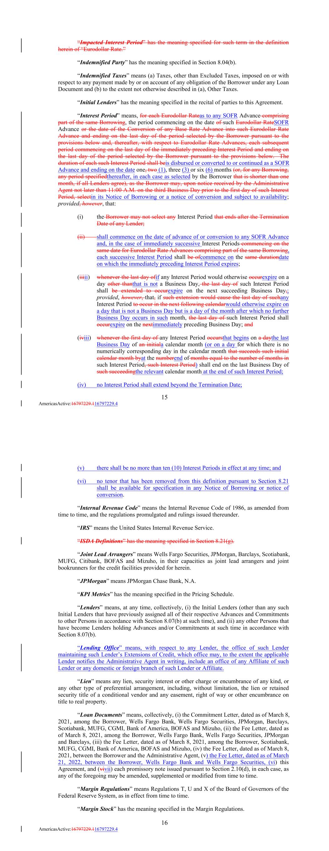 “Impacted Interest Period” has the meaning specified for such term in the definition herein of “Eurodollar Rate.” “Indemnified Party” has the meaning specified in Section 8.04(b). “Indemnified Taxes” means (a) Taxes, other than Excluded Taxes, imposed on or with respect to any payment made by or on account of any obligation of the Borrower under any Loan Document and (b) to the extent not otherwise described in (a), Other Taxes. “Initial Lenders” has the meaning specified in the recital of parties to this Agreement. “Interest Period” means, for each Eurodollar Rateas to any SOFR Advance comprising part of the same Borrowing, the period commencing on the date of such Eurodollar RateSOFR Advance or the date of the Conversion of any Base Rate Advance into such Eurodollar Rate Advance and ending on the last day of the period selected by the Borrower pursuant to the provisions below and, thereafter, with respect to Eurodollar Rate Advances, each subsequent period commencing on the last day of the immediately preceding Interest Period and ending on the last day of the period selected by the Borrower pursuant to the provisions below. The duration of each such Interest Period shall beis disbursed or converted to or continued as a SOFR Advance and ending on the date one, two (1), three (3) or six (6) months (or, for any Borrowing, any period specifiedthereafter, in each case as selected by the Borrower that is shorter than one month, if all Lenders agree), as the Borrower may, upon notice received by the Administrative Agent not later than 11:00 A.M. on the third Business Day prior to the first day of such Interest Period, selectin its Notice of Borrowing or a notice of conversion and subject to availability; provided, however, that: (i) the Borrower may not select any Interest Period that ends after the Termination Date of any Lender; (ii) shall commence on the date of advance of or conversion to any SOFR Advance and, in the case of immediately successive Interest Periods commencing on the same date for Eurodollar Rate Advances comprising part of the same Borrowing, each successive Interest Period shall be ofcommence on the same durationdate on which the immediately preceding Interest Period expires; (iiiii) whenever the last day ofif any Interest Period would otherwise occurexpire on a day other thanthat is not a Business Day, the last day of such Interest Period shall be extended to occurexpire on the next succeeding Business Day,; provided, however, that, if such extension would cause the last day of suchany Interest Period to occur in the next following calendarwould otherwise expire on a day that is not a Business Day but is a day of the month after which no further Business Day occurs in such month, the last day of such Interest Period shall occurexpire on the nextimmediately preceding Business Day; and (iviii) whenever the first day of any Interest Period occursthat begins on a daythe last Business Day of an initiala calendar month (or on a day for which there is no numerically corresponding day in the calendar month that succeeds such initial calendar month byat the numberend of months equal to the number of months in such Interest Period, such Interest Period) shall end on the last Business Day of such succeedingthe relevant calendar month at the end of such Interest Period; (iv) no Interest Period shall extend beyond the Termination Date; 15 AmericasActive:16797229.116797229.4 (v) there shall be no more than ten (10) Interest Periods in effect at any time; and (vi) no tenor that has been removed from this definition pursuant to Section 8.21 shall be available for specification in any Notice of Borrowing or notice of conversion. “Internal Revenue Code” means the Internal Revenue Code of 1986, as amended from time to time, and the regulations promulgated and rulings issued thereunder. “IRS” means the United States Internal Revenue Service. “ISDA Definitions” has the meaning specified in Section 8.21(g). “Joint Lead Arrangers” means Wells Fargo Securities, JPMorgan, Barclays, Scotiabank, MUFG, Citibank, BOFAS and Mizuho, in their capacities as joint lead arrangers and joint bookrunners for the credit facilities provided for herein. “JPMorgan” means JPMorgan Chase Bank, N.A. “KPI Metrics” has the meaning specified in the Pricing Schedule. “Lenders” means, at any time, collectively, (i) the Initial Lenders (other than any such Initial Lenders that have previously assigned all of their respective Advances and Commitments to other Persons in accordance with Section 8.07(b) at such time), and (ii) any other Persons that have become Lenders holding Advances and/or Commitments at such time in accordance with Section 8.07(b). “Lending Office” means, with respect to any Lender, the office of such Lender maintaining such Lender’s Extensions of Credit, which office may, to the extent the applicable Lender notifies the Administrative Agent in writing, include an office of any Affiliate of such Lender or any domestic or foreign branch of such Lender or Affiliate. “Lien” means any lien, security interest or other charge or encumbrance of any kind, or any other type of preferential arrangement, including, without limitation, the lien or retained security title of a conditional vendor and any easement, right of way or other encumbrance on title to real property. “Loan Documents” means, collectively, (i) the Commitment Letter, dated as of March 8, 2021, among the Borrower, Wells Fargo Bank, Wells Fargo Securities, JPMorgan, Barclays, Scotiabank, MUFG, CGMI, Bank of America, BOFAS and Mizuho, (ii) the Fee Letter, dated as of March 8, 2021, among the Borrower, Wells Fargo Bank, Wells Fargo Securities, JPMorgan and Barclays, (iii) the Fee Letter, dated as of March 8, 2021, among the Borrower, Scotiabank, MUFG, CGMI, Bank of America, BOFAS and Mizuho, (iv) the Fee Letter, dated as of March 8, 2021, between the Borrower and the Administrative Ag