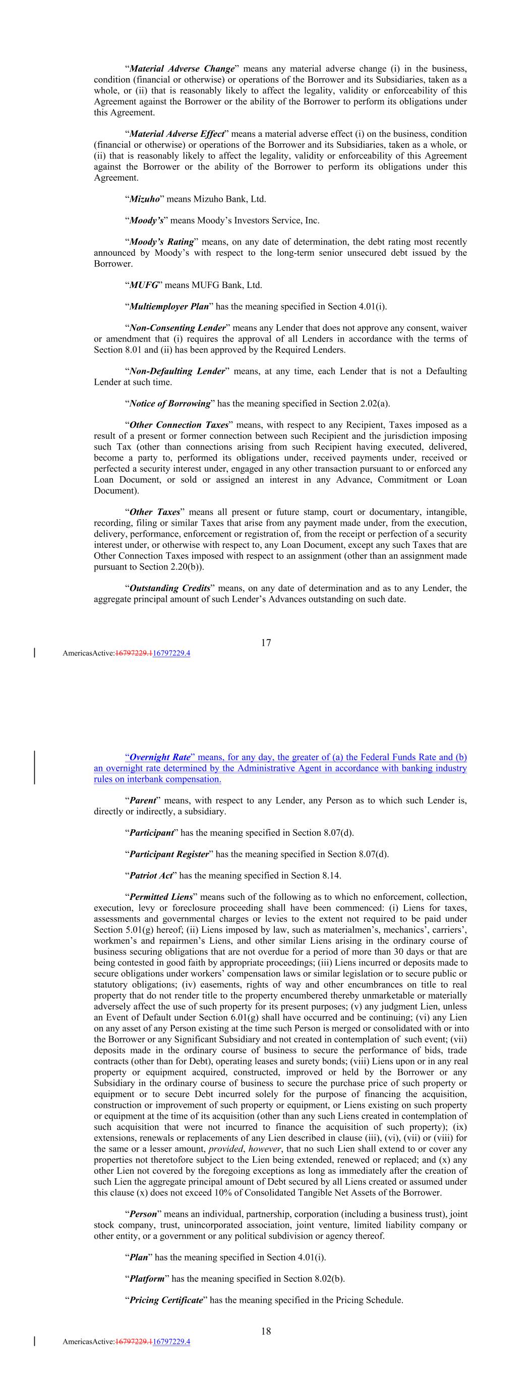 “Material Adverse Change” means any material adverse change (i) in the business, condition (financial or otherwise) or operations of the Borrower and its Subsidiaries, taken as a whole, or (ii) that is reasonably likely to affect the legality, validity or enforceability of this Agreement against the Borrower or the ability of the Borrower to perform its obligations under this Agreement. “Material Adverse Effect” means a material adverse effect (i) on the business, condition (financial or otherwise) or operations of the Borrower and its Subsidiaries, taken as a whole, or (ii) that is reasonably likely to affect the legality, validity or enforceability of this Agreement against the Borrower or the ability of the Borrower to perform its obligations under this Agreement. “Mizuho” means Mizuho Bank, Ltd. “Moody’s” means Moody’s Investors Service, Inc. “Moody’s Rating” means, on any date of determination, the debt rating most recently announced by Moody’s with respect to the long-term senior unsecured debt issued by the Borrower. “MUFG” means MUFG Bank, Ltd. “Multiemployer Plan” has the meaning specified in Section 4.01(i). “Non-Consenting Lender” means any Lender that does not approve any consent, waiver or amendment that (i) requires the approval of all Lenders in accordance with the terms of Section 8.01 and (ii) has been approved by the Required Lenders. “Non-Defaulting Lender” means, at any time, each Lender that is not a Defaulting Lender at such time. “Notice of Borrowing” has the meaning specified in Section 2.02(a). “Other Connection Taxes” means, with respect to any Recipient, Taxes imposed as a result of a present or former connection between such Recipient and the jurisdiction imposing such Tax (other than connections arising from such Recipient having executed, delivered, become a party to, performed its obligations under, received payments under, received or perfected a security interest under, engaged in any other transaction pursuant to or enforced any Loan Document, or sold or assigned an interest in any Advance, Commitment or Loan Document). “Other Taxes” means all present or future stamp, court or documentary, intangible, recording, filing or similar Taxes that arise from any payment made under, from the execution, delivery, performance, enforcement or registration of, from the receipt or perfection of a security interest under, or otherwise with respect to, any Loan Document, except any such Taxes that are Other Connection Taxes imposed with respect to an assignment (other than an assignment made pursuant to Section 2.20(b)). “Outstanding Credits” means, on any date of determination and as to any Lender, the aggregate principal amount of such Lender’s Advances outstanding on such date. 17 AmericasActive:16797229.116797229.4 “Overnight Rate” means, for any day, the greater of (a) the Federal Funds Rate and (b) an overnight rate determined by the Administrative Agent in accordance with banking industry rules on interbank compensation. “Parent” means, with respect to any Lender, any Person as to which such Lender is, directly or indirectly, a subsidiary. “Participant” has the meaning specified in Section 8.07(d). “Participant Register” has the meaning specified in Section 8.07(d). “Patriot Act” has the meaning specified in Section 8.14. “Permitted Liens” means such of the following as to which no enforcement, collection, execution, levy or foreclosure proceeding shall have been commenced: (i) Liens for taxes, assessments and governmental charges or levies to the extent not required to be paid under Section 5.01(g) hereof; (ii) Liens imposed by law, such as materialmen’s, mechanics’, carriers’, workmen’s and repairmen’s Liens, and other similar Liens arising in the ordinary course of business securing obligations that are not overdue for a period of more than 30 days or that are being contested in good faith by appropriate proceedings; (iii) Liens incurred or deposits made to secure obligations under workers’ compensation laws or similar legislation or to secure public or statutory obligations; (iv) easements, rights of way and other encumbrances on title to real property that do not render title to the property encumbered thereby unmarketable or materially adversely affect the use of such property for its present purposes; (v) any judgment Lien, unless an Event of Default under Section 6.01(g) shall have occurred and be continuing; (vi) any Lien on any asset of any Person existing at the time such Person is merged or consolidated with or into the Borrower or any Significant Subsidiary and not created in contemplation of such event; (vii) deposits made in the ordinary course of business to secure the performance of bids, trade contracts (other than for Debt), operating leases and surety bonds; (viii) Liens upon or in any real property or equipment acquired, constructed, improved or held by the Borrower or any Subsidiary in the ordinary course of business to secure the purchase price of such property or equipment or to secure Debt incurred solely for the purpose of financing the acquisition, construction or improvement of such property or equipment, or Liens existing on such property or equipment at the time of its acquisition (other than any such Liens created in contemplation of such acquisition that were not incurred to finance the acquisition of such property); (ix) extensions, renewals or replacements of any Lien described in clause (iii), (vi), (vii) or (viii) for the same or a lesser amount, provided, however, that no such Lien shall extend to or cover any properties not theretofore subject to the Lien being extended, renewed or replaced; and (x) any other Lien not covered by the foregoing exceptions as long as immediately after the creation of such Lien the aggregate principal amount of Debt secured by all Liens created or assumed under this clause (x) does not exceed 10% of