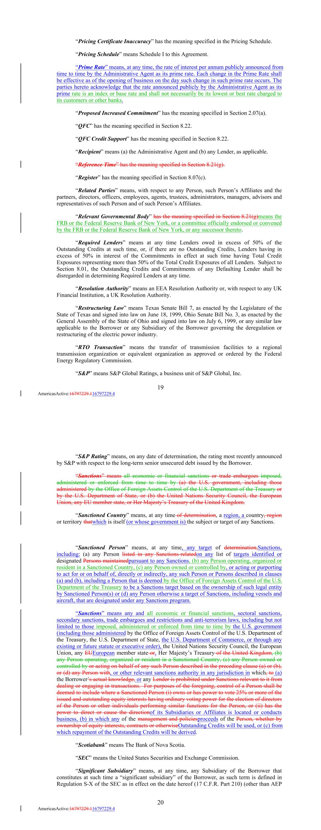 “Pricing Certificate Inaccuracy” has the meaning specified in the Pricing Schedule. “Pricing Schedule” means Schedule I to this Agreement. “Prime Rate” means, at any time, the rate of interest per annum publicly announced from time to time by the Administrative Agent as its prime rate. Each change in the Prime Rate shall be effective as of the opening of business on the day such change in such prime rate occurs. The parties hereto acknowledge that the rate announced publicly by the Administrative Agent as its prime rate is an index or base rate and shall not necessarily be its lowest or best rate charged to its customers or other banks. “Proposed Increased Commitment” has the meaning specified in Section 2.07(a). “QFC” has the meaning specified in Section 8.22. “QFC Credit Support” has the meaning specified in Section 8.22. “Recipient” means (a) the Administrative Agent and (b) any Lender, as applicable. “Reference Time” has the meaning specified in Section 8.21(g). “Register” has the meaning specified in Section 8.07(c). “Related Parties” means, with respect to any Person, such Person’s Affiliates and the partners, directors, officers, employees, agents, trustees, administrators, managers, advisors and representatives of such Person and of such Person’s Affiliates. “Relevant Governmental Body” has the meaning specified in Section 8.21(g)means the FRB or the Federal Reserve Bank of New York, or a committee officially endorsed or convened by the FRB or the Federal Reserve Bank of New York, or any successor thereto. “Required Lenders” means at any time Lenders owed in excess of 50% of the Outstanding Credits at such time, or, if there are no Outstanding Credits, Lenders having in excess of 50% in interest of the Commitments in effect at such time having Total Credit Exposures representing more than 50% of the Total Credit Exposures of all Lenders. Subject to Section 8.01, the Outstanding Credits and Commitments of any Defaulting Lender shall be disregarded in determining Required Lenders at any time. “Resolution Authority” means an EEA Resolution Authority or, with respect to any UK Financial Institution, a UK Resolution Authority. “Restructuring Law” means Texas Senate Bill 7, as enacted by the Legislature of the State of Texas and signed into law on June 18, 1999, Ohio Senate Bill No. 3, as enacted by the General Assembly of the State of Ohio and signed into law on July 6, 1999, or any similar law applicable to the Borrower or any Subsidiary of the Borrower governing the deregulation or restructuring of the electric power industry. “RTO Transaction” means the transfer of transmission facilities to a regional transmission organization or equivalent organization as approved or ordered by the Federal Energy Regulatory Commission. “S&P” means S&P Global Ratings, a business unit of S&P Global, Inc. 19 AmericasActive:16797229.116797229.4 “S&P Rating” means, on any date of determination, the rating most recently announced by S&P with respect to the long-term senior unsecured debt issued by the Borrower. “Sanctions” means all economic or financial sanctions or trade embargoes imposed, administered or enforced from time to time by (a) the U.S. government, including those administered by the Office of Foreign Assets Control of the U.S. Department of the Treasury or by the U.S. Department of State, or (b) the United Nations Security Council, the European Union, any EU member state, or Her Majesty’s Treasury of the United Kingdom. “Sanctioned Country” means, at any time of determination, a region, a country, region or territory thatwhich is itself (or whose government is) the subject or target of any Sanctions. “Sanctioned Person” means, at any time, any target of determination,Sanctions, including: (a) any Person listed in any Sanctions-relatedon any list of targets identified or designated Persons maintainedpursuant to any Sanctions, (b) any Person operating, organized or resident in a Sanctioned Country, (c) any Person owned or controlled by, or acting or purporting to act for or on behalf of, directly or indirectly, any such Person or Persons described in clauses (a) and (b), including a Person that is deemed by the Office of Foreign Assets Control of the U.S. Department of the Treasury to be a Sanctions target based on the ownership of such legal entity by Sanctioned Person(s) or (d) any Person otherwise a target of Sanctions, including vessels and aircraft, that are designated under any Sanctions program. “Sanctions” means any and all economic or financial sanctions, sectoral sanctions, secondary sanctions, trade embargoes and restrictions and anti-terrorism laws, including but not limited to those imposed, administered or enforced from time to time by the U.S. government (including those administered by the Office of Foreign Assets Control of the U.S. Department of the Treasury, the U.S. Department of State, the U.S. Department of Commerce, or through any existing or future statute or executive order), the United Nations Security Council, the European Union, any EUEuropean member state or, Her Majesty’s Treasury of the United Kingdom, (b) any Person operating, organized or resident in a Sanctioned Country, (c) any Person owned or controlled by or acting on behalf of any such Person described in the preceding clause (a) or (b), or (d) any Person with, or other relevant sanctions authority in any jurisdiction in which, to (a) the Borrower’s actual knowledge, or any Lender is prohibited under Sanctions relevant to it from dealing or engaging in transactions. For purposes of the foregoing, control of a Person shall be deemed to include where a Sanctioned Person (i) owns or has power to vote 25% or more of the issued and outstanding equity interests having ordinary voting power for the election of directors of the Person or other individuals performing similar functions for the Person, or (ii) has the pow