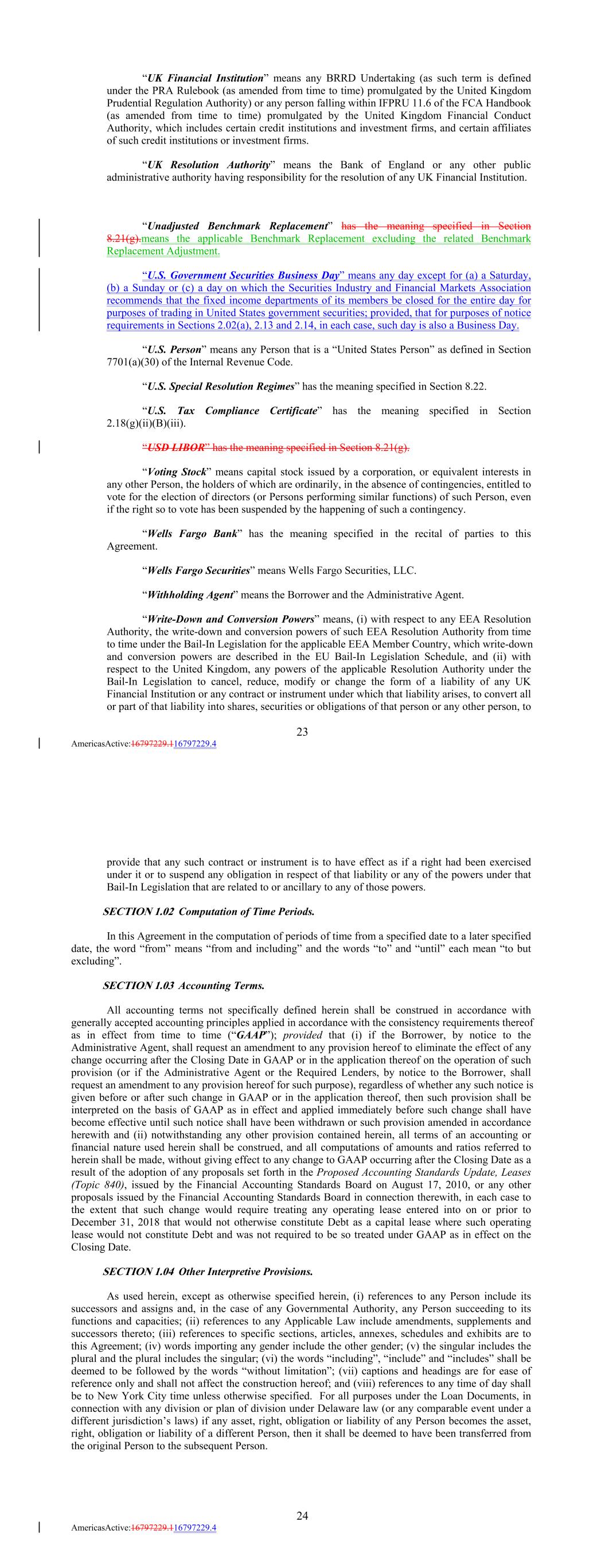 “UK Financial Institution” means any BRRD Undertaking (as such term is defined under the PRA Rulebook (as amended from time to time) promulgated by the United Kingdom Prudential Regulation Authority) or any person falling within IFPRU 11.6 of the FCA Handbook (as amended from time to time) promulgated by the United Kingdom Financial Conduct Authority, which includes certain credit institutions and investment firms, and certain affiliates of such credit institutions or investment firms. “UK Resolution Authority” means the Bank of England or any other public administrative authority having responsibility for the resolution of any UK Financial Institution. “Unadjusted Benchmark Replacement” has the meaning specified in Section 8.21(g).means the applicable Benchmark Replacement excluding the related Benchmark Replacement Adjustment. “U.S. Government Securities Business Day” means any day except for (a) a Saturday, (b) a Sunday or (c) a day on which the Securities Industry and Financial Markets Association recommends that the fixed income departments of its members be closed for the entire day for purposes of trading in United States government securities; provided, that for purposes of notice requirements in Sections 2.02(a), 2.13 and 2.14, in each case, such day is also a Business Day. “U.S. Person” means any Person that is a “United States Person” as defined in Section 7701(a)(30) of the Internal Revenue Code. “U.S. Special Resolution Regimes” has the meaning specified in Section 8.22. “U.S. Tax Compliance Certificate” has the meaning specified in Section 2.18(g)(ii)(B)(iii). “USD LIBOR” has the meaning specified in Section 8.21(g). “Voting Stock” means capital stock issued by a corporation, or equivalent interests in any other Person, the holders of which are ordinarily, in the absence of contingencies, entitled to vote for the election of directors (or Persons performing similar functions) of such Person, even if the right so to vote has been suspended by the happening of such a contingency. “Wells Fargo Bank” has the meaning specified in the recital of parties to this Agreement. “Wells Fargo Securities” means Wells Fargo Securities, LLC. “Withholding Agent” means the Borrower and the Administrative Agent. “Write-Down and Conversion Powers” means, (i) with respect to any EEA Resolution Authority, the write-down and conversion powers of such EEA Resolution Authority from time to time under the Bail-In Legislation for the applicable EEA Member Country, which write-down and conversion powers are described in the EU Bail-In Legislation Schedule, and (ii) with respect to the United Kingdom, any powers of the applicable Resolution Authority under the Bail-In Legislation to cancel, reduce, modify or change the form of a liability of any UK Financial Institution or any contract or instrument under which that liability arises, to convert all or part of that liability into shares, securities or obligations of that person or any other person, to 23 AmericasActive:16797229.116797229.4 provide that any such contract or instrument is to have effect as if a right had been exercised under it or to suspend any obligation in respect of that liability or any of the powers under that Bail-In Legislation that are related to or ancillary to any of those powers. SECTION 1.02 Computation of Time Periods. In this Agreement in the computation of periods of time from a specified date to a later specified date, the word “from” means “from and including” and the words “to” and “until” each mean “to but excluding”. SECTION 1.03 Accounting Terms. All accounting terms not specifically defined herein shall be construed in accordance with generally accepted accounting principles applied in accordance with the consistency requirements thereof as in effect from time to time (“GAAP”); provided that (i) if the Borrower, by notice to the Administrative Agent, shall request an amendment to any provision hereof to eliminate the effect of any change occurring after the Closing Date in GAAP or in the application thereof on the operation of such provision (or if the Administrative Agent or the Required Lenders, by notice to the Borrower, shall request an amendment to any provision hereof for such purpose), regardless of whether any such notice is given before or after such change in GAAP or in the application thereof, then such provision shall be interpreted on the basis of GAAP as in effect and applied immediately before such change shall have become effective until such notice shall have been withdrawn or such provision amended in accordance herewith and (ii) notwithstanding any other provision contained herein, all terms of an accounting or financial nature used herein shall be construed, and all computations of amounts and ratios referred to herein shall be made, without giving effect to any change to GAAP occurring after the Closing Date as a result of the adoption of any proposals set forth in the Proposed Accounting Standards Update, Leases (Topic 840), issued by the Financial Accounting Standards Board on August 17, 2010, or any other proposals issued by the Financial Accounting Standards Board in connection therewith, in each case to the extent that such change would require treating any operating lease entered into on or prior to December 31, 2018 that would not otherwise constitute Debt as a capital lease where such operating lease would not constitute Debt and was not required to be so treated under GAAP as in effect on the Closing Date. SECTION 1.04 Other Interpretive Provisions. As used herein, except as otherwise specified herein, (i) references to any Person include its successors and assigns and, in the case of any Governmental Authority, any Person succeeding to its functions and capacities; (ii) references to any Applicable Law include amendments, supplements and successors thereto; (iii) references to specific sections, articles, an