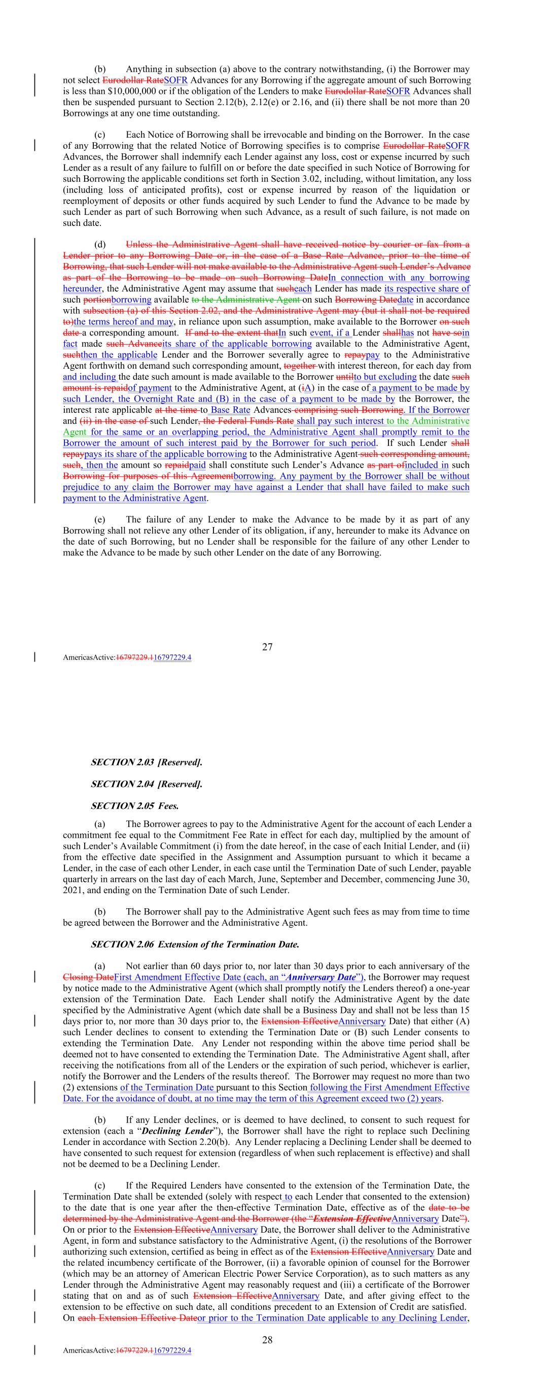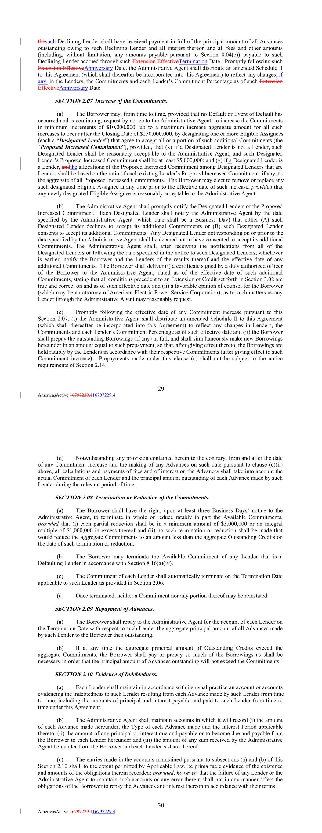 thesuch Declining Lender shall have received payment in full of the principal amount of all Advances outstanding owing to such Declining Lender and all interest thereon and all fees and other amounts (including, without limitation, any amounts payable pursuant to Section 8.04(c)) payable to such Declining Lender accrued through such Extension EffectiveTermination Date. Promptly following such Extension EffectiveAnniversary Date, the Administrative Agent shall distribute an amended Schedule II to this Agreement (which shall thereafter be incorporated into this Agreement) to reflect any changes, if any, in the Lenders, the Commitments and each Lender’s Commitment Percentage as of such Extension EffectiveAnniversary Date. SECTION 2.07 Increase of the Commitments. (a) The Borrower may, from time to time, provided that no Default or Event of Default has occurred and is continuing, request by notice to the Administrative Agent, to increase the Commitments in minimum increments of $10,000,000, up to a maximum increase aggregate amount for all such increases to occur after the Closing Date of $250,000,000, by designating one or more Eligible Assignees (each a “Designated Lender”) that agree to accept all or a portion of such additional Commitments (the “Proposed Increased Commitment”), provided, that (x) if a Designated Lender is not a Lender, such Designated Lender shall be reasonably acceptable to the Administrative Agent, and such Designated Lender’s Proposed Increased Commitment shall be at least $5,000,000; and (y) if a Designated Lender is a Lender, andthe allocations of the Proposed Increased Commitment among Designated Lenders that are Lenders shall be based on the ratio of each existing Lender’s Proposed Increased Commitment, if any, to the aggregate of all Proposed Increased Commitments. The Borrower may elect to remove or replace any such designated Eligible Assignee at any time prior to the effective date of such increase, provided that any newly designated Eligible Assignee is reasonably acceptable to the Administrative Agent. (b) The Administrative Agent shall promptly notify the Designated Lenders of the Proposed Increased Commitment. Each Designated Lender shall notify the Administrative Agent by the date specified by the Administrative Agent (which date shall be a Business Day) that either (A) such Designated Lender declines to accept its additional Commitments or (B) such Designated Lender consents to accept its additional Commitments. Any Designated Lender not responding on or prior to the date specified by the Administrative Agent shall be deemed not to have consented to accept its additional Commitments. The Administrative Agent shall, after receiving the notifications from all of the Designated Lenders or following the date specified in the notice to such Designated Lenders, whichever is earlier, notify the Borrower and the Lenders of the results thereof and the effective date of any additional Commitments. The Borrower shall deliver (i) a certificate signed by a duly authorized officer of the Borrower to the Administrative Agent, dated as of the effective date of such additional Commitments, stating that all conditions precedent to an Extension of Credit set forth in Section 3.02 are true and correct on and as of such effective date and (ii) a favorable opinion of counsel for the Borrower (which may be an attorney of American Electric Power Service Corporation), as to such matters as any Lender through the Administrative Agent may reasonably request. (c) Promptly following the effective date of any Commitment increase pursuant to this Section 2.07, (i) the Administrative Agent shall distribute an amended Schedule II to this Agreement (which shall thereafter be incorporated into this Agreement) to reflect any changes in Lenders, the Commitments and each Lender’s Commitment Percentage as of such effective date and (ii) the Borrower shall prepay the outstanding Borrowings (if any) in full, and shall simultaneously make new Borrowings hereunder in an amount equal to such prepayment, so that, after giving effect thereto, the Borrowings are held ratably by the Lenders in accordance with their respective Commitments (after giving effect to such Commitment increase). Prepayments made under this clause (c) shall not be subject to the notice requirements of Section 2.14. 29 AmericasActive:16797229.116797229.4 (d) Notwithstanding any provision contained herein to the contrary, from and after the date of any Commitment increase and the making of any Advances on such date pursuant to clause (c)(ii) above, all calculations and payments of fees and of interest on the Advances shall take into account the actual Commitment of each Lender and the principal amount outstanding of each Advance made by such Lender during the relevant period of time. SECTION 2.08 Termination or Reduction of the Commitments. (a) The Borrower shall have the right, upon at least three Business Days’ notice to the Administrative Agent, to terminate in whole or reduce ratably in part the Available Commitments, provided that (i) each partial reduction shall be in a minimum amount of $5,000,000 or an integral multiple of $1,000,000 in excess thereof and (ii) no such termination or reduction shall be made that would reduce the aggregate Commitments to an amount less than the aggregate Outstanding Credits on the date of such termination or reduction. (b) The Borrower may terminate the Available Commitment of any Lender that is a Defaulting Lender in accordance with Section 8.16(a)(iv). (c) The Commitment of each Lender shall automatically terminate on the Termination Date applicable to such Lender as provided in Section 2.06. (d) Once terminated, neither a Commitment nor any portion thereof may be reinstated. SECTION 2.09 Repayment of Advances. (a) The Borrower shall repay to the Administrative Agent for the account of each Lender on the Termination Date with respect to such Lender the aggregate princip