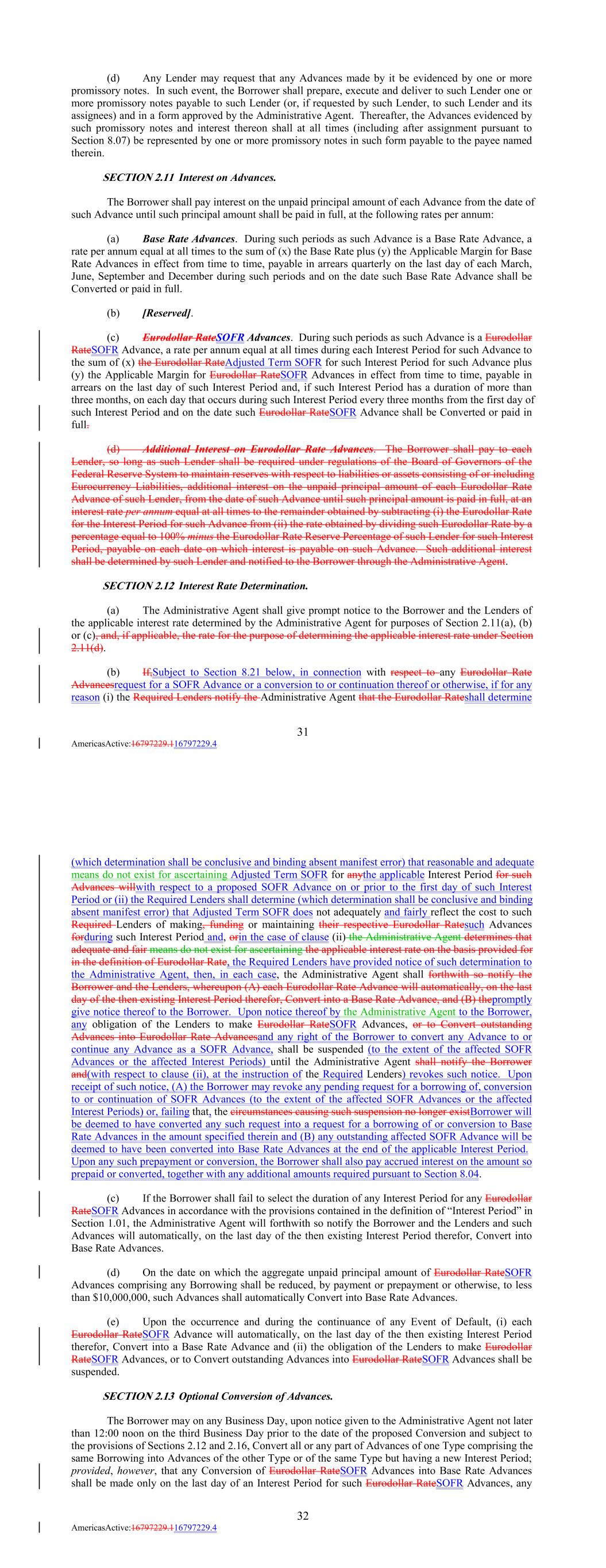 (d) Any Lender may request that any Advances made by it be evidenced by one or more promissory notes. In such event, the Borrower shall prepare, execute and deliver to such Lender one or more promissory notes payable to such Lender (or, if requested by such Lender, to such Lender and its assignees) and in a form approved by the Administrative Agent. Thereafter, the Advances evidenced by such promissory notes and interest thereon shall at all times (including after assignment pursuant to Section 8.07) be represented by one or more promissory notes in such form payable to the payee named therein. SECTION 2.11 Interest on Advances. The Borrower shall pay interest on the unpaid principal amount of each Advance from the date of such Advance until such principal amount shall be paid in full, at the following rates per annum: (a) Base Rate Advances. During such periods as such Advance is a Base Rate Advance, a rate per annum equal at all times to the sum of (x) the Base Rate plus (y) the Applicable Margin for Base Rate Advances in effect from time to time, payable in arrears quarterly on the last day of each March, June, September and December during such periods and on the date such Base Rate Advance shall be Converted or paid in full. (b) [Reserved]. (c) Eurodollar RateSOFR Advances. During such periods as such Advance is a Eurodollar RateSOFR Advance, a rate per annum equal at all times during each Interest Period for such Advance to the sum of (x) the Eurodollar RateAdjusted Term SOFR for such Interest Period for such Advance plus (y) the Applicable Margin for Eurodollar RateSOFR Advances in effect from time to time, payable in arrears on the last day of such Interest Period and, if such Interest Period has a duration of more than three months, on each day that occurs during such Interest Period every three months from the first day of such Interest Period and on the date such Eurodollar RateSOFR Advance shall be Converted or paid in full. (d) Additional Interest on Eurodollar Rate Advances. The Borrower shall pay to each Lender, so long as such Lender shall be required under regulations of the Board of Governors of the Federal Reserve System to maintain reserves with respect to liabilities or assets consisting of or including Eurocurrency Liabilities, additional interest on the unpaid principal amount of each Eurodollar Rate Advance of such Lender, from the date of such Advance until such principal amount is paid in full, at an interest rate per annum equal at all times to the remainder obtained by subtracting (i) the Eurodollar Rate for the Interest Period for such Advance from (ii) the rate obtained by dividing such Eurodollar Rate by a percentage equal to 100% minus the Eurodollar Rate Reserve Percentage of such Lender for such Interest Period, payable on each date on which interest is payable on such Advance. Such additional interest shall be determined by such Lender and notified to the Borrower through the Administrative Agent. SECTION 2.12 Interest Rate Determination. (a) The Administrative Agent shall give prompt notice to the Borrower and the Lenders of the applicable interest rate determined by the Administrative Agent for purposes of Section 2.11(a), (b) or (c), and, if applicable, the rate for the purpose of determining the applicable interest rate under Section 2.11(d). (b) If,Subject to Section 8.21 below, in connection with respect to any Eurodollar Rate Advancesrequest for a SOFR Advance or a conversion to or continuation thereof or otherwise, if for any reason (i) the Required Lenders notify the Administrative Agent that the Eurodollar Rateshall determine 31 AmericasActive:16797229.116797229.4 (which determination shall be conclusive and binding absent manifest error) that reasonable and adequate means do not exist for ascertaining Adjusted Term SOFR for anythe applicable Interest Period for such Advances willwith respect to a proposed SOFR Advance on or prior to the first day of such Interest Period or (ii) the Required Lenders shall determine (which determination shall be conclusive and binding absent manifest error) that Adjusted Term SOFR does not adequately and fairly reflect the cost to such Required Lenders of making, funding or maintaining their respective Eurodollar Ratesuch Advances forduring such Interest Period and, orin the case of clause (ii) the Administrative Agent determines that adequate and fair means do not exist for ascertaining the applicable interest rate on the basis provided for in the definition of Eurodollar Rate, the Required Lenders have provided notice of such determination to the Administrative Agent, then, in each case, the Administrative Agent shall forthwith so notify the Borrower and the Lenders, whereupon (A) each Eurodollar Rate Advance will automatically, on the last day of the then existing Interest Period therefor, Convert into a Base Rate Advance, and (B) thepromptly give notice thereof to the Borrower. Upon notice thereof by the Administrative Agent to the Borrower, any obligation of the Lenders to make Eurodollar RateSOFR Advances, or to Convert outstanding Advances into Eurodollar Rate Advancesand any right of the Borrower to convert any Advance to or continue any Advance as a SOFR Advance, shall be suspended (to the extent of the affected SOFR Advances or the affected Interest Periods) until the Administrative Agent shall notify the Borrower and(with respect to clause (ii), at the instruction of the Required Lenders) revokes such notice. Upon receipt of such notice, (A) the Borrower may revoke any pending request for a borrowing of, conversion to or continuation of SOFR Advances (to the extent of the affected SOFR Advances or the affected Interest Periods) or, failing that, the circumstances causing such suspension no longer existBorrower will be deemed to have converted any such request into a request for a borrowing of or conversion to Base Rate Advances in the amount specified therein and (B) any outstanding affected SOFR Adv