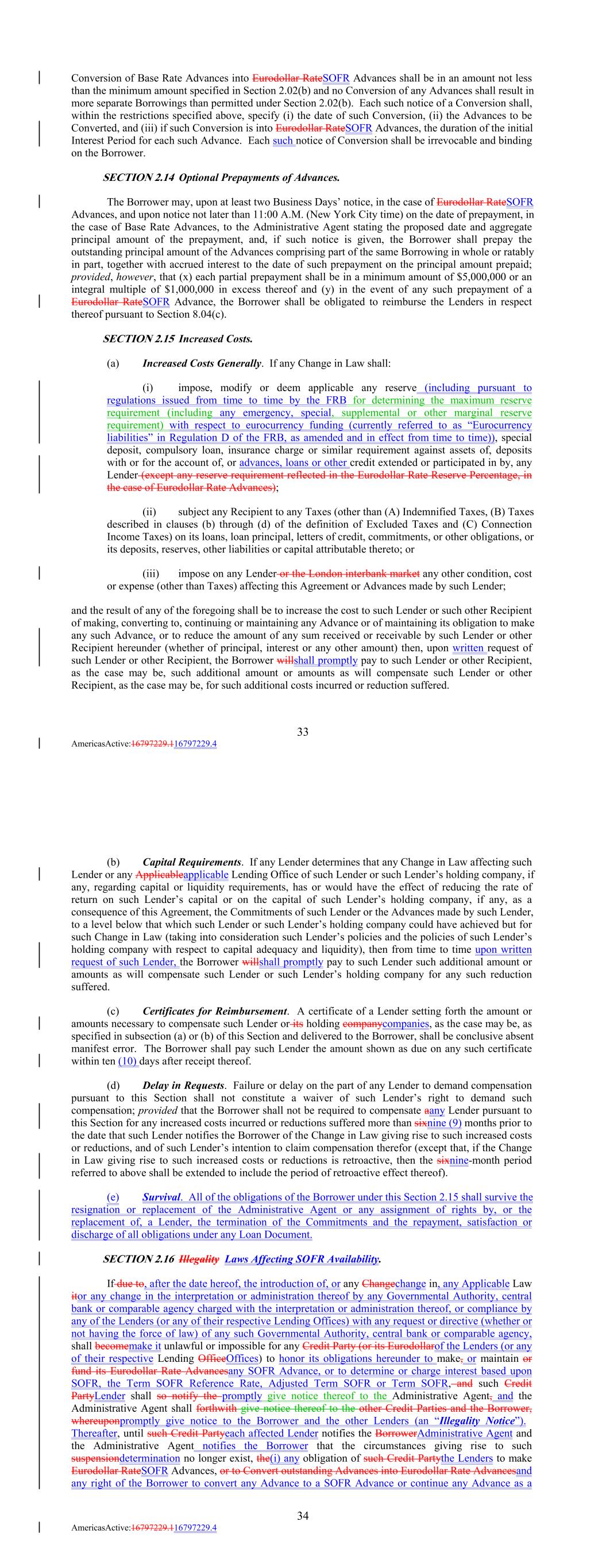 Conversion of Base Rate Advances into Eurodollar RateSOFR Advances shall be in an amount not less than the minimum amount specified in Section 2.02(b) and no Conversion of any Advances shall result in more separate Borrowings than permitted under Section 2.02(b). Each such notice of a Conversion shall, within the restrictions specified above, specify (i) the date of such Conversion, (ii) the Advances to be Converted, and (iii) if such Conversion is into Eurodollar RateSOFR Advances, the duration of the initial Interest Period for each such Advance. Each such notice of Conversion shall be irrevocable and binding on the Borrower. SECTION 2.14 Optional Prepayments of Advances. The Borrower may, upon at least two Business Days’ notice, in the case of Eurodollar RateSOFR Advances, and upon notice not later than 11:00 A.M. (New York City time) on the date of prepayment, in the case of Base Rate Advances, to the Administrative Agent stating the proposed date and aggregate principal amount of the prepayment, and, if such notice is given, the Borrower shall prepay the outstanding principal amount of the Advances comprising part of the same Borrowing in whole or ratably in part, together with accrued interest to the date of such prepayment on the principal amount prepaid; provided, however, that (x) each partial prepayment shall be in a minimum amount of $5,000,000 or an integral multiple of $1,000,000 in excess thereof and (y) in the event of any such prepayment of a Eurodollar RateSOFR Advance, the Borrower shall be obligated to reimburse the Lenders in respect thereof pursuant to Section 8.04(c). SECTION 2.15 Increased Costs. (a) Increased Costs Generally. If any Change in Law shall: (i) impose, modify or deem applicable any reserve (including pursuant to regulations issued from time to time by the FRB for determining the maximum reserve requirement (including any emergency, special, supplemental or other marginal reserve requirement) with respect to eurocurrency funding (currently referred to as “Eurocurrency liabilities” in Regulation D of the FRB, as amended and in effect from time to time)), special deposit, compulsory loan, insurance charge or similar requirement against assets of, deposits with or for the account of, or advances, loans or other credit extended or participated in by, any Lender (except any reserve requirement reflected in the Eurodollar Rate Reserve Percentage, in the case of Eurodollar Rate Advances); (ii) subject any Recipient to any Taxes (other than (A) Indemnified Taxes, (B) Taxes described in clauses (b) through (d) of the definition of Excluded Taxes and (C) Connection Income Taxes) on its loans, loan principal, letters of credit, commitments, or other obligations, or its deposits, reserves, other liabilities or capital attributable thereto; or (iii) impose on any Lender or the London interbank market any other condition, cost or expense (other than Taxes) affecting this Agreement or Advances made by such Lender; and the result of any of the foregoing shall be to increase the cost to such Lender or such other Recipient of making, converting to, continuing or maintaining any Advance or of maintaining its obligation to make any such Advance, or to reduce the amount of any sum received or receivable by such Lender or other Recipient hereunder (whether of principal, interest or any other amount) then, upon written request of such Lender or other Recipient, the Borrower willshall promptly pay to such Lender or other Recipient, as the case may be, such additional amount or amounts as will compensate such Lender or other Recipient, as the case may be, for such additional costs incurred or reduction suffered. 33 AmericasActive:16797229.116797229.4 (b) Capital Requirements. If any Lender determines that any Change in Law affecting such Lender or any Applicableapplicable Lending Office of such Lender or such Lender’s holding company, if any, regarding capital or liquidity requirements, has or would have the effect of reducing the rate of return on such Lender’s capital or on the capital of such Lender’s holding company, if any, as a consequence of this Agreement, the Commitments of such Lender or the Advances made by such Lender, to a level below that which such Lender or such Lender’s holding company could have achieved but for such Change in Law (taking into consideration such Lender’s policies and the policies of such Lender’s holding company with respect to capital adequacy and liquidity), then from time to time upon written request of such Lender, the Borrower willshall promptly pay to such Lender such additional amount or amounts as will compensate such Lender or such Lender’s holding company for any such reduction suffered. (c) Certificates for Reimbursement. A certificate of a Lender setting forth the amount or amounts necessary to compensate such Lender or its holding companycompanies, as the case may be, as specified in subsection (a) or (b) of this Section and delivered to the Borrower, shall be conclusive absent manifest error. The Borrower shall pay such Lender the amount shown as due on any such certificate within ten (10) days after receipt thereof. (d) Delay in Requests. Failure or delay on the part of any Lender to demand compensation pursuant to this Section shall not constitute a waiver of such Lender’s right to demand such compensation; provided that the Borrower shall not be required to compensate aany Lender pursuant to this Section for any increased costs incurred or reductions suffered more than sixnine (9) months prior to the date that such Lender notifies the Borrower of the Change in Law giving rise to such increased costs or reductions, and of such Lender’s intention to claim compensation therefor (except that, if the Change in Law giving rise to such increased costs or reductions is retroactive, then the sixnine-month period referred to above shall be extended to include the period of retroactive effect thereof). (e) Surviv