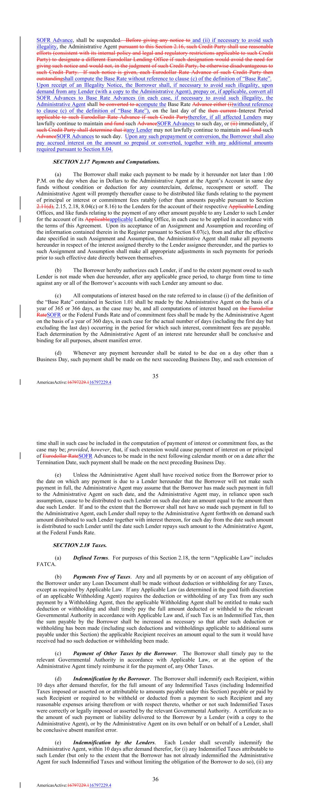 SOFR Advance, shall be suspended. Before giving any notice to and (ii) if necessary to avoid such illegality, the Administrative Agent pursuant to this Section 2.16, such Credit Party shall use reasonable efforts (consistent with its internal policy and legal and regulatory restrictions applicable to such Credit Party) to designate a different Eurodollar Lending Office if such designation would avoid the need for giving such notice and would not, in the judgment of such Credit Party, be otherwise disadvantageous to such Credit Party. If such notice is given, each Eurodollar Rate Advance of such Credit Party then outstandingshall compute the Base Rate without reference to clause (c) of the definition of “Base Rate”. Upon receipt of an Illegality Notice, the Borrower shall, if necessary to avoid such illegality, upon demand from any Lender (with a copy to the Administrative Agent), prepay or, if applicable, convert all SOFR Advances to Base Rate Advances (in each case, if necessary to avoid such illegality, the Administrative Agent shall be converted to acompute the Base Rate Advance either (i)without reference to clause (c) of the definition of “Base Rate”), on the last day of the then current Interest Period applicable to such Eurodollar Rate Advance if such Credit Partytherefor, if all affected Lenders may lawfully continue to maintain and fund such AdvanceSOFR Advances to such day, or (ii) immediately, if such Credit Party shall determine that itany Lender may not lawfully continue to maintain and fund such AdvanceSOFR Advances to such day. Upon any such prepayment or conversion, the Borrower shall also pay accrued interest on the amount so prepaid or converted, together with any additional amounts required pursuant to Section 8.04. SECTION 2.17 Payments and Computations. (a) The Borrower shall make each payment to be made by it hereunder not later than 1:00 P.M. on the day when due in Dollars to the Administrative Agent at the Agent’s Account in same day funds without condition or deduction for any counterclaim, defense, recoupment or setoff. The Administrative Agent will promptly thereafter cause to be distributed like funds relating to the payment of principal or interest or commitment fees ratably (other than amounts payable pursuant to Section 2.11(d), 2.15, 2.18, 8.04(c) or 8.16) to the Lenders for the account of their respective Applicable Lending Offices, and like funds relating to the payment of any other amount payable to any Lender to such Lender for the account of its Applicableapplicable Lending Office, in each case to be applied in accordance with the terms of this Agreement. Upon its acceptance of an Assignment and Assumption and recording of the information contained therein in the Register pursuant to Section 8.07(c), from and after the effective date specified in such Assignment and Assumption, the Administrative Agent shall make all payments hereunder in respect of the interest assigned thereby to the Lender assignee thereunder, and the parties to such Assignment and Assumption shall make all appropriate adjustments in such payments for periods prior to such effective date directly between themselves. (b) The Borrower hereby authorizes each Lender, if and to the extent payment owed to such Lender is not made when due hereunder, after any applicable grace period, to charge from time to time against any or all of the Borrower’s accounts with such Lender any amount so due. (c) All computations of interest based on the rate referred to in clause (i) of the definition of the “Base Rate” contained in Section 1.01 shall be made by the Administrative Agent on the basis of a year of 365 or 366 days, as the case may be, and all computations of interest based on the Eurodollar RateSOFR or the Federal Funds Rate and of commitment fees shall be made by the Administrative Agent on the basis of a year of 360 days, in each case for the actual number of days (including the first day but excluding the last day) occurring in the period for which such interest, commitment fees are payable. Each determination by the Administrative Agent of an interest rate hereunder shall be conclusive and binding for all purposes, absent manifest error. (d) Whenever any payment hereunder shall be stated to be due on a day other than a Business Day, such payment shall be made on the next succeeding Business Day, and such extension of 35 AmericasActive:16797229.116797229.4 time shall in such case be included in the computation of payment of interest or commitment fees, as the case may be; provided, however, that, if such extension would cause payment of interest on or principal of Eurodollar RateSOFR Advances to be made in the next following calendar month or on a date after the Termination Date, such payment shall be made on the next preceding Business Day. (e) Unless the Administrative Agent shall have received notice from the Borrower prior to the date on which any payment is due to a Lender hereunder that the Borrower will not make such payment in full, the Administrative Agent may assume that the Borrower has made such payment in full to the Administrative Agent on such date, and the Administrative Agent may, in reliance upon such assumption, cause to be distributed to each Lender on such due date an amount equal to the amount then due such Lender. If and to the extent that the Borrower shall not have so made such payment in full to the Administrative Agent, each Lender shall repay to the Administrative Agent forthwith on demand such amount distributed to such Lender together with interest thereon, for each day from the date such amount is distributed to such Lender until the date such Lender repays such amount to the Administrative Agent, at the Federal Funds Rate. SECTION 2.18 Taxes. (a) Defined Terms. For purposes of this Section 2.18, the term “Applicable Law” includes FATCA. (b) Payments Free of Taxes. Any and all payments by or on account of any obligation of the Borrower un
