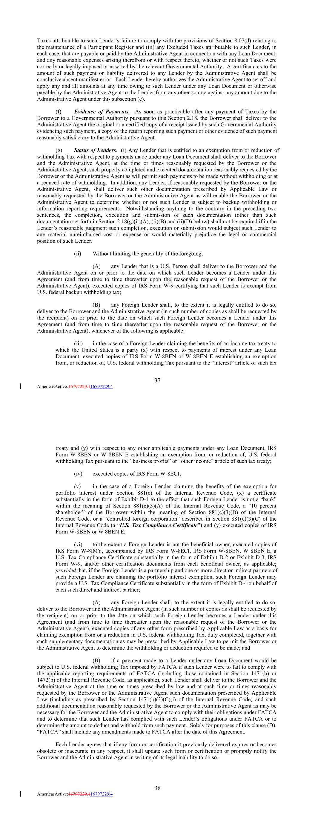 Taxes attributable to such Lender’s failure to comply with the provisions of Section 8.07(d) relating to the maintenance of a Participant Register and (iii) any Excluded Taxes attributable to such Lender, in each case, that are payable or paid by the Administrative Agent in connection with any Loan Document, and any reasonable expenses arising therefrom or with respect thereto, whether or not such Taxes were correctly or legally imposed or asserted by the relevant Governmental Authority. A certificate as to the amount of such payment or liability delivered to any Lender by the Administrative Agent shall be conclusive absent manifest error. Each Lender hereby authorizes the Administrative Agent to set off and apply any and all amounts at any time owing to such Lender under any Loan Document or otherwise payable by the Administrative Agent to the Lender from any other source against any amount due to the Administrative Agent under this subsection (e). (f) Evidence of Payments. As soon as practicable after any payment of Taxes by the Borrower to a Governmental Authority pursuant to this Section 2.18, the Borrower shall deliver to the Administrative Agent the original or a certified copy of a receipt issued by such Governmental Authority evidencing such payment, a copy of the return reporting such payment or other evidence of such payment reasonably satisfactory to the Administrative Agent. (g) Status of Lenders. (i) Any Lender that is entitled to an exemption from or reduction of withholding Tax with respect to payments made under any Loan Document shall deliver to the Borrower and the Administrative Agent, at the time or times reasonably requested by the Borrower or the Administrative Agent, such properly completed and executed documentation reasonably requested by the Borrower or the Administrative Agent as will permit such payments to be made without withholding or at a reduced rate of withholding. In addition, any Lender, if reasonably requested by the Borrower or the Administrative Agent, shall deliver such other documentation prescribed by Applicable Law or reasonably requested by the Borrower or the Administrative Agent as will enable the Borrower or the Administrative Agent to determine whether or not such Lender is subject to backup withholding or information reporting requirements. Notwithstanding anything to the contrary in the preceding two sentences, the completion, execution and submission of such documentation (other than such documentation set forth in Section 2.18(g)(ii)(A), (ii)(B) and (ii)(D) below) shall not be required if in the Lender’s reasonable judgment such completion, execution or submission would subject such Lender to any material unreimbursed cost or expense or would materially prejudice the legal or commercial position of such Lender. (ii) Without limiting the generality of the foregoing, (A) any Lender that is a U.S. Person shall deliver to the Borrower and the Administrative Agent on or prior to the date on which such Lender becomes a Lender under this Agreement (and from time to time thereafter upon the reasonable request of the Borrower or the Administrative Agent), executed copies of IRS Form W-9 certifying that such Lender is exempt from U.S. federal backup withholding tax; (B) any Foreign Lender shall, to the extent it is legally entitled to do so, deliver to the Borrower and the Administrative Agent (in such number of copies as shall be requested by the recipient) on or prior to the date on which such Foreign Lender becomes a Lender under this Agreement (and from time to time thereafter upon the reasonable request of the Borrower or the Administrative Agent), whichever of the following is applicable: (iii) in the case of a Foreign Lender claiming the benefits of an income tax treaty to which the United States is a party (x) with respect to payments of interest under any Loan Document, executed copies of IRS Form W-8BEN or W 8BEN E establishing an exemption from, or reduction of, U.S. federal withholding Tax pursuant to the “interest” article of such tax 37 AmericasActive:16797229.116797229.4 treaty and (y) with respect to any other applicable payments under any Loan Document, IRS Form W-8BEN or W 8BEN E establishing an exemption from, or reduction of, U.S. federal withholding Tax pursuant to the “business profits” or “other income” article of such tax treaty; (iv) executed copies of IRS Form W-8ECI; (v) in the case of a Foreign Lender claiming the benefits of the exemption for portfolio interest under Section 881(c) of the Internal Revenue Code, (x) a certificate substantially in the form of Exhibit D-1 to the effect that such Foreign Lender is not a “bank” within the meaning of Section 881(c)(3)(A) of the Internal Revenue Code, a “10 percent shareholder” of the Borrower within the meaning of Section 881(c)(3)(B) of the Internal Revenue Code, or a “controlled foreign corporation” described in Section 881(c)(3)(C) of the Internal Revenue Code (a “U.S. Tax Compliance Certificate”) and (y) executed copies of IRS Form W-8BEN or W 8BEN E; (vi) to the extent a Foreign Lender is not the beneficial owner, executed copies of IRS Form W-8IMY, accompanied by IRS Form W-8ECI, IRS Form W-8BEN, W 8BEN E, a U.S. Tax Compliance Certificate substantially in the form of Exhibit D-2 or Exhibit D-3, IRS Form W-9, and/or other certification documents from each beneficial owner, as applicable; provided that, if the Foreign Lender is a partnership and one or more direct or indirect partners of such Foreign Lender are claiming the portfolio interest exemption, such Foreign Lender may provide a U.S. Tax Compliance Certificate substantially in the form of Exhibit D-4 on behalf of each such direct and indirect partner; (A) any Foreign Lender shall, to the extent it is legally entitled to do so, deliver to the Borrower and the Administrative Agent (in such number of copies as shall be requested by the recipient) on or prior to the date on which suc
