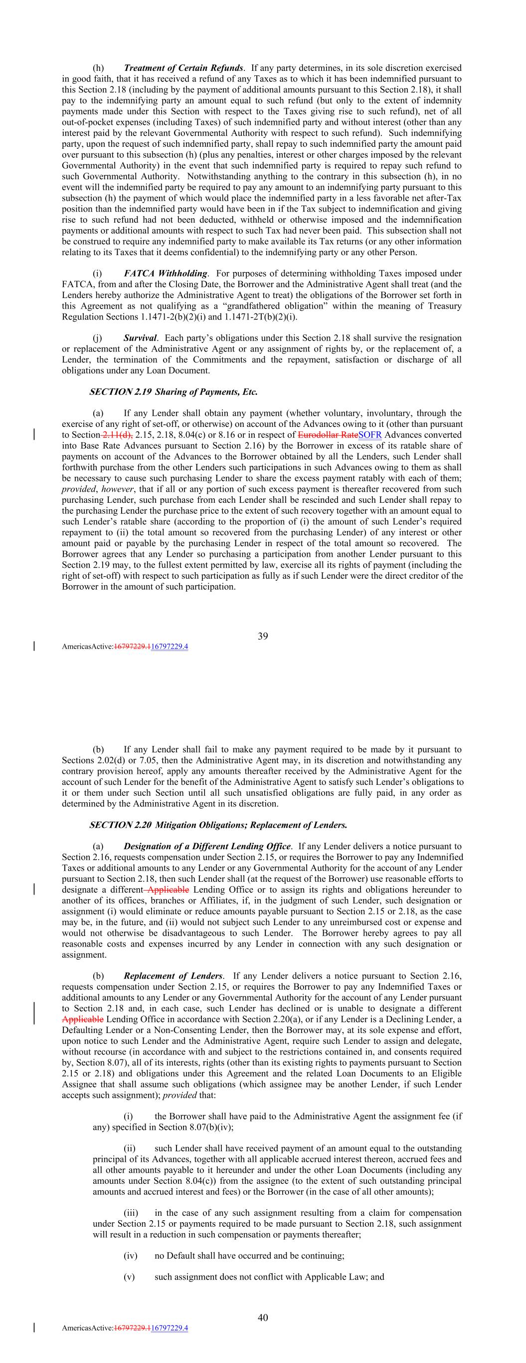 (h) Treatment of Certain Refunds. If any party determines, in its sole discretion exercised in good faith, that it has received a refund of any Taxes as to which it has been indemnified pursuant to this Section 2.18 (including by the payment of additional amounts pursuant to this Section 2.18), it shall pay to the indemnifying party an amount equal to such refund (but only to the extent of indemnity payments made under this Section with respect to the Taxes giving rise to such refund), net of all out-of-pocket expenses (including Taxes) of such indemnified party and without interest (other than any interest paid by the relevant Governmental Authority with respect to such refund). Such indemnifying party, upon the request of such indemnified party, shall repay to such indemnified party the amount paid over pursuant to this subsection (h) (plus any penalties, interest or other charges imposed by the relevant Governmental Authority) in the event that such indemnified party is required to repay such refund to such Governmental Authority. Notwithstanding anything to the contrary in this subsection (h), in no event will the indemnified party be required to pay any amount to an indemnifying party pursuant to this subsection (h) the payment of which would place the indemnified party in a less favorable net after-Tax position than the indemnified party would have been in if the Tax subject to indemnification and giving rise to such refund had not been deducted, withheld or otherwise imposed and the indemnification payments or additional amounts with respect to such Tax had never been paid. This subsection shall not be construed to require any indemnified party to make available its Tax returns (or any other information relating to its Taxes that it deems confidential) to the indemnifying party or any other Person. (i) FATCA Withholding. For purposes of determining withholding Taxes imposed under FATCA, from and after the Closing Date, the Borrower and the Administrative Agent shall treat (and the Lenders hereby authorize the Administrative Agent to treat) the obligations of the Borrower set forth in this Agreement as not qualifying as a “grandfathered obligation” within the meaning of Treasury Regulation Sections 1.1471-2(b)(2)(i) and 1.1471-2T(b)(2)(i). (j) Survival. Each party’s obligations under this Section 2.18 shall survive the resignation or replacement of the Administrative Agent or any assignment of rights by, or the replacement of, a Lender, the termination of the Commitments and the repayment, satisfaction or discharge of all obligations under any Loan Document. SECTION 2.19 Sharing of Payments, Etc. (a) If any Lender shall obtain any payment (whether voluntary, involuntary, through the exercise of any right of set-off, or otherwise) on account of the Advances owing to it (other than pursuant to Section 2.11(d), 2.15, 2.18, 8.04(c) or 8.16 or in respect of Eurodollar RateSOFR Advances converted into Base Rate Advances pursuant to Section 2.16) by the Borrower in excess of its ratable share of payments on account of the Advances to the Borrower obtained by all the Lenders, such Lender shall forthwith purchase from the other Lenders such participations in such Advances owing to them as shall be necessary to cause such purchasing Lender to share the excess payment ratably with each of them; provided, however, that if all or any portion of such excess payment is thereafter recovered from such purchasing Lender, such purchase from each Lender shall be rescinded and such Lender shall repay to the purchasing Lender the purchase price to the extent of such recovery together with an amount equal to such Lender’s ratable share (according to the proportion of (i) the amount of such Lender’s required repayment to (ii) the total amount so recovered from the purchasing Lender) of any interest or other amount paid or payable by the purchasing Lender in respect of the total amount so recovered. The Borrower agrees that any Lender so purchasing a participation from another Lender pursuant to this Section 2.19 may, to the fullest extent permitted by law, exercise all its rights of payment (including the right of set-off) with respect to such participation as fully as if such Lender were the direct creditor of the Borrower in the amount of such participation. 39 AmericasActive:16797229.116797229.4 (b) If any Lender shall fail to make any payment required to be made by it pursuant to Sections 2.02(d) or 7.05, then the Administrative Agent may, in its discretion and notwithstanding any contrary provision hereof, apply any amounts thereafter received by the Administrative Agent for the account of such Lender for the benefit of the Administrative Agent to satisfy such Lender’s obligations to it or them under such Section until all such unsatisfied obligations are fully paid, in any order as determined by the Administrative Agent in its discretion. SECTION 2.20 Mitigation Obligations; Replacement of Lenders. (a) Designation of a Different Lending Office. If any Lender delivers a notice pursuant to Section 2.16, requests compensation under Section 2.15, or requires the Borrower to pay any Indemnified Taxes or additional amounts to any Lender or any Governmental Authority for the account of any Lender pursuant to Section 2.18, then such Lender shall (at the request of the Borrower) use reasonable efforts to designate a different Applicable Lending Office or to assign its rights and obligations hereunder to another of its offices, branches or Affiliates, if, in the judgment of such Lender, such designation or assignment (i) would eliminate or reduce amounts payable pursuant to Section 2.15 or 2.18, as the case may be, in the future, and (ii) would not subject such Lender to any unreimbursed cost or expense and would not otherwise be disadvantageous to such Lender. The Borrower hereby agrees to pay all reasonable costs and expenses incurred by any Lender in connection with any such designation or assi