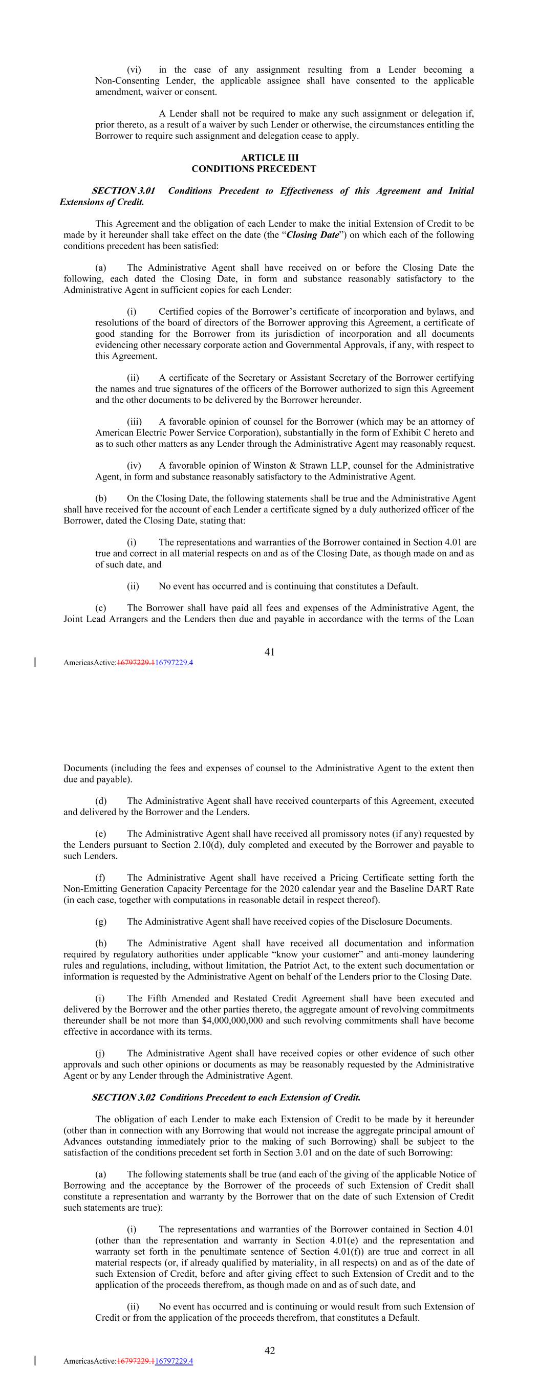 (vi) in the case of any assignment resulting from a Lender becoming a Non-Consenting Lender, the applicable assignee shall have consented to the applicable amendment, waiver or consent. A Lender shall not be required to make any such assignment or delegation if, prior thereto, as a result of a waiver by such Lender or otherwise, the circumstances entitling the Borrower to require such assignment and delegation cease to apply. ARTICLE III CONDITIONS PRECEDENT SECTION 3.01 Conditions Precedent to Effectiveness of this Agreement and Initial Extensions of Credit. This Agreement and the obligation of each Lender to make the initial Extension of Credit to be made by it hereunder shall take effect on the date (the “Closing Date”) on which each of the following conditions precedent has been satisfied: (a) The Administrative Agent shall have received on or before the Closing Date the following, each dated the Closing Date, in form and substance reasonably satisfactory to the Administrative Agent in sufficient copies for each Lender: (i) Certified copies of the Borrower’s certificate of incorporation and bylaws, and resolutions of the board of directors of the Borrower approving this Agreement, a certificate of good standing for the Borrower from its jurisdiction of incorporation and all documents evidencing other necessary corporate action and Governmental Approvals, if any, with respect to this Agreement. (ii) A certificate of the Secretary or Assistant Secretary of the Borrower certifying the names and true signatures of the officers of the Borrower authorized to sign this Agreement and the other documents to be delivered by the Borrower hereunder. (iii) A favorable opinion of counsel for the Borrower (which may be an attorney of American Electric Power Service Corporation), substantially in the form of Exhibit C hereto and as to such other matters as any Lender through the Administrative Agent may reasonably request. (iv) A favorable opinion of Winston & Strawn LLP, counsel for the Administrative Agent, in form and substance reasonably satisfactory to the Administrative Agent. (b) On the Closing Date, the following statements shall be true and the Administrative Agent shall have received for the account of each Lender a certificate signed by a duly authorized officer of the Borrower, dated the Closing Date, stating that: (i) The representations and warranties of the Borrower contained in Section 4.01 are true and correct in all material respects on and as of the Closing Date, as though made on and as of such date, and (ii) No event has occurred and is continuing that constitutes a Default. (c) The Borrower shall have paid all fees and expenses of the Administrative Agent, the Joint Lead Arrangers and the Lenders then due and payable in accordance with the terms of the Loan 41 AmericasActive:16797229.116797229.4 Documents (including the fees and expenses of counsel to the Administrative Agent to the extent then due and payable). (d) The Administrative Agent shall have received counterparts of this Agreement, executed and delivered by the Borrower and the Lenders. (e) The Administrative Agent shall have received all promissory notes (if any) requested by the Lenders pursuant to Section 2.10(d), duly completed and executed by the Borrower and payable to such Lenders. (f) The Administrative Agent shall have received a Pricing Certificate setting forth the Non-Emitting Generation Capacity Percentage for the 2020 calendar year and the Baseline DART Rate (in each case, together with computations in reasonable detail in respect thereof). (g) The Administrative Agent shall have received copies of the Disclosure Documents. (h) The Administrative Agent shall have received all documentation and information required by regulatory authorities under applicable “know your customer” and anti-money laundering rules and regulations, including, without limitation, the Patriot Act, to the extent such documentation or information is requested by the Administrative Agent on behalf of the Lenders prior to the Closing Date. (i) The Fifth Amended and Restated Credit Agreement shall have been executed and delivered by the Borrower and the other parties thereto, the aggregate amount of revolving commitments thereunder shall be not more than $4,000,000,000 and such revolving commitments shall have become effective in accordance with its terms. (j) The Administrative Agent shall have received copies or other evidence of such other approvals and such other opinions or documents as may be reasonably requested by the Administrative Agent or by any Lender through the Administrative Agent. SECTION 3.02 Conditions Precedent to each Extension of Credit. The obligation of each Lender to make each Extension of Credit to be made by it hereunder (other than in connection with any Borrowing that would not increase the aggregate principal amount of Advances outstanding immediately prior to the making of such Borrowing) shall be subject to the satisfaction of the conditions precedent set forth in Section 3.01 and on the date of such Borrowing: (a) The following statements shall be true (and each of the giving of the applicable Notice of Borrowing and the acceptance by the Borrower of the proceeds of such Extension of Credit shall constitute a representation and warranty by the Borrower that on the date of such Extension of Credit such statements are true): (i) The representations and warranties of the Borrower contained in Section 4.01 (other than the representation and warranty in Section 4.01(e) and the representation and warranty set forth in the penultimate sentence of Section 4.01(f)) are true and correct in all material respects (or, if already qualified by materiality, in all respects) on and as of the date of such Extension of Credit, before and after giving effect to such Extension of Credit and to the application of the proceeds therefrom, as though made on and as of such date, and (ii) No event has occurred and is c