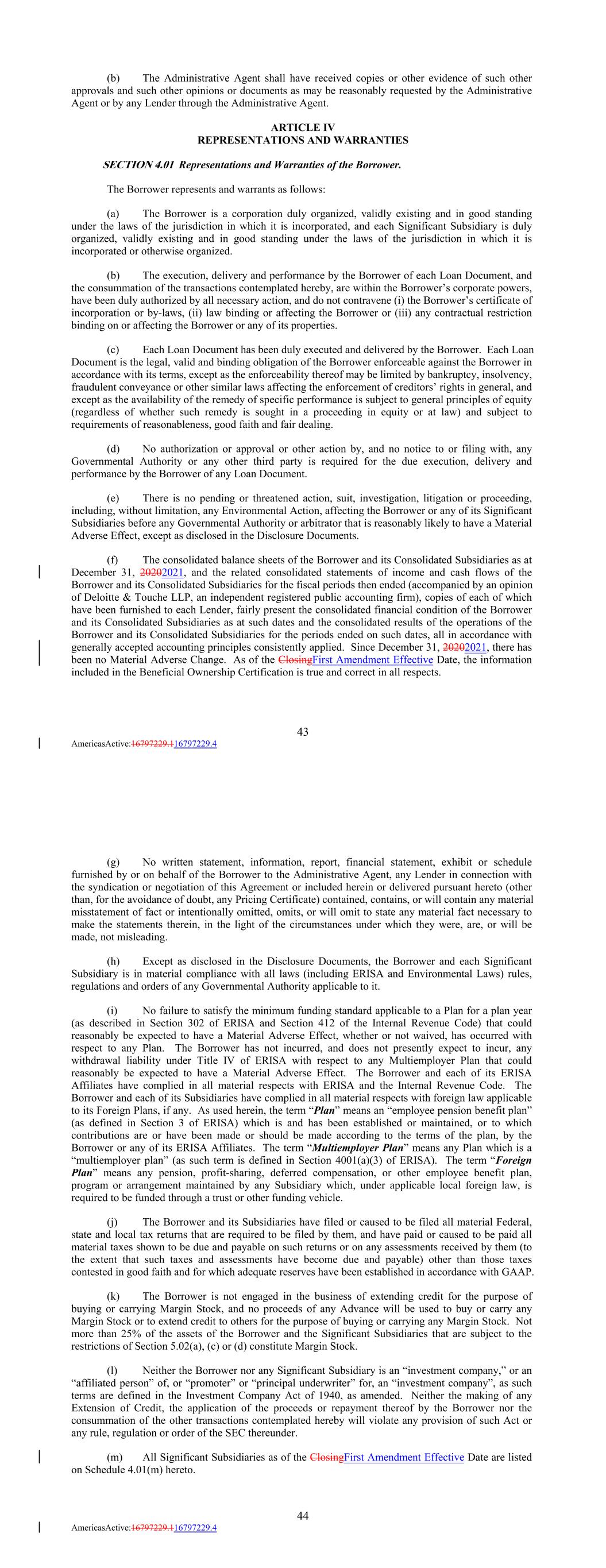 (b) The Administrative Agent shall have received copies or other evidence of such other approvals and such other opinions or documents as may be reasonably requested by the Administrative Agent or by any Lender through the Administrative Agent. ARTICLE IV REPRESENTATIONS AND WARRANTIES SECTION 4.01 Representations and Warranties of the Borrower. The Borrower represents and warrants as follows: (a) The Borrower is a corporation duly organized, validly existing and in good standing under the laws of the jurisdiction in which it is incorporated, and each Significant Subsidiary is duly organized, validly existing and in good standing under the laws of the jurisdiction in which it is incorporated or otherwise organized. (b) The execution, delivery and performance by the Borrower of each Loan Document, and the consummation of the transactions contemplated hereby, are within the Borrower’s corporate powers, have been duly authorized by all necessary action, and do not contravene (i) the Borrower’s certificate of incorporation or by-laws, (ii) law binding or affecting the Borrower or (iii) any contractual restriction binding on or affecting the Borrower or any of its properties. (c) Each Loan Document has been duly executed and delivered by the Borrower. Each Loan Document is the legal, valid and binding obligation of the Borrower enforceable against the Borrower in accordance with its terms, except as the enforceability thereof may be limited by bankruptcy, insolvency, fraudulent conveyance or other similar laws affecting the enforcement of creditors’ rights in general, and except as the availability of the remedy of specific performance is subject to general principles of equity (regardless of whether such remedy is sought in a proceeding in equity or at law) and subject to requirements of reasonableness, good faith and fair dealing. (d) No authorization or approval or other action by, and no notice to or filing with, any Governmental Authority or any other third party is required for the due execution, delivery and performance by the Borrower of any Loan Document. (e) There is no pending or threatened action, suit, investigation, litigation or proceeding, including, without limitation, any Environmental Action, affecting the Borrower or any of its Significant Subsidiaries before any Governmental Authority or arbitrator that is reasonably likely to have a Material Adverse Effect, except as disclosed in the Disclosure Documents. (f) The consolidated balance sheets of the Borrower and its Consolidated Subsidiaries as at December 31, 20202021, and the related consolidated statements of income and cash flows of the Borrower and its Consolidated Subsidiaries for the fiscal periods then ended (accompanied by an opinion of Deloitte & Touche LLP, an independent registered public accounting firm), copies of each of which have been furnished to each Lender, fairly present the consolidated financial condition of the Borrower and its Consolidated Subsidiaries as at such dates and the consolidated results of the operations of the Borrower and its Consolidated Subsidiaries for the periods ended on such dates, all in accordance with generally accepted accounting principles consistently applied. Since December 31, 20202021, there has been no Material Adverse Change. As of the ClosingFirst Amendment Effective Date, the information included in the Beneficial Ownership Certification is true and correct in all respects. 43 AmericasActive:16797229.116797229.4 (g) No written statement, information, report, financial statement, exhibit or schedule furnished by or on behalf of the Borrower to the Administrative Agent, any Lender in connection with the syndication or negotiation of this Agreement or included herein or delivered pursuant hereto (other than, for the avoidance of doubt, any Pricing Certificate) contained, contains, or will contain any material misstatement of fact or intentionally omitted, omits, or will omit to state any material fact necessary to make the statements therein, in the light of the circumstances under which they were, are, or will be made, not misleading. (h) Except as disclosed in the Disclosure Documents, the Borrower and each Significant Subsidiary is in material compliance with all laws (including ERISA and Environmental Laws) rules, regulations and orders of any Governmental Authority applicable to it. (i) No failure to satisfy the minimum funding standard applicable to a Plan for a plan year (as described in Section 302 of ERISA and Section 412 of the Internal Revenue Code) that could reasonably be expected to have a Material Adverse Effect, whether or not waived, has occurred with respect to any Plan. The Borrower has not incurred, and does not presently expect to incur, any withdrawal liability under Title IV of ERISA with respect to any Multiemployer Plan that could reasonably be expected to have a Material Adverse Effect. The Borrower and each of its ERISA Affiliates have complied in all material respects with ERISA and the Internal Revenue Code. The Borrower and each of its Subsidiaries have complied in all material respects with foreign law applicable to its Foreign Plans, if any. As used herein, the term “Plan” means an “employee pension benefit plan” (as defined in Section 3 of ERISA) which is and has been established or maintained, or to which contributions are or have been made or should be made according to the terms of the plan, by the Borrower or any of its ERISA Affiliates. The term “Multiemployer Plan” means any Plan which is a “multiemployer plan” (as such term is defined in Section 4001(a)(3) of ERISA). The term “Foreign Plan” means any pension, profit-sharing, deferred compensation, or other employee benefit plan, program or arrangement maintained by any Subsidiary which, under applicable local foreign law, is required to be funded through a trust or other funding vehicle. (j) The Borrower and its Subsidiaries have filed or caused to be fil