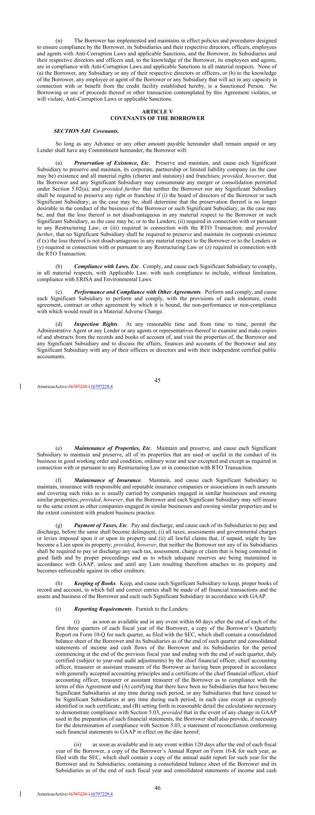 (n) The Borrower has implemented and maintains in effect policies and procedures designed to ensure compliance by the Borrower, its Subsidiaries and their respective directors, officers, employees and agents with Anti-Corruption Laws and applicable Sanctions, and the Borrower, its Subsidiaries and their respective directors and officers and, to the knowledge of the Borrower, its employees and agents, are in compliance with Anti-Corruption Laws and applicable Sanctions in all material respects. None of (a) the Borrower, any Subsidiary or any of their respective directors or officers, or (b) to the knowledge of the Borrower, any employee or agent of the Borrower or any Subsidiary that will act in any capacity in connection with or benefit from the credit facility established hereby, is a Sanctioned Person. No Borrowing or use of proceeds thereof or other transaction contemplated by this Agreement violates, or will violate, Anti-Corruption Laws or applicable Sanctions. ARTICLE V COVENANTS OF THE BORROWER SECTION 5.01 Covenants. So long as any Advance or any other amount payable hereunder shall remain unpaid or any Lender shall have any Commitment hereunder, the Borrower will: (a) Preservation of Existence, Etc. Preserve and maintain, and cause each Significant Subsidiary to preserve and maintain, its corporate, partnership or limited liability company (as the case may be) existence and all material rights (charter and statutory) and franchises; provided, however, that the Borrower and any Significant Subsidiary may consummate any merger or consolidation permitted under Section 5.02(a); and provided further that neither the Borrower nor any Significant Subsidiary shall be required to preserve any right or franchise if (i) the board of directors of the Borrower or such Significant Subsidiary, as the case may be, shall determine that the preservation thereof is no longer desirable in the conduct of the business of the Borrower or such Significant Subsidiary, as the case may be, and that the loss thereof is not disadvantageous in any material respect to the Borrower or such Significant Subsidiary, as the case may be, or to the Lenders; (ii) required in connection with or pursuant to any Restructuring Law; or (iii) required in connection with the RTO Transaction; and provided further, that no Significant Subsidiary shall be required to preserve and maintain its corporate existence if (x) the loss thereof is not disadvantageous in any material respect to the Borrower or to the Lenders or (y) required in connection with or pursuant to any Restructuring Law or (z) required in connection with the RTO Transaction. (b) Compliance with Laws, Etc. Comply, and cause each Significant Subsidiary to comply, in all material respects, with Applicable Law, with such compliance to include, without limitation, compliance with ERISA and Environmental Laws. (c) Performance and Compliance with Other Agreements. Perform and comply, and cause each Significant Subsidiary to perform and comply, with the provisions of each indenture, credit agreement, contract or other agreement by which it is bound, the non-performance or non-compliance with which would result in a Material Adverse Change. (d) Inspection Rights. At any reasonable time and from time to time, permit the Administrative Agent or any Lender or any agents or representatives thereof to examine and make copies of and abstracts from the records and books of account of, and visit the properties of, the Borrower and any Significant Subsidiary and to discuss the affairs, finances and accounts of the Borrower and any Significant Subsidiary with any of their officers or directors and with their independent certified public accountants. 45 AmericasActive:16797229.116797229.4 (e) Maintenance of Properties, Etc. Maintain and preserve, and cause each Significant Subsidiary to maintain and preserve, all of its properties that are used or useful in the conduct of its business in good working order and condition, ordinary wear and tear excepted and except as required in connection with or pursuant to any Restructuring Law or in connection with RTO Transaction. (f) Maintenance of Insurance. Maintain, and cause each Significant Subsidiary to maintain, insurance with responsible and reputable insurance companies or associations in such amounts and covering such risks as is usually carried by companies engaged in similar businesses and owning similar properties; provided, however, that the Borrower and each Significant Subsidiary may self-insure to the same extent as other companies engaged in similar businesses and owning similar properties and to the extent consistent with prudent business practice. (g) Payment of Taxes, Etc. Pay and discharge, and cause each of its Subsidiaries to pay and discharge, before the same shall become delinquent, (i) all taxes, assessments and governmental charges or levies imposed upon it or upon its property and (ii) all lawful claims that, if unpaid, might by law become a Lien upon its property; provided, however, that neither the Borrower nor any of its Subsidiaries shall be required to pay or discharge any such tax, assessment, charge or claim that is being contested in good faith and by proper proceedings and as to which adequate reserves are being maintained in accordance with GAAP, unless and until any Lien resulting therefrom attaches to its property and becomes enforceable against its other creditors. (h) Keeping of Books. Keep, and cause each Significant Subsidiary to keep, proper books of record and account, in which full and correct entries shall be made of all financial transactions and the assets and business of the Borrower and each such Significant Subsidiary in accordance with GAAP. (i) Reporting Requirements. Furnish to the Lenders: (i) as soon as available and in any event within 60 days after the end of each of the first three quarters of each fiscal year of the Borrower, a copy of the Borrower’s Quarterly Report on Form 10-