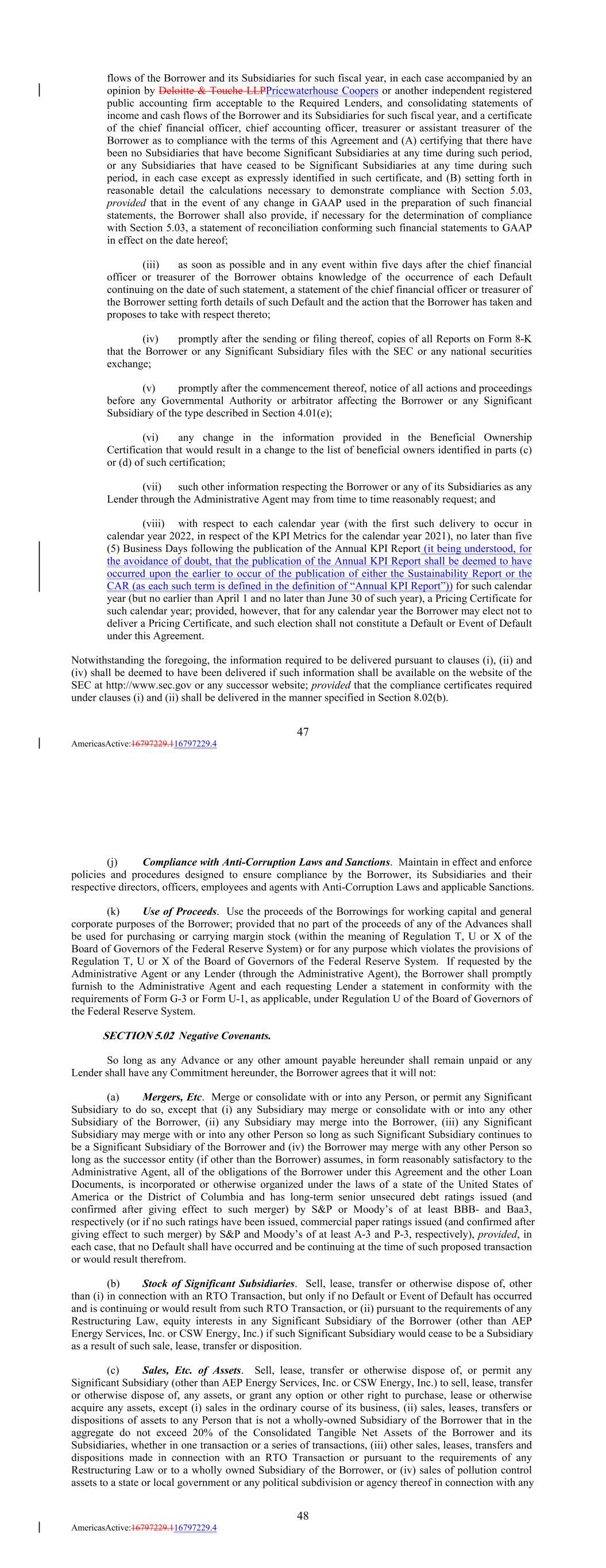 flows of the Borrower and its Subsidiaries for such fiscal year, in each case accompanied by an opinion by Deloitte & Touche LLPPricewaterhouse Coopers or another independent registered public accounting firm acceptable to the Required Lenders, and consolidating statements of income and cash flows of the Borrower and its Subsidiaries for such fiscal year, and a certificate of the chief financial officer, chief accounting officer, treasurer or assistant treasurer of the Borrower as to compliance with the terms of this Agreement and (A) certifying that there have been no Subsidiaries that have become Significant Subsidiaries at any time during such period, or any Subsidiaries that have ceased to be Significant Subsidiaries at any time during such period, in each case except as expressly identified in such certificate, and (B) setting forth in reasonable detail the calculations necessary to demonstrate compliance with Section 5.03, provided that in the event of any change in GAAP used in the preparation of such financial statements, the Borrower shall also provide, if necessary for the determination of compliance with Section 5.03, a statement of reconciliation conforming such financial statements to GAAP in effect on the date hereof; (iii) as soon as possible and in any event within five days after the chief financial officer or treasurer of the Borrower obtains knowledge of the occurrence of each Default continuing on the date of such statement, a statement of the chief financial officer or treasurer of the Borrower setting forth details of such Default and the action that the Borrower has taken and proposes to take with respect thereto; (iv) promptly after the sending or filing thereof, copies of all Reports on Form 8-K that the Borrower or any Significant Subsidiary files with the SEC or any national securities exchange; (v) promptly after the commencement thereof, notice of all actions and proceedings before any Governmental Authority or arbitrator affecting the Borrower or any Significant Subsidiary of the type described in Section 4.01(e); (vi) any change in the information provided in the Beneficial Ownership Certification that would result in a change to the list of beneficial owners identified in parts (c) or (d) of such certification; (vii) such other information respecting the Borrower or any of its Subsidiaries as any Lender through the Administrative Agent may from time to time reasonably request; and (viii) with respect to each calendar year (with the first such delivery to occur in calendar year 2022, in respect of the KPI Metrics for the calendar year 2021), no later than five (5) Business Days following the publication of the Annual KPI Report (it being understood, for the avoidance of doubt, that the publication of the Annual KPI Report shall be deemed to have occurred upon the earlier to occur of the publication of either the Sustainability Report or the CAR (as each such term is defined in the definition of “Annual KPI Report”)) for such calendar year (but no earlier than April 1 and no later than June 30 of such year), a Pricing Certificate for such calendar year; provided, however, that for any calendar year the Borrower may elect not to deliver a Pricing Certificate, and such election shall not constitute a Default or Event of Default under this Agreement. Notwithstanding the foregoing, the information required to be delivered pursuant to clauses (i), (ii) and (iv) shall be deemed to have been delivered if such information shall be available on the website of the SEC at http://www.sec.gov or any successor website; provided that the compliance certificates required under clauses (i) and (ii) shall be delivered in the manner specified in Section 8.02(b). 47 AmericasActive:16797229.116797229.4 (j) Compliance with Anti-Corruption Laws and Sanctions. Maintain in effect and enforce policies and procedures designed to ensure compliance by the Borrower, its Subsidiaries and their respective directors, officers, employees and agents with Anti-Corruption Laws and applicable Sanctions. (k) Use of Proceeds. Use the proceeds of the Borrowings for working capital and general corporate purposes of the Borrower; provided that no part of the proceeds of any of the Advances shall be used for purchasing or carrying margin stock (within the meaning of Regulation T, U or X of the Board of Governors of the Federal Reserve System) or for any purpose which violates the provisions of Regulation T, U or X of the Board of Governors of the Federal Reserve System. If requested by the Administrative Agent or any Lender (through the Administrative Agent), the Borrower shall promptly furnish to the Administrative Agent and each requesting Lender a statement in conformity with the requirements of Form G-3 or Form U-1, as applicable, under Regulation U of the Board of Governors of the Federal Reserve System. SECTION 5.02 Negative Covenants. So long as any Advance or any other amount payable hereunder shall remain unpaid or any Lender shall have any Commitment hereunder, the Borrower agrees that it will not: (a) Mergers, Etc. Merge or consolidate with or into any Person, or permit any Significant Subsidiary to do so, except that (i) any Subsidiary may merge or consolidate with or into any other Subsidiary of the Borrower, (ii) any Subsidiary may merge into the Borrower, (iii) any Significant Subsidiary may merge with or into any other Person so long as such Significant Subsidiary continues to be a Significant Subsidiary of the Borrower and (iv) the Borrower may merge with any other Person so long as the successor entity (if other than the Borrower) assumes, in form reasonably satisfactory to the Administrative Agent, all of the obligations of the Borrower under this Agreement and the other Loan Documents, is incorporated or otherwise organized under the laws of a state of the United States of America or the District of Columbia and has long-term senior unsecured debt ratings issued (and confirmed 