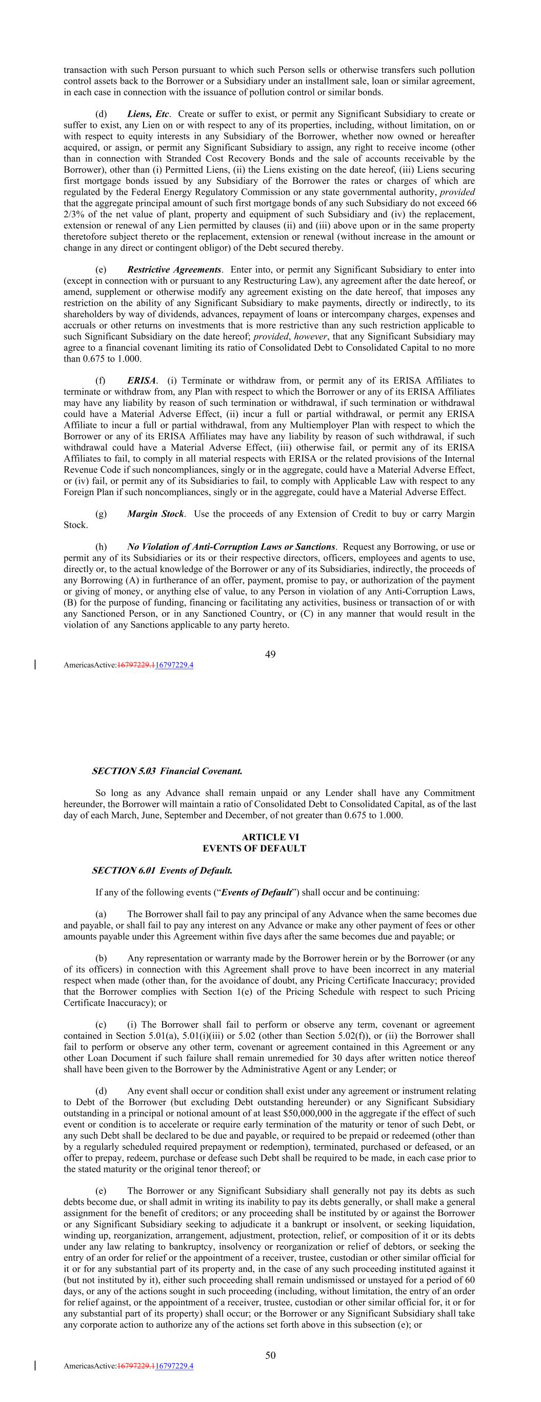 transaction with such Person pursuant to which such Person sells or otherwise transfers such pollution control assets back to the Borrower or a Subsidiary under an installment sale, loan or similar agreement, in each case in connection with the issuance of pollution control or similar bonds. (d) Liens, Etc. Create or suffer to exist, or permit any Significant Subsidiary to create or suffer to exist, any Lien on or with respect to any of its properties, including, without limitation, on or with respect to equity interests in any Subsidiary of the Borrower, whether now owned or hereafter acquired, or assign, or permit any Significant Subsidiary to assign, any right to receive income (other than in connection with Stranded Cost Recovery Bonds and the sale of accounts receivable by the Borrower), other than (i) Permitted Liens, (ii) the Liens existing on the date hereof, (iii) Liens securing first mortgage bonds issued by any Subsidiary of the Borrower the rates or charges of which are regulated by the Federal Energy Regulatory Commission or any state governmental authority, provided that the aggregate principal amount of such first mortgage bonds of any such Subsidiary do not exceed 66 2/3% of the net value of plant, property and equipment of such Subsidiary and (iv) the replacement, extension or renewal of any Lien permitted by clauses (ii) and (iii) above upon or in the same property theretofore subject thereto or the replacement, extension or renewal (without increase in the amount or change in any direct or contingent obligor) of the Debt secured thereby. (e) Restrictive Agreements. Enter into, or permit any Significant Subsidiary to enter into (except in connection with or pursuant to any Restructuring Law), any agreement after the date hereof, or amend, supplement or otherwise modify any agreement existing on the date hereof, that imposes any restriction on the ability of any Significant Subsidiary to make payments, directly or indirectly, to its shareholders by way of dividends, advances, repayment of loans or intercompany charges, expenses and accruals or other returns on investments that is more restrictive than any such restriction applicable to such Significant Subsidiary on the date hereof; provided, however, that any Significant Subsidiary may agree to a financial covenant limiting its ratio of Consolidated Debt to Consolidated Capital to no more than 0.675 to 1.000. (f) ERISA. (i) Terminate or withdraw from, or permit any of its ERISA Affiliates to terminate or withdraw from, any Plan with respect to which the Borrower or any of its ERISA Affiliates may have any liability by reason of such termination or withdrawal, if such termination or withdrawal could have a Material Adverse Effect, (ii) incur a full or partial withdrawal, or permit any ERISA Affiliate to incur a full or partial withdrawal, from any Multiemployer Plan with respect to which the Borrower or any of its ERISA Affiliates may have any liability by reason of such withdrawal, if such withdrawal could have a Material Adverse Effect, (iii) otherwise fail, or permit any of its ERISA Affiliates to fail, to comply in all material respects with ERISA or the related provisions of the Internal Revenue Code if such noncompliances, singly or in the aggregate, could have a Material Adverse Effect, or (iv) fail, or permit any of its Subsidiaries to fail, to comply with Applicable Law with respect to any Foreign Plan if such noncompliances, singly or in the aggregate, could have a Material Adverse Effect. (g) Margin Stock. Use the proceeds of any Extension of Credit to buy or carry Margin Stock. (h) No Violation of Anti-Corruption Laws or Sanctions. Request any Borrowing, or use or permit any of its Subsidiaries or its or their respective directors, officers, employees and agents to use, directly or, to the actual knowledge of the Borrower or any of its Subsidiaries, indirectly, the proceeds of any Borrowing (A) in furtherance of an offer, payment, promise to pay, or authorization of the payment or giving of money, or anything else of value, to any Person in violation of any Anti-Corruption Laws, (B) for the purpose of funding, financing or facilitating any activities, business or transaction of or with any Sanctioned Person, or in any Sanctioned Country, or (C) in any manner that would result in the violation of any Sanctions applicable to any party hereto. 49 AmericasActive:16797229.116797229.4 SECTION 5.03 Financial Covenant. So long as any Advance shall remain unpaid or any Lender shall have any Commitment hereunder, the Borrower will maintain a ratio of Consolidated Debt to Consolidated Capital, as of the last day of each March, June, September and December, of not greater than 0.675 to 1.000. ARTICLE VI EVENTS OF DEFAULT SECTION 6.01 Events of Default. If any of the following events (“Events of Default”) shall occur and be continuing: (a) The Borrower shall fail to pay any principal of any Advance when the same becomes due and payable, or shall fail to pay any interest on any Advance or make any other payment of fees or other amounts payable under this Agreement within five days after the same becomes due and payable; or (b) Any representation or warranty made by the Borrower herein or by the Borrower (or any of its officers) in connection with this Agreement shall prove to have been incorrect in any material respect when made (other than, for the avoidance of doubt, any Pricing Certificate Inaccuracy; provided that the Borrower complies with Section 1(e) of the Pricing Schedule with respect to such Pricing Certificate Inaccuracy); or (c) (i) The Borrower shall fail to perform or observe any term, covenant or agreement contained in Section 5.01(a), 5.01(i)(iii) or 5.02 (other than Section 5.02(f)), or (ii) the Borrower shall fail to perform or observe any other term, covenant or agreement contained in this Agreement or any other Loan Document if such failure shall remain unremedied for 30 days after written notice th