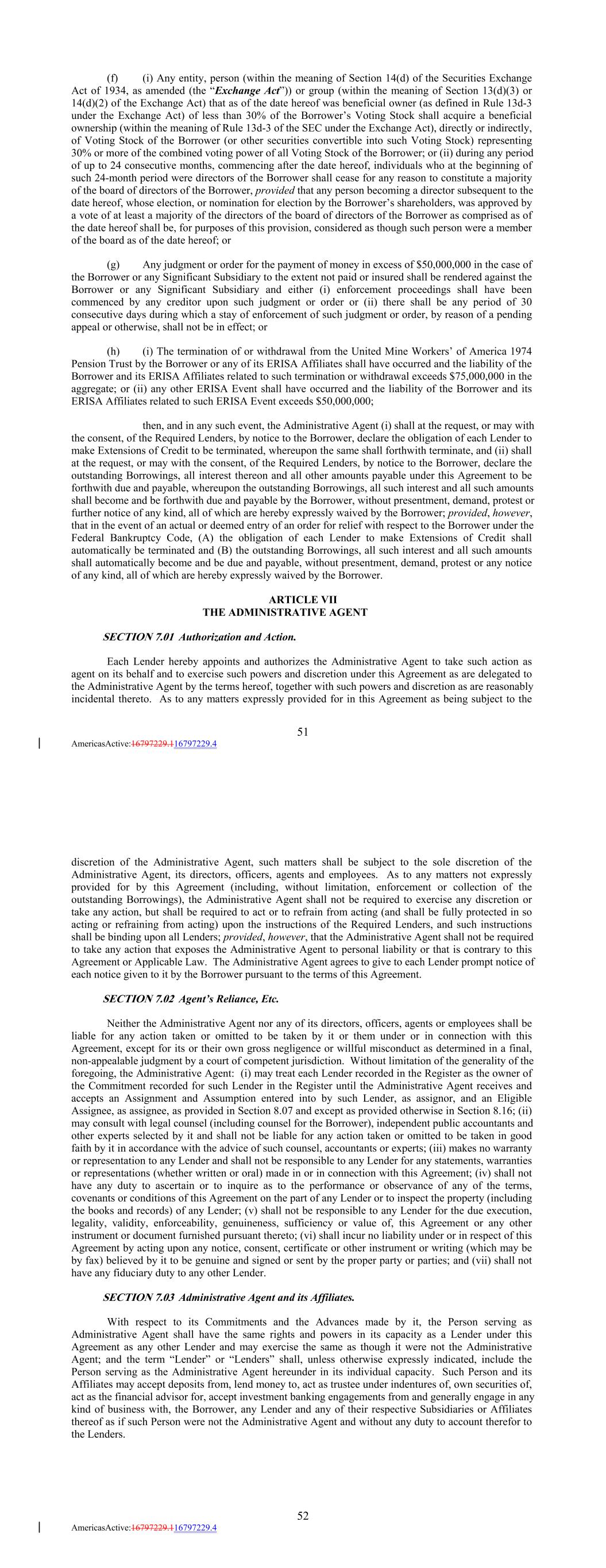 (f) (i) Any entity, person (within the meaning of Section 14(d) of the Securities Exchange Act of 1934, as amended (the “Exchange Act”)) or group (within the meaning of Section 13(d)(3) or 14(d)(2) of the Exchange Act) that as of the date hereof was beneficial owner (as defined in Rule 13d-3 under the Exchange Act) of less than 30% of the Borrower’s Voting Stock shall acquire a beneficial ownership (within the meaning of Rule 13d-3 of the SEC under the Exchange Act), directly or indirectly, of Voting Stock of the Borrower (or other securities convertible into such Voting Stock) representing 30% or more of the combined voting power of all Voting Stock of the Borrower; or (ii) during any period of up to 24 consecutive months, commencing after the date hereof, individuals who at the beginning of such 24-month period were directors of the Borrower shall cease for any reason to constitute a majority of the board of directors of the Borrower, provided that any person becoming a director subsequent to the date hereof, whose election, or nomination for election by the Borrower’s shareholders, was approved by a vote of at least a majority of the directors of the board of directors of the Borrower as comprised as of the date hereof shall be, for purposes of this provision, considered as though such person were a member of the board as of the date hereof; or (g) Any judgment or order for the payment of money in excess of $50,000,000 in the case of the Borrower or any Significant Subsidiary to the extent not paid or insured shall be rendered against the Borrower or any Significant Subsidiary and either (i) enforcement proceedings shall have been commenced by any creditor upon such judgment or order or (ii) there shall be any period of 30 consecutive days during which a stay of enforcement of such judgment or order, by reason of a pending appeal or otherwise, shall not be in effect; or (h) (i) The termination of or withdrawal from the United Mine Workers’ of America 1974 Pension Trust by the Borrower or any of its ERISA Affiliates shall have occurred and the liability of the Borrower and its ERISA Affiliates related to such termination or withdrawal exceeds $75,000,000 in the aggregate; or (ii) any other ERISA Event shall have occurred and the liability of the Borrower and its ERISA Affiliates related to such ERISA Event exceeds $50,000,000; then, and in any such event, the Administrative Agent (i) shall at the request, or may with the consent, of the Required Lenders, by notice to the Borrower, declare the obligation of each Lender to make Extensions of Credit to be terminated, whereupon the same shall forthwith terminate, and (ii) shall at the request, or may with the consent, of the Required Lenders, by notice to the Borrower, declare the outstanding Borrowings, all interest thereon and all other amounts payable under this Agreement to be forthwith due and payable, whereupon the outstanding Borrowings, all such interest and all such amounts shall become and be forthwith due and payable by the Borrower, without presentment, demand, protest or further notice of any kind, all of which are hereby expressly waived by the Borrower; provided, however, that in the event of an actual or deemed entry of an order for relief with respect to the Borrower under the Federal Bankruptcy Code, (A) the obligation of each Lender to make Extensions of Credit shall automatically be terminated and (B) the outstanding Borrowings, all such interest and all such amounts shall automatically become and be due and payable, without presentment, demand, protest or any notice of any kind, all of which are hereby expressly waived by the Borrower. ARTICLE VII THE ADMINISTRATIVE AGENT SECTION 7.01 Authorization and Action. Each Lender hereby appoints and authorizes the Administrative Agent to take such action as agent on its behalf and to exercise such powers and discretion under this Agreement as are delegated to the Administrative Agent by the terms hereof, together with such powers and discretion as are reasonably incidental thereto. As to any matters expressly provided for in this Agreement as being subject to the 51 AmericasActive:16797229.116797229.4 discretion of the Administrative Agent, such matters shall be subject to the sole discretion of the Administrative Agent, its directors, officers, agents and employees. As to any matters not expressly provided for by this Agreement (including, without limitation, enforcement or collection of the outstanding Borrowings), the Administrative Agent shall not be required to exercise any discretion or take any action, but shall be required to act or to refrain from acting (and shall be fully protected in so acting or refraining from acting) upon the instructions of the Required Lenders, and such instructions shall be binding upon all Lenders; provided, however, that the Administrative Agent shall not be required to take any action that exposes the Administrative Agent to personal liability or that is contrary to this Agreement or Applicable Law. The Administrative Agent agrees to give to each Lender prompt notice of each notice given to it by the Borrower pursuant to the terms of this Agreement. SECTION 7.02 Agent’s Reliance, Etc. Neither the Administrative Agent nor any of its directors, officers, agents or employees shall be liable for any action taken or omitted to be taken by it or them under or in connection with this Agreement, except for its or their own gross negligence or willful misconduct as determined in a final, non-appealable judgment by a court of competent jurisdiction. Without limitation of the generality of the foregoing, the Administrative Agent: (i) may treat each Lender recorded in the Register as the owner of the Commitment recorded for such Lender in the Register until the Administrative Agent receives and accepts an Assignment and Assumption entered into by such Lender, as assignor, and an Eligible Assignee, as assignee, as provided in Section 8.07 a