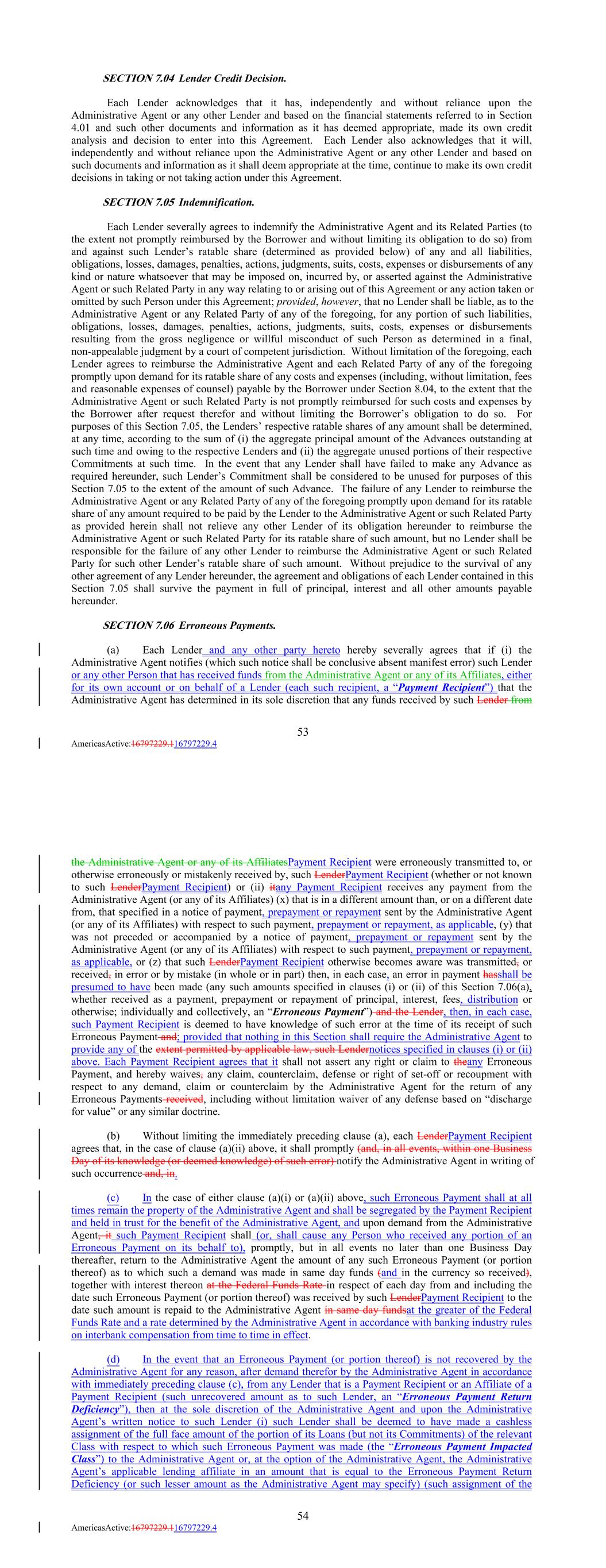 SECTION 7.04 Lender Credit Decision. Each Lender acknowledges that it has, independently and without reliance upon the Administrative Agent or any other Lender and based on the financial statements referred to in Section 4.01 and such other documents and information as it has deemed appropriate, made its own credit analysis and decision to enter into this Agreement. Each Lender also acknowledges that it will, independently and without reliance upon the Administrative Agent or any other Lender and based on such documents and information as it shall deem appropriate at the time, continue to make its own credit decisions in taking or not taking action under this Agreement. SECTION 7.05 Indemnification. Each Lender severally agrees to indemnify the Administrative Agent and its Related Parties (to the extent not promptly reimbursed by the Borrower and without limiting its obligation to do so) from and against such Lender’s ratable share (determined as provided below) of any and all liabilities, obligations, losses, damages, penalties, actions, judgments, suits, costs, expenses or disbursements of any kind or nature whatsoever that may be imposed on, incurred by, or asserted against the Administrative Agent or such Related Party in any way relating to or arising out of this Agreement or any action taken or omitted by such Person under this Agreement; provided, however, that no Lender shall be liable, as to the Administrative Agent or any Related Party of any of the foregoing, for any portion of such liabilities, obligations, losses, damages, penalties, actions, judgments, suits, costs, expenses or disbursements resulting from the gross negligence or willful misconduct of such Person as determined in a final, non-appealable judgment by a court of competent jurisdiction. Without limitation of the foregoing, each Lender agrees to reimburse the Administrative Agent and each Related Party of any of the foregoing promptly upon demand for its ratable share of any costs and expenses (including, without limitation, fees and reasonable expenses of counsel) payable by the Borrower under Section 8.04, to the extent that the Administrative Agent or such Related Party is not promptly reimbursed for such costs and expenses by the Borrower after request therefor and without limiting the Borrower’s obligation to do so. For purposes of this Section 7.05, the Lenders’ respective ratable shares of any amount shall be determined, at any time, according to the sum of (i) the aggregate principal amount of the Advances outstanding at such time and owing to the respective Lenders and (ii) the aggregate unused portions of their respective Commitments at such time. In the event that any Lender shall have failed to make any Advance as required hereunder, such Lender’s Commitment shall be considered to be unused for purposes of this Section 7.05 to the extent of the amount of such Advance. The failure of any Lender to reimburse the Administrative Agent or any Related Party of any of the foregoing promptly upon demand for its ratable share of any amount required to be paid by the Lender to the Administrative Agent or such Related Party as provided herein shall not relieve any other Lender of its obligation hereunder to reimburse the Administrative Agent or such Related Party for its ratable share of such amount, but no Lender shall be responsible for the failure of any other Lender to reimburse the Administrative Agent or such Related Party for such other Lender’s ratable share of such amount. Without prejudice to the survival of any other agreement of any Lender hereunder, the agreement and obligations of each Lender contained in this Section 7.05 shall survive the payment in full of principal, interest and all other amounts payable hereunder. SECTION 7.06 Erroneous Payments. (a) Each Lender and any other party hereto hereby severally agrees that if (i) the Administrative Agent notifies (which such notice shall be conclusive absent manifest error) such Lender or any other Person that has received funds from the Administrative Agent or any of its Affiliates, either for its own account or on behalf of a Lender (each such recipient, a “Payment Recipient”) that the Administrative Agent has determined in its sole discretion that any funds received by such Lender from 53 AmericasActive:16797229.116797229.4 the Administrative Agent or any of its AffiliatesPayment Recipient were erroneously transmitted to, or otherwise erroneously or mistakenly received by, such LenderPayment Recipient (whether or not known to such LenderPayment Recipient) or (ii) itany Payment Recipient receives any payment from the Administrative Agent (or any of its Affiliates) (x) that is in a different amount than, or on a different date from, that specified in a notice of payment, prepayment or repayment sent by the Administrative Agent (or any of its Affiliates) with respect to such payment, prepayment or repayment, as applicable, (y) that was not preceded or accompanied by a notice of payment, prepayment or repayment sent by the Administrative Agent (or any of its Affiliates) with respect to such payment, prepayment or repayment, as applicable, or (z) that such LenderPayment Recipient otherwise becomes aware was transmitted, or received, in error or by mistake (in whole or in part) then, in each case, an error in payment hasshall be presumed to have been made (any such amounts specified in clauses (i) or (ii) of this Section 7.06(a), whether received as a payment, prepayment or repayment of principal, interest, fees, distribution or otherwise; individually and collectively, an “Erroneous Payment”) and the Lender, then, in each case, such Payment Recipient is deemed to have knowledge of such error at the time of its receipt of such Erroneous Payment and; provided that nothing in this Section shall require the Administrative Agent to provide any of the extent permitted by applicable law, such Lendernotices specified in clauses (i) or (ii) 