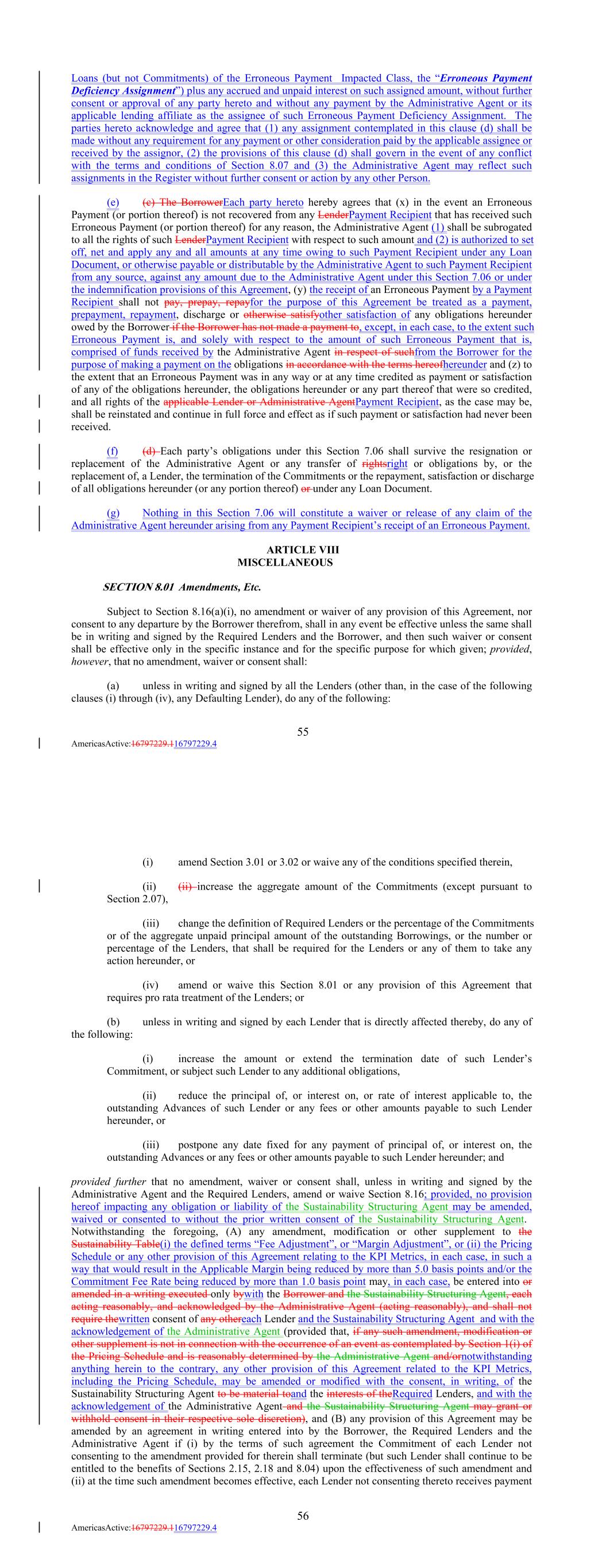 Loans (but not Commitments) of the Erroneous Payment Impacted Class, the “Erroneous Payment Deficiency Assignment”) plus any accrued and unpaid interest on such assigned amount, without further consent or approval of any party hereto and without any payment by the Administrative Agent or its applicable lending affiliate as the assignee of such Erroneous Payment Deficiency Assignment. The parties hereto acknowledge and agree that (1) any assignment contemplated in this clause (d) shall be made without any requirement for any payment or other consideration paid by the applicable assignee or received by the assignor, (2) the provisions of this clause (d) shall govern in the event of any conflict with the terms and conditions of Section 8.07 and (3) the Administrative Agent may reflect such assignments in the Register without further consent or action by any other Person. (e) (c) The BorrowerEach party hereto hereby agrees that (x) in the event an Erroneous Payment (or portion thereof) is not recovered from any LenderPayment Recipient that has received such Erroneous Payment (or portion thereof) for any reason, the Administrative Agent (1) shall be subrogated to all the rights of such LenderPayment Recipient with respect to such amount and (2) is authorized to set off, net and apply any and all amounts at any time owing to such Payment Recipient under any Loan Document, or otherwise payable or distributable by the Administrative Agent to such Payment Recipient from any source, against any amount due to the Administrative Agent under this Section 7.06 or under the indemnification provisions of this Agreement, (y) the receipt of an Erroneous Payment by a Payment Recipient shall not pay, prepay, repayfor the purpose of this Agreement be treated as a payment, prepayment, repayment, discharge or otherwise satisfyother satisfaction of any obligations hereunder owed by the Borrower if the Borrower has not made a payment to, except, in each case, to the extent such Erroneous Payment is, and solely with respect to the amount of such Erroneous Payment that is, comprised of funds received by the Administrative Agent in respect of suchfrom the Borrower for the purpose of making a payment on the obligations in accordance with the terms hereofhereunder and (z) to the extent that an Erroneous Payment was in any way or at any time credited as payment or satisfaction of any of the obligations hereunder, the obligations hereunder or any part thereof that were so credited, and all rights of the applicable Lender or Administrative AgentPayment Recipient, as the case may be, shall be reinstated and continue in full force and effect as if such payment or satisfaction had never been received. (f) (d) Each party’s obligations under this Section 7.06 shall survive the resignation or replacement of the Administrative Agent or any transfer of rightsright or obligations by, or the replacement of, a Lender, the termination of the Commitments or the repayment, satisfaction or discharge of all obligations hereunder (or any portion thereof) or under any Loan Document. (g) Nothing in this Section 7.06 will constitute a waiver or release of any claim of the Administrative Agent hereunder arising from any Payment Recipient’s receipt of an Erroneous Payment. ARTICLE VIII MISCELLANEOUS SECTION 8.01 Amendments, Etc. Subject to Section 8.16(a)(i), no amendment or waiver of any provision of this Agreement, nor consent to any departure by the Borrower therefrom, shall in any event be effective unless the same shall be in writing and signed by the Required Lenders and the Borrower, and then such waiver or consent shall be effective only in the specific instance and for the specific purpose for which given; provided, however, that no amendment, waiver or consent shall: (a) unless in writing and signed by all the Lenders (other than, in the case of the following clauses (i) through (iv), any Defaulting Lender), do any of the following: 55 AmericasActive:16797229.116797229.4 (i) amend Section 3.01 or 3.02 or waive any of the conditions specified therein, (ii) (ii) increase the aggregate amount of the Commitments (except pursuant to Section 2.07), (iii) change the definition of Required Lenders or the percentage of the Commitments or of the aggregate unpaid principal amount of the outstanding Borrowings, or the number or percentage of the Lenders, that shall be required for the Lenders or any of them to take any action hereunder, or (iv) amend or waive this Section 8.01 or any provision of this Agreement that requires pro rata treatment of the Lenders; or (b) unless in writing and signed by each Lender that is directly affected thereby, do any of the following: (i) increase the amount or extend the termination date of such Lender’s Commitment, or subject such Lender to any additional obligations, (ii) reduce the principal of, or interest on, or rate of interest applicable to, the outstanding Advances of such Lender or any fees or other amounts payable to such Lender hereunder, or (iii) postpone any date fixed for any payment of principal of, or interest on, the outstanding Advances or any fees or other amounts payable to such Lender hereunder; and provided further that no amendment, waiver or consent shall, unless in writing and signed by the Administrative Agent and the Required Lenders, amend or waive Section 8.16; provided, no provision hereof impacting any obligation or liability of the Sustainability Structuring Agent may be amended, waived or consented to without the prior written consent of the Sustainability Structuring Agent. Notwithstanding the foregoing, (A) any amendment, modification or other supplement to the Sustainability Table(i) the defined terms “Fee Adjustment”, or “Margin Adjustment”, or (ii) the Pricing Schedule or any other provision of this Agreement relating to the KPI Metrics, in each case, in such a way that would result in the Applicable Margin being reduced by more than 5.0 basis points and