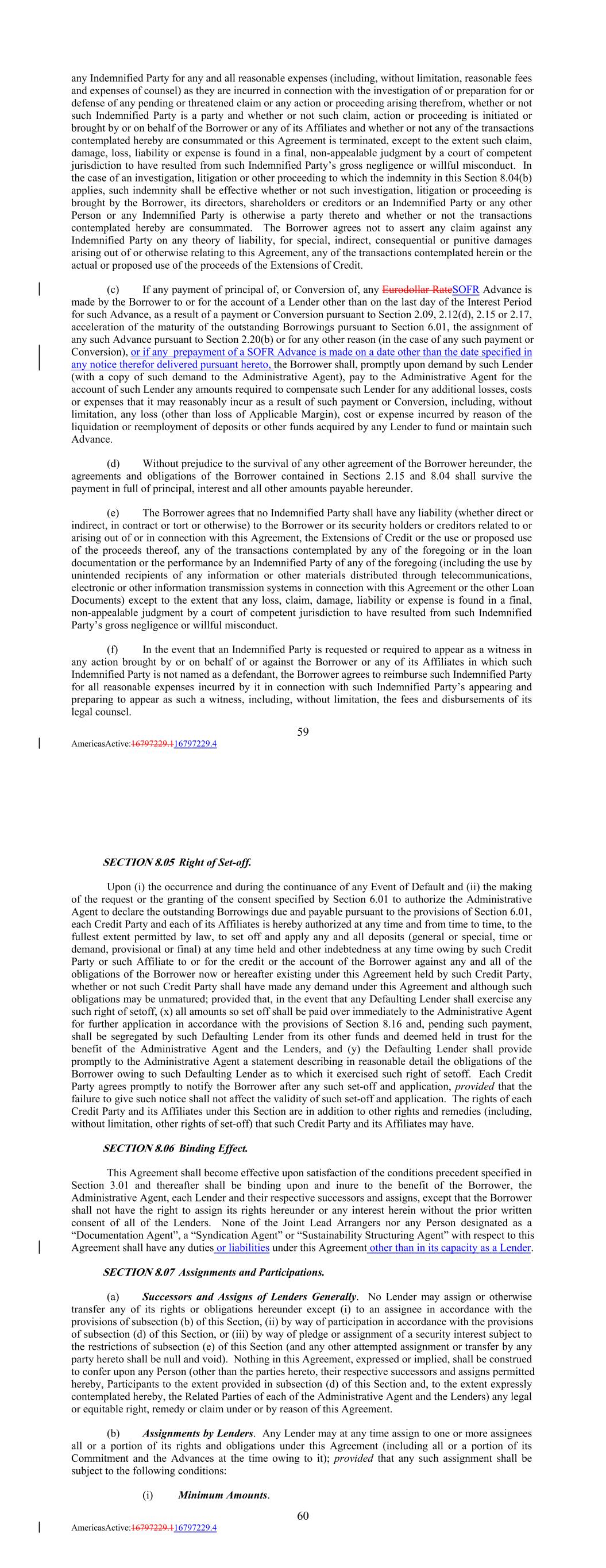 any Indemnified Party for any and all reasonable expenses (including, without limitation, reasonable fees and expenses of counsel) as they are incurred in connection with the investigation of or preparation for or defense of any pending or threatened claim or any action or proceeding arising therefrom, whether or not such Indemnified Party is a party and whether or not such claim, action or proceeding is initiated or brought by or on behalf of the Borrower or any of its Affiliates and whether or not any of the transactions contemplated hereby are consummated or this Agreement is terminated, except to the extent such claim, damage, loss, liability or expense is found in a final, non-appealable judgment by a court of competent jurisdiction to have resulted from such Indemnified Party’s gross negligence or willful misconduct. In the case of an investigation, litigation or other proceeding to which the indemnity in this Section 8.04(b) applies, such indemnity shall be effective whether or not such investigation, litigation or proceeding is brought by the Borrower, its directors, shareholders or creditors or an Indemnified Party or any other Person or any Indemnified Party is otherwise a party thereto and whether or not the transactions contemplated hereby are consummated. The Borrower agrees not to assert any claim against any Indemnified Party on any theory of liability, for special, indirect, consequential or punitive damages arising out of or otherwise relating to this Agreement, any of the transactions contemplated herein or the actual or proposed use of the proceeds of the Extensions of Credit. (c) If any payment of principal of, or Conversion of, any Eurodollar RateSOFR Advance is made by the Borrower to or for the account of a Lender other than on the last day of the Interest Period for such Advance, as a result of a payment or Conversion pursuant to Section 2.09, 2.12(d), 2.15 or 2.17, acceleration of the maturity of the outstanding Borrowings pursuant to Section 6.01, the assignment of any such Advance pursuant to Section 2.20(b) or for any other reason (in the case of any such payment or Conversion), or if any prepayment of a SOFR Advance is made on a date other than the date specified in any notice therefor delivered pursuant hereto, the Borrower shall, promptly upon demand by such Lender (with a copy of such demand to the Administrative Agent), pay to the Administrative Agent for the account of such Lender any amounts required to compensate such Lender for any additional losses, costs or expenses that it may reasonably incur as a result of such payment or Conversion, including, without limitation, any loss (other than loss of Applicable Margin), cost or expense incurred by reason of the liquidation or reemployment of deposits or other funds acquired by any Lender to fund or maintain such Advance. (d) Without prejudice to the survival of any other agreement of the Borrower hereunder, the agreements and obligations of the Borrower contained in Sections 2.15 and 8.04 shall survive the payment in full of principal, interest and all other amounts payable hereunder. (e) The Borrower agrees that no Indemnified Party shall have any liability (whether direct or indirect, in contract or tort or otherwise) to the Borrower or its security holders or creditors related to or arising out of or in connection with this Agreement, the Extensions of Credit or the use or proposed use of the proceeds thereof, any of the transactions contemplated by any of the foregoing or in the loan documentation or the performance by an Indemnified Party of any of the foregoing (including the use by unintended recipients of any information or other materials distributed through telecommunications, electronic or other information transmission systems in connection with this Agreement or the other Loan Documents) except to the extent that any loss, claim, damage, liability or expense is found in a final, non-appealable judgment by a court of competent jurisdiction to have resulted from such Indemnified Party’s gross negligence or willful misconduct. (f) In the event that an Indemnified Party is requested or required to appear as a witness in any action brought by or on behalf of or against the Borrower or any of its Affiliates in which such Indemnified Party is not named as a defendant, the Borrower agrees to reimburse such Indemnified Party for all reasonable expenses incurred by it in connection with such Indemnified Party’s appearing and preparing to appear as such a witness, including, without limitation, the fees and disbursements of its legal counsel. 59 AmericasActive:16797229.116797229.4 SECTION 8.05 Right of Set-off. Upon (i) the occurrence and during the continuance of any Event of Default and (ii) the making of the request or the granting of the consent specified by Section 6.01 to authorize the Administrative Agent to declare the outstanding Borrowings due and payable pursuant to the provisions of Section 6.01, each Credit Party and each of its Affiliates is hereby authorized at any time and from time to time, to the fullest extent permitted by law, to set off and apply any and all deposits (general or special, time or demand, provisional or final) at any time held and other indebtedness at any time owing by such Credit Party or such Affiliate to or for the credit or the account of the Borrower against any and all of the obligations of the Borrower now or hereafter existing under this Agreement held by such Credit Party, whether or not such Credit Party shall have made any demand under this Agreement and although such obligations may be unmatured; provided that, in the event that any Defaulting Lender shall exercise any such right of setoff, (x) all amounts so set off shall be paid over immediately to the Administrative Agent for further application in accordance with the provisions of Section 8.16 and, pending such payment, shall be segregated by such Defaulting Lender from its other funds and deem
