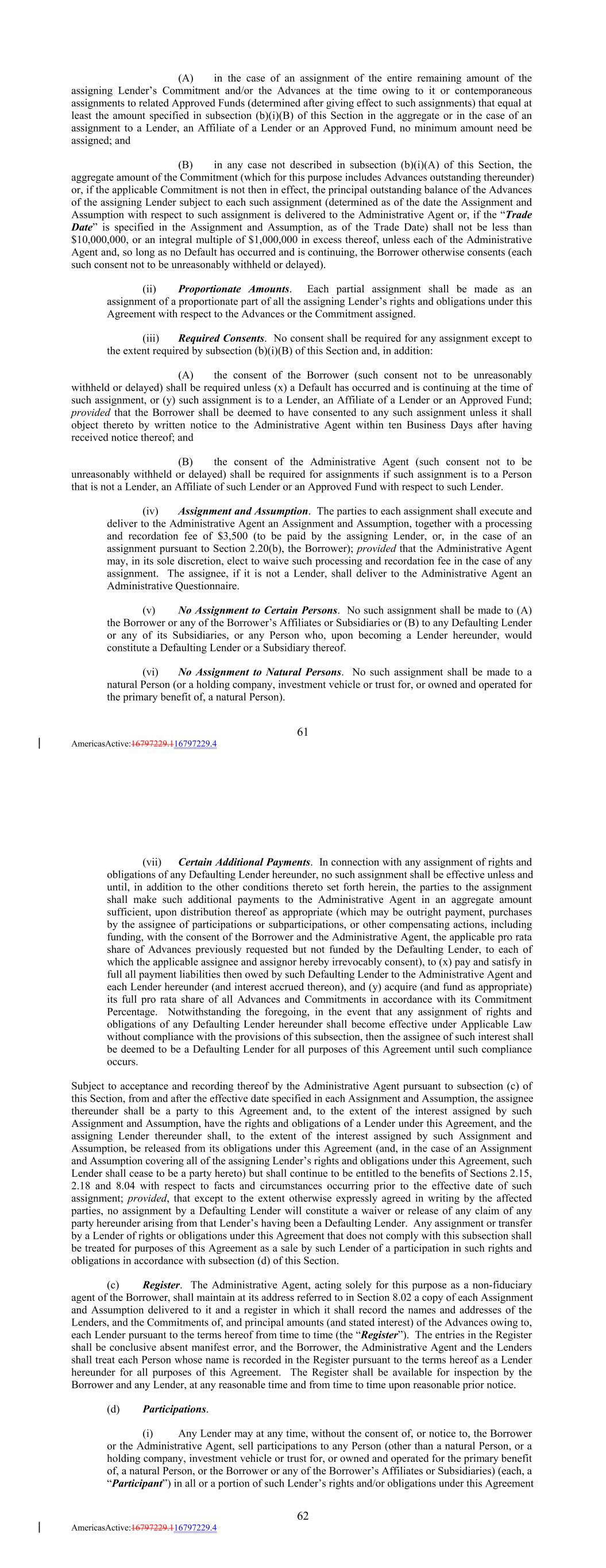 (A) in the case of an assignment of the entire remaining amount of the assigning Lender’s Commitment and/or the Advances at the time owing to it or contemporaneous assignments to related Approved Funds (determined after giving effect to such assignments) that equal at least the amount specified in subsection (b)(i)(B) of this Section in the aggregate or in the case of an assignment to a Lender, an Affiliate of a Lender or an Approved Fund, no minimum amount need be assigned; and (B) in any case not described in subsection (b)(i)(A) of this Section, the aggregate amount of the Commitment (which for this purpose includes Advances outstanding thereunder) or, if the applicable Commitment is not then in effect, the principal outstanding balance of the Advances of the assigning Lender subject to each such assignment (determined as of the date the Assignment and Assumption with respect to such assignment is delivered to the Administrative Agent or, if the “Trade Date” is specified in the Assignment and Assumption, as of the Trade Date) shall not be less than $10,000,000, or an integral multiple of $1,000,000 in excess thereof, unless each of the Administrative Agent and, so long as no Default has occurred and is continuing, the Borrower otherwise consents (each such consent not to be unreasonably withheld or delayed). (ii) Proportionate Amounts. Each partial assignment shall be made as an assignment of a proportionate part of all the assigning Lender’s rights and obligations under this Agreement with respect to the Advances or the Commitment assigned. (iii) Required Consents. No consent shall be required for any assignment except to the extent required by subsection (b)(i)(B) of this Section and, in addition: (A) the consent of the Borrower (such consent not to be unreasonably withheld or delayed) shall be required unless (x) a Default has occurred and is continuing at the time of such assignment, or (y) such assignment is to a Lender, an Affiliate of a Lender or an Approved Fund; provided that the Borrower shall be deemed to have consented to any such assignment unless it shall object thereto by written notice to the Administrative Agent within ten Business Days after having received notice thereof; and (B) the consent of the Administrative Agent (such consent not to be unreasonably withheld or delayed) shall be required for assignments if such assignment is to a Person that is not a Lender, an Affiliate of such Lender or an Approved Fund with respect to such Lender. (iv) Assignment and Assumption. The parties to each assignment shall execute and deliver to the Administrative Agent an Assignment and Assumption, together with a processing and recordation fee of $3,500 (to be paid by the assigning Lender, or, in the case of an assignment pursuant to Section 2.20(b), the Borrower); provided that the Administrative Agent may, in its sole discretion, elect to waive such processing and recordation fee in the case of any assignment. The assignee, if it is not a Lender, shall deliver to the Administrative Agent an Administrative Questionnaire. (v) No Assignment to Certain Persons. No such assignment shall be made to (A) the Borrower or any of the Borrower’s Affiliates or Subsidiaries or (B) to any Defaulting Lender or any of its Subsidiaries, or any Person who, upon becoming a Lender hereunder, would constitute a Defaulting Lender or a Subsidiary thereof. (vi) No Assignment to Natural Persons. No such assignment shall be made to a natural Person (or a holding company, investment vehicle or trust for, or owned and operated for the primary benefit of, a natural Person). 61 AmericasActive:16797229.116797229.4 (vii) Certain Additional Payments. In connection with any assignment of rights and obligations of any Defaulting Lender hereunder, no such assignment shall be effective unless and until, in addition to the other conditions thereto set forth herein, the parties to the assignment shall make such additional payments to the Administrative Agent in an aggregate amount sufficient, upon distribution thereof as appropriate (which may be outright payment, purchases by the assignee of participations or subparticipations, or other compensating actions, including funding, with the consent of the Borrower and the Administrative Agent, the applicable pro rata share of Advances previously requested but not funded by the Defaulting Lender, to each of which the applicable assignee and assignor hereby irrevocably consent), to (x) pay and satisfy in full all payment liabilities then owed by such Defaulting Lender to the Administrative Agent and each Lender hereunder (and interest accrued thereon), and (y) acquire (and fund as appropriate) its full pro rata share of all Advances and Commitments in accordance with its Commitment Percentage. Notwithstanding the foregoing, in the event that any assignment of rights and obligations of any Defaulting Lender hereunder shall become effective under Applicable Law without compliance with the provisions of this subsection, then the assignee of such interest shall be deemed to be a Defaulting Lender for all purposes of this Agreement until such compliance occurs. Subject to acceptance and recording thereof by the Administrative Agent pursuant to subsection (c) of this Section, from and after the effective date specified in each Assignment and Assumption, the assignee thereunder shall be a party to this Agreement and, to the extent of the interest assigned by such Assignment and Assumption, have the rights and obligations of a Lender under this Agreement, and the assigning Lender thereunder shall, to the extent of the interest assigned by such Assignment and Assumption, be released from its obligations under this Agreement (and, in the case of an Assignment and Assumption covering all of the assigning Lender’s rights and obligations under this Agreement, such Lender shall cease to be a party hereto) but shall continue to be entitled to the benefits of Sections 2.15, 2.