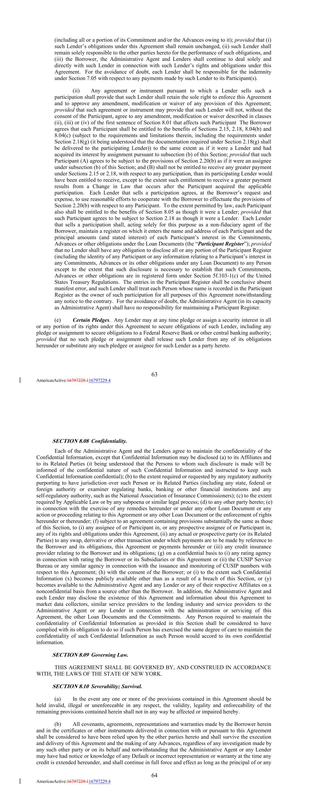 (including all or a portion of its Commitment and/or the Advances owing to it); provided that (i) such Lender’s obligations under this Agreement shall remain unchanged, (ii) such Lender shall remain solely responsible to the other parties hereto for the performance of such obligations, and (iii) the Borrower, the Administrative Agent and Lenders shall continue to deal solely and directly with such Lender in connection with such Lender’s rights and obligations under this Agreement. For the avoidance of doubt, each Lender shall be responsible for the indemnity under Section 7.05 with respect to any payments made by such Lender to its Participant(s). (ii) Any agreement or instrument pursuant to which a Lender sells such a participation shall provide that such Lender shall retain the sole right to enforce this Agreement and to approve any amendment, modification or waiver of any provision of this Agreement; provided that such agreement or instrument may provide that such Lender will not, without the consent of the Participant, agree to any amendment, modification or waiver described in clauses (ii), (iii) or (iv) of the first sentence of Section 8.01 that affects such Participant The Borrower agrees that each Participant shall be entitled to the benefits of Sections 2.15, 2.18, 8.04(b) and 8.04(c) (subject to the requirements and limitations therein, including the requirements under Section 2.18(g) (it being understood that the documentation required under Section 2.18(g) shall be delivered to the participating Lender)) to the same extent as if it were a Lender and had acquired its interest by assignment pursuant to subsection (b) of this Section; provided that such Participant (A) agrees to be subject to the provisions of Section 2.20(b) as if it were an assignee under subsection (b) of this Section; and (B) shall not be entitled to receive any greater payment under Sections 2.15 or 2.18, with respect to any participation, than its participating Lender would have been entitled to receive, except to the extent such entitlement to receive a greater payment results from a Change in Law that occurs after the Participant acquired the applicable participation. Each Lender that sells a participation agrees, at the Borrower’s request and expense, to use reasonable efforts to cooperate with the Borrower to effectuate the provisions of Section 2.20(b) with respect to any Participant. To the extent permitted by law, each Participant also shall be entitled to the benefits of Section 8.05 as though it were a Lender; provided that such Participant agrees to be subject to Section 2.18 as though it were a Lender. Each Lender that sells a participation shall, acting solely for this purpose as a non-fiduciary agent of the Borrower, maintain a register on which it enters the name and address of each Participant and the principal amounts (and stated interest) of each Participant’s interest in the Commitments, Advances or other obligations under the Loan Documents (the “Participant Register”); provided that no Lender shall have any obligation to disclose all or any portion of the Participant Register (including the identity of any Participant or any information relating to a Participant’s interest in any Commitments, Advances or its other obligations under any Loan Document) to any Person except to the extent that such disclosure is necessary to establish that such Commitments, Advances or other obligations are in registered form under Section 5f.103-1(c) of the United States Treasury Regulations. The entries in the Participant Register shall be conclusive absent manifest error, and such Lender shall treat each Person whose name is recorded in the Participant Register as the owner of such participation for all purposes of this Agreement notwithstanding any notice to the contrary. For the avoidance of doubt, the Administrative Agent (in its capacity as Administrative Agent) shall have no responsibility for maintaining a Participant Register. (e) Certain Pledges. Any Lender may at any time pledge or assign a security interest in all or any portion of its rights under this Agreement to secure obligations of such Lender, including any pledge or assignment to secure obligations to a Federal Reserve Bank or other central banking authority; provided that no such pledge or assignment shall release such Lender from any of its obligations hereunder or substitute any such pledgee or assignee for such Lender as a party hereto. 63 AmericasActive:16797229.116797229.4 SECTION 8.08 Confidentiality. Each of the Administrative Agent and the Lenders agree to maintain the confidentiality of the Confidential Information, except that Confidential Information may be disclosed (a) to its Affiliates and to its Related Parties (it being understood that the Persons to whom such disclosure is made will be informed of the confidential nature of such Confidential Information and instructed to keep such Confidential Information confidential); (b) to the extent required or requested by any regulatory authority purporting to have jurisdiction over such Person or its Related Parties (including any state, federal or foreign authority or examiner regulating banks, banking or other financial institutions and any self-regulatory authority, such as the National Association of Insurance Commissioners); (c) to the extent required by Applicable Law or by any subpoena or similar legal process; (d) to any other party hereto; (e) in connection with the exercise of any remedies hereunder or under any other Loan Document or any action or proceeding relating to this Agreement or any other Loan Document or the enforcement of rights hereunder or thereunder; (f) subject to an agreement containing provisions substantially the same as those of this Section, to (i) any assignee of or Participant in, or any prospective assignee of or Participant in, any of its rights and obligations under this Agreement, (ii) any actual or prospective party (or its Re